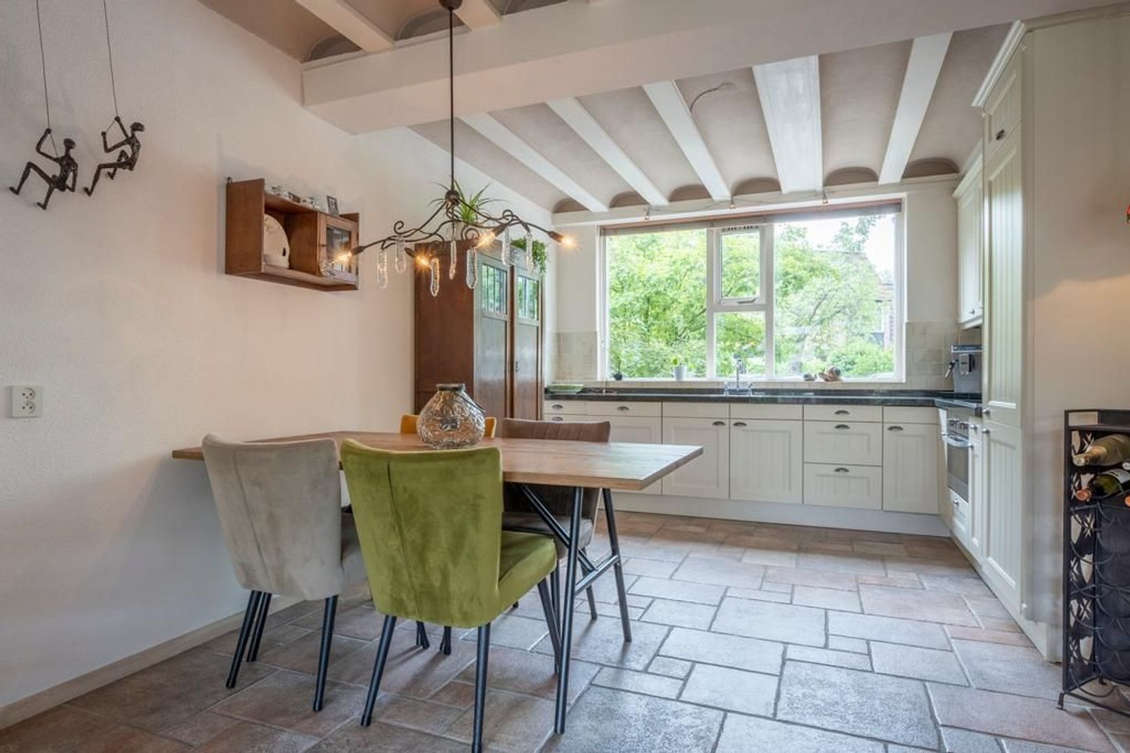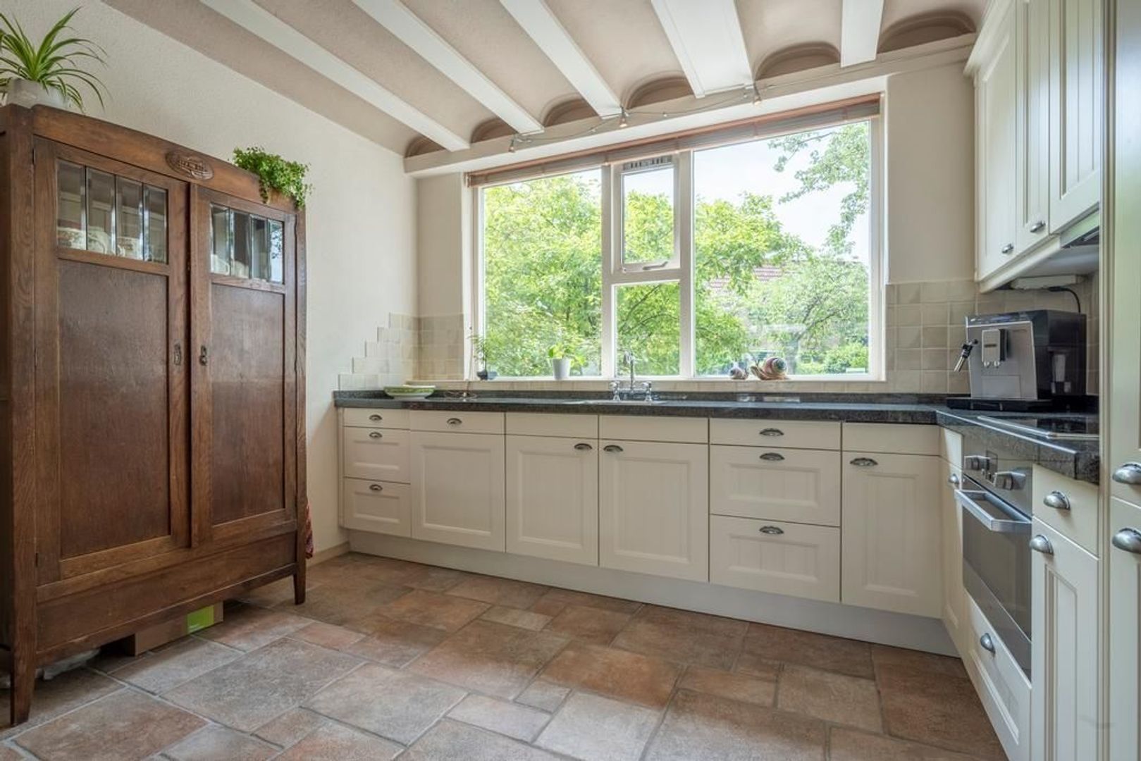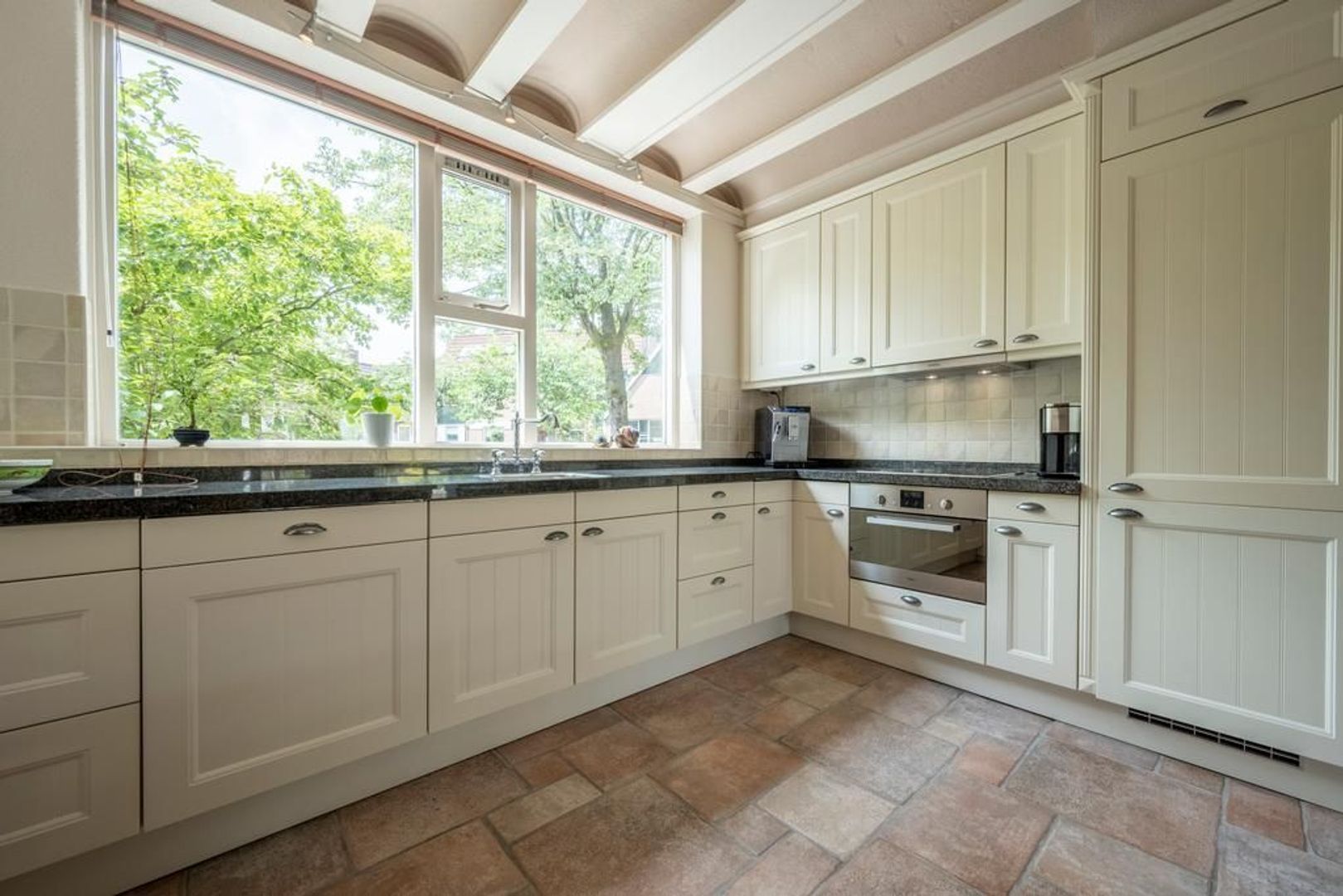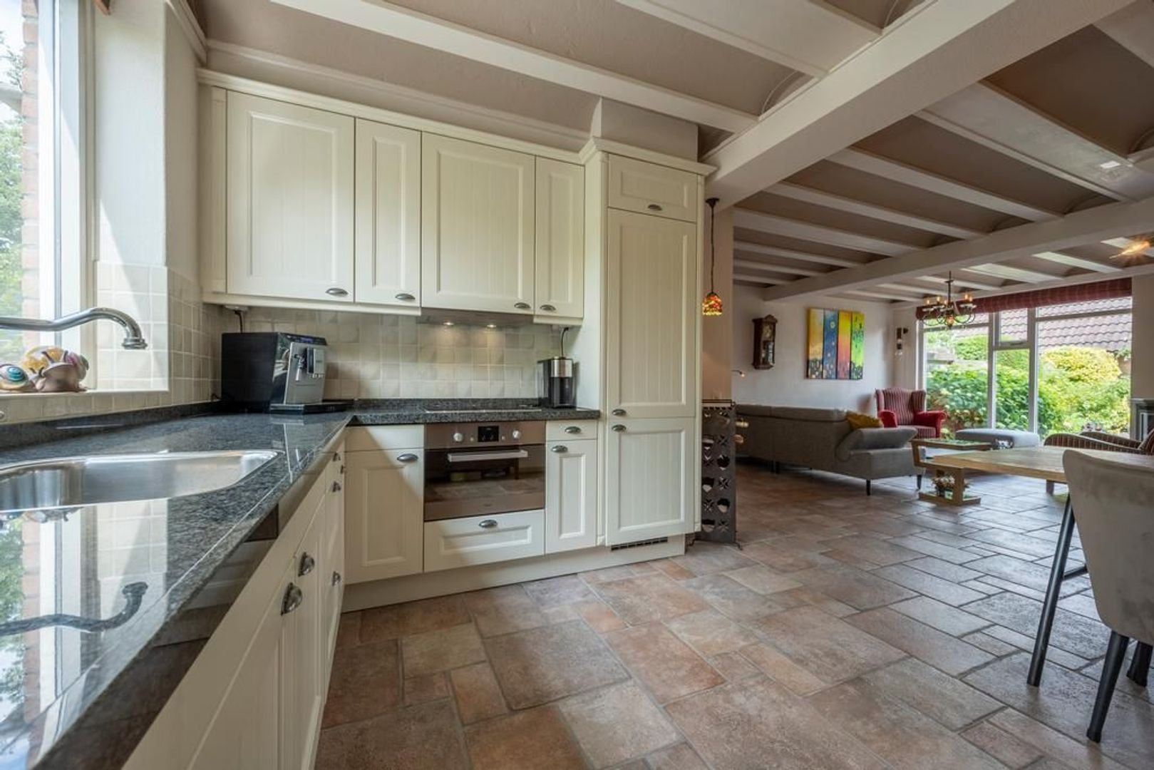 De open keuken ligt aan de straatkant en heeft een landelijke inrichting. Deze is voorzien van een granieten aanrechtblad, afzuigkap, vaatwasser, combi-magnetron, keramische kookplaat en koel-vriescombinatie.
