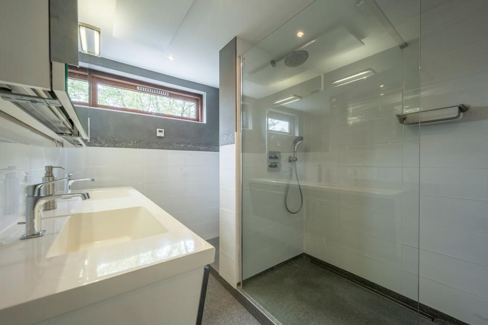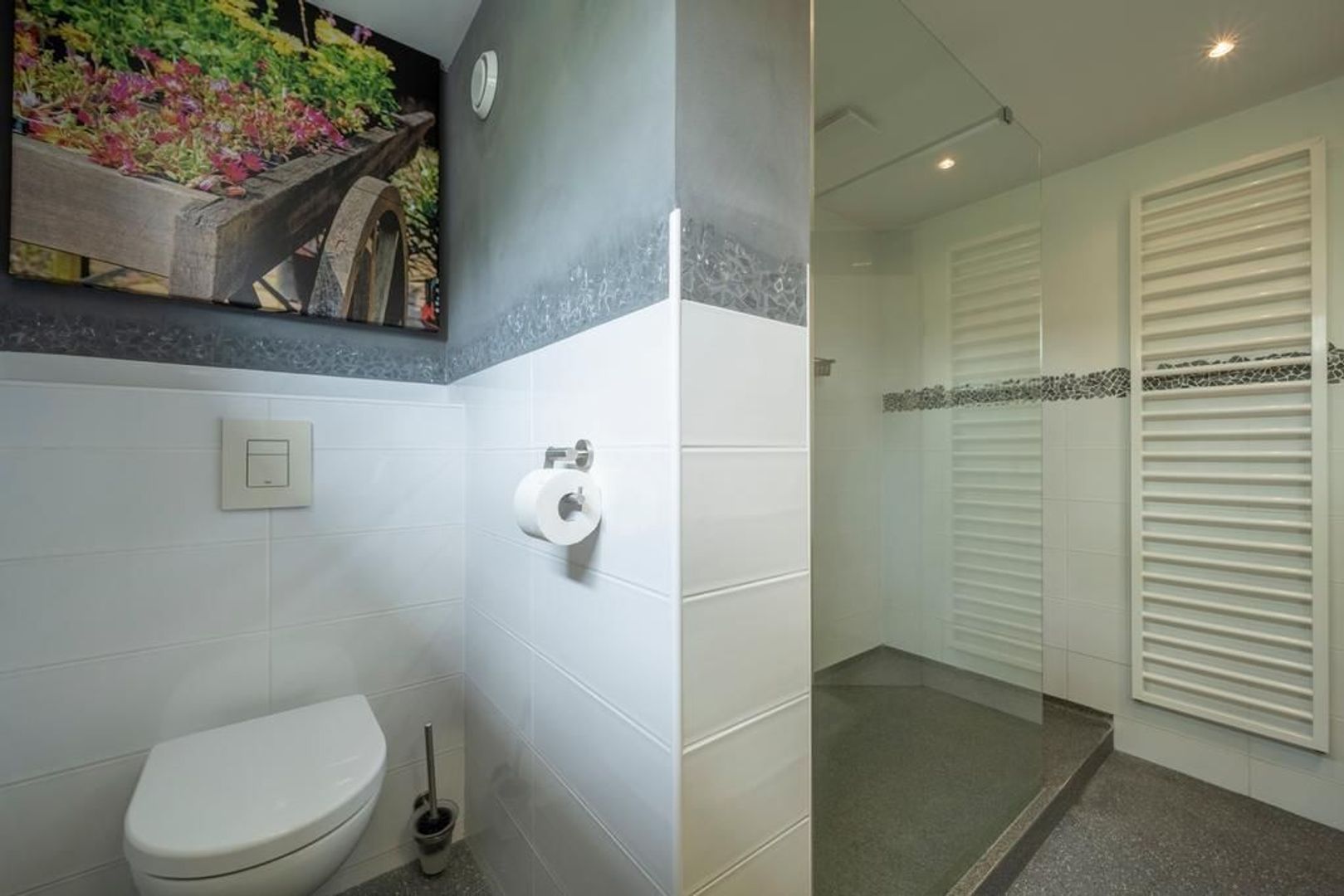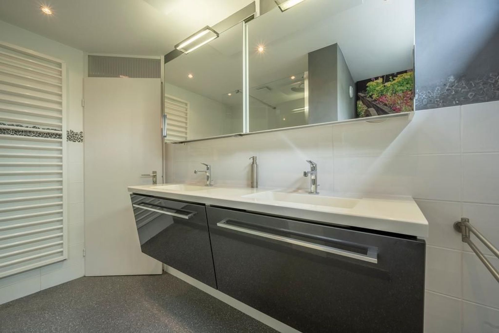 De badkamer is netjes en beschikt over een inloopdouche met infrarood paneel, een wandcloset, wastafelmeubel en een raam.
