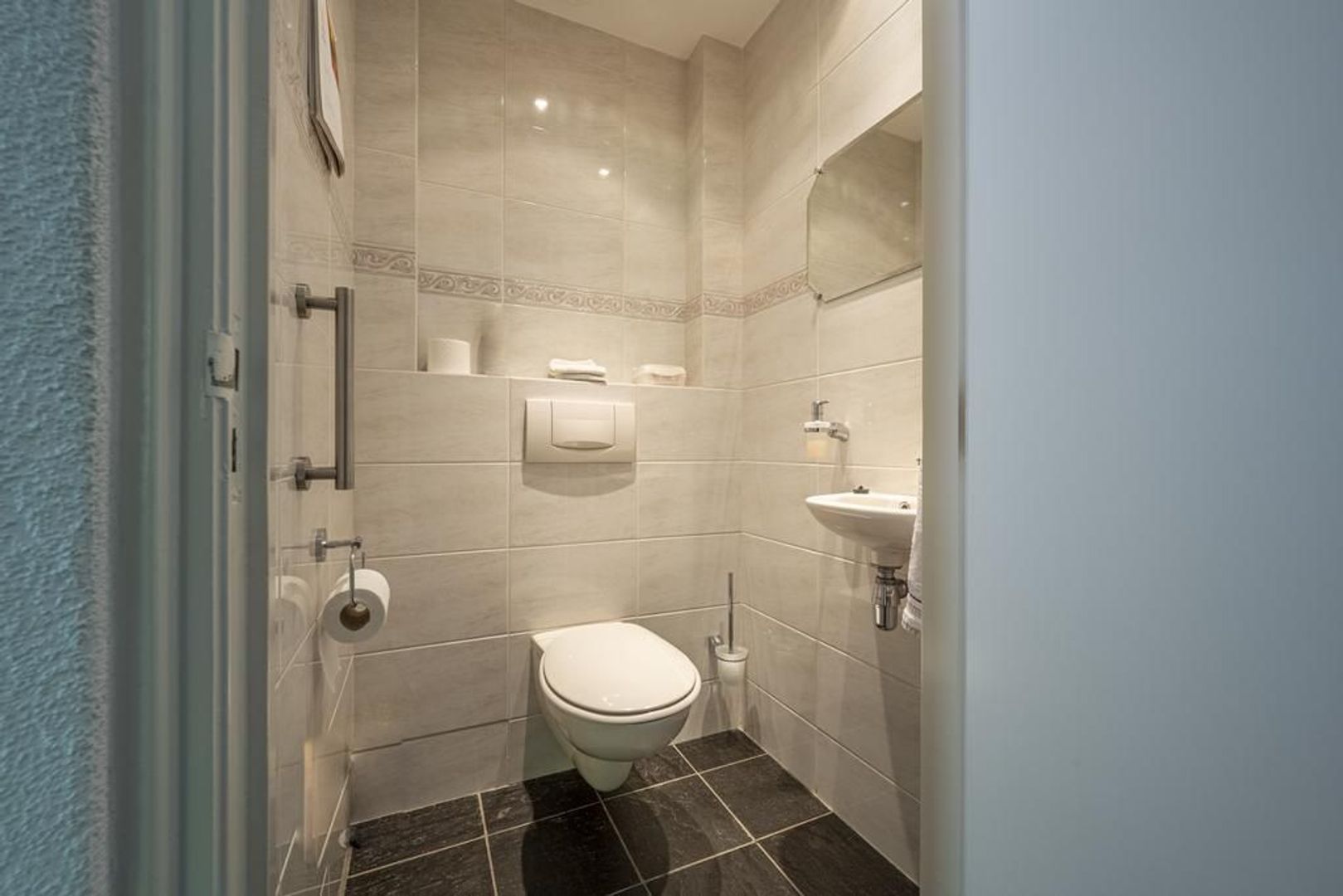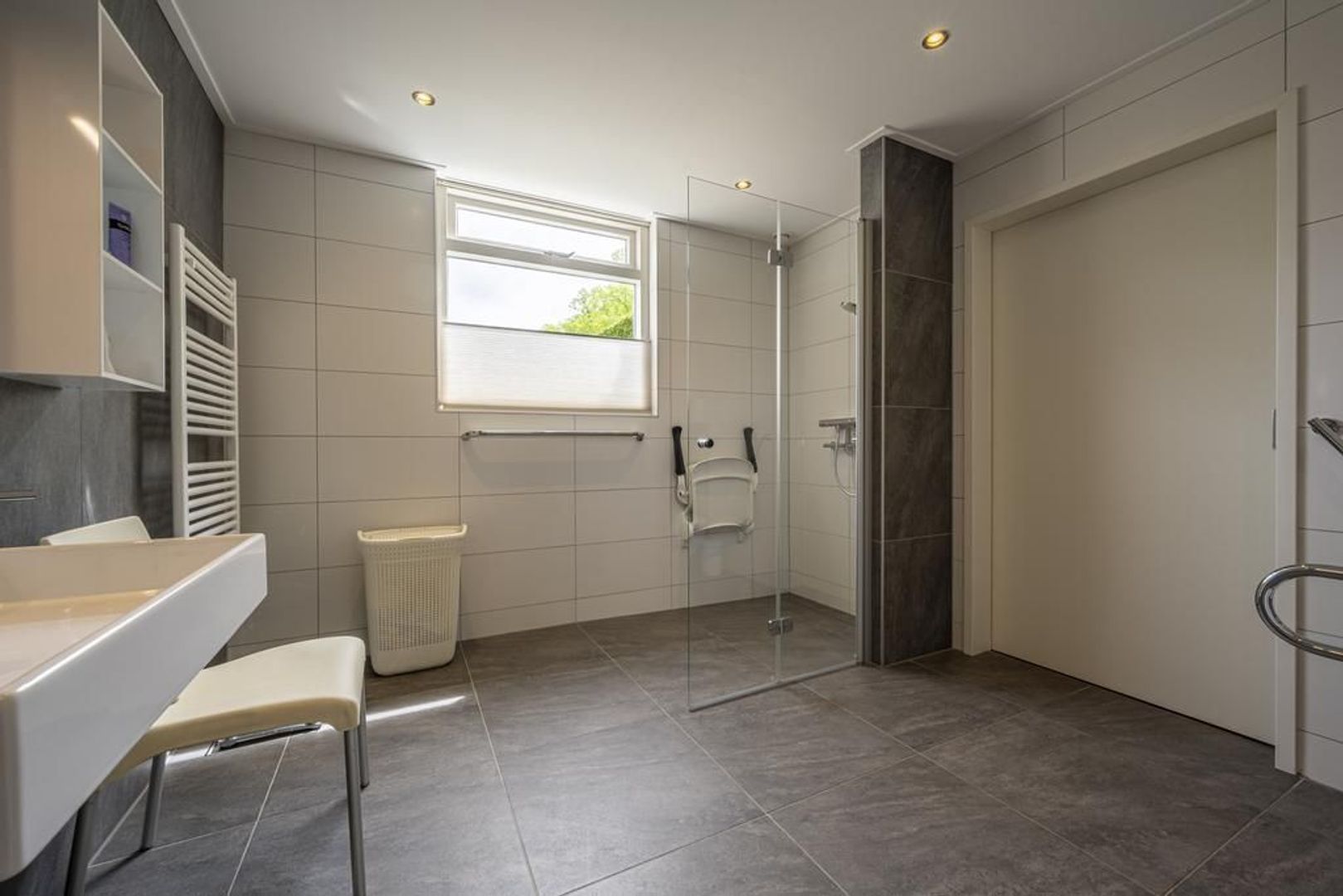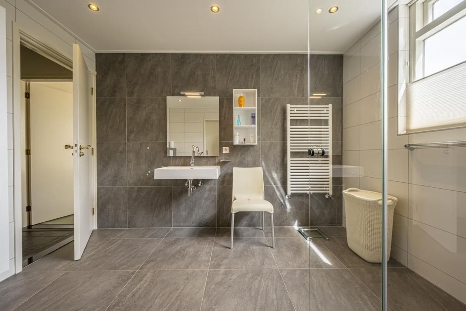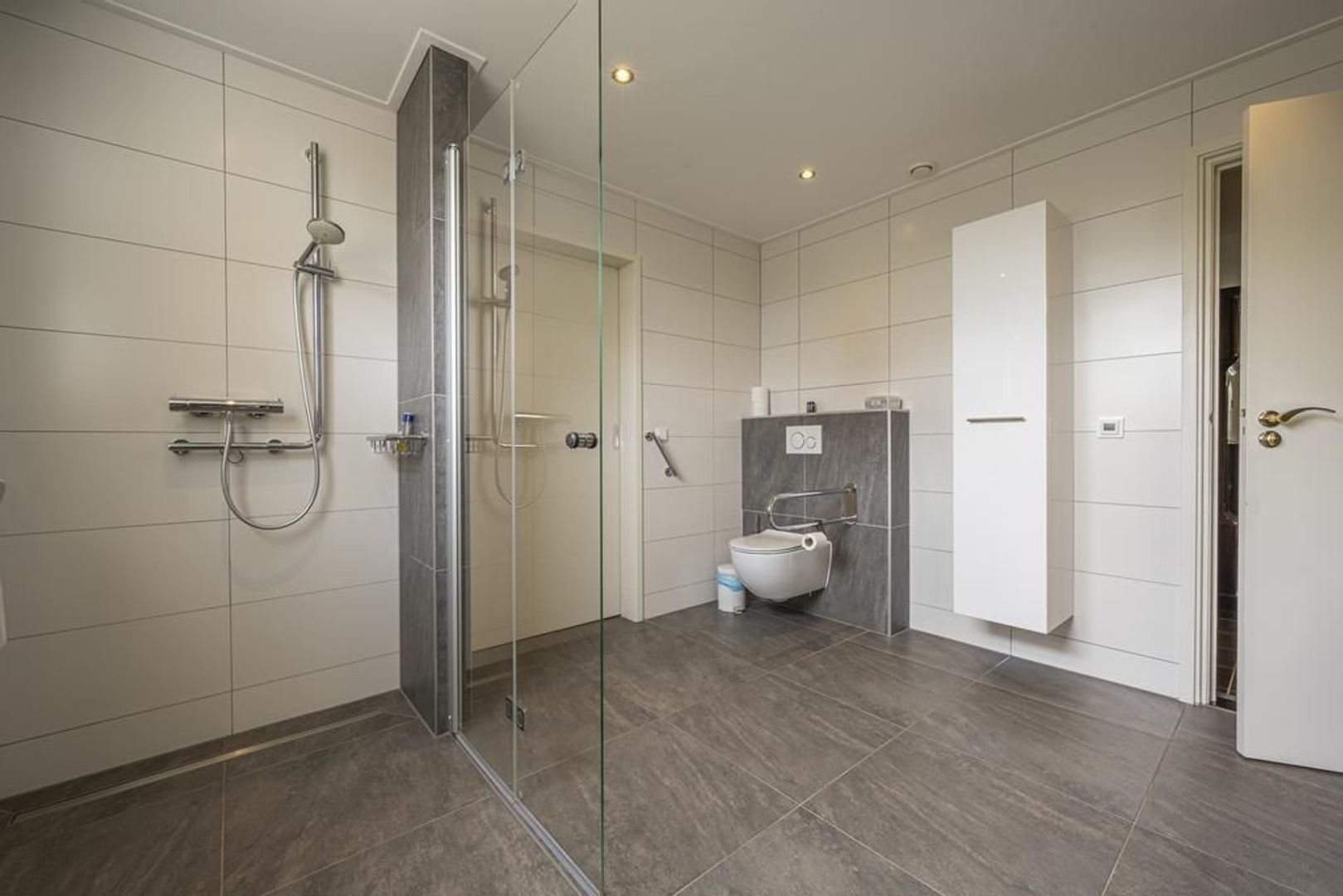 De moderne badkamer biedt ruimte aan een inloopdouche, een wandcloset en een wastafel. De vloer is voorzien van comfortabele vloerverwarming.
