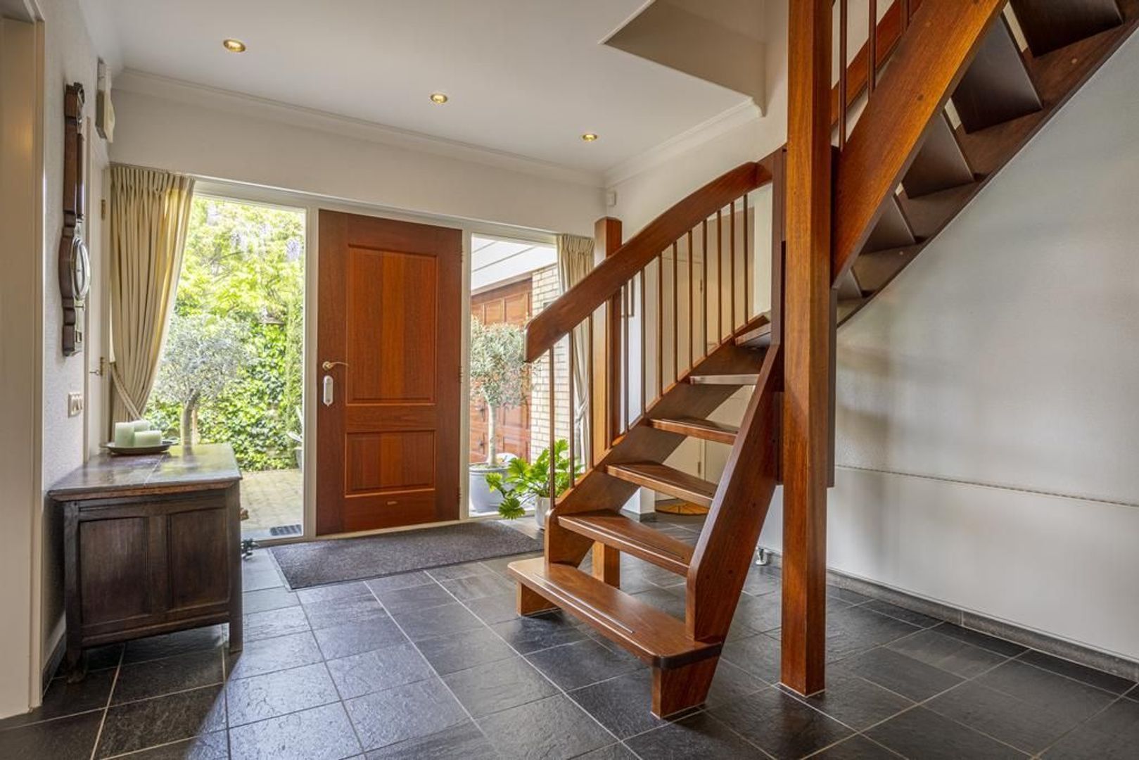 Vanuit de centrale entreehal is de garage binnendoor toegankelijk. Met een inpandige lengte van 9 meter biedt deze ruimte genoeg om zowel een auto te parkeren, als de fietsen en het tuingereedschap te stallen.