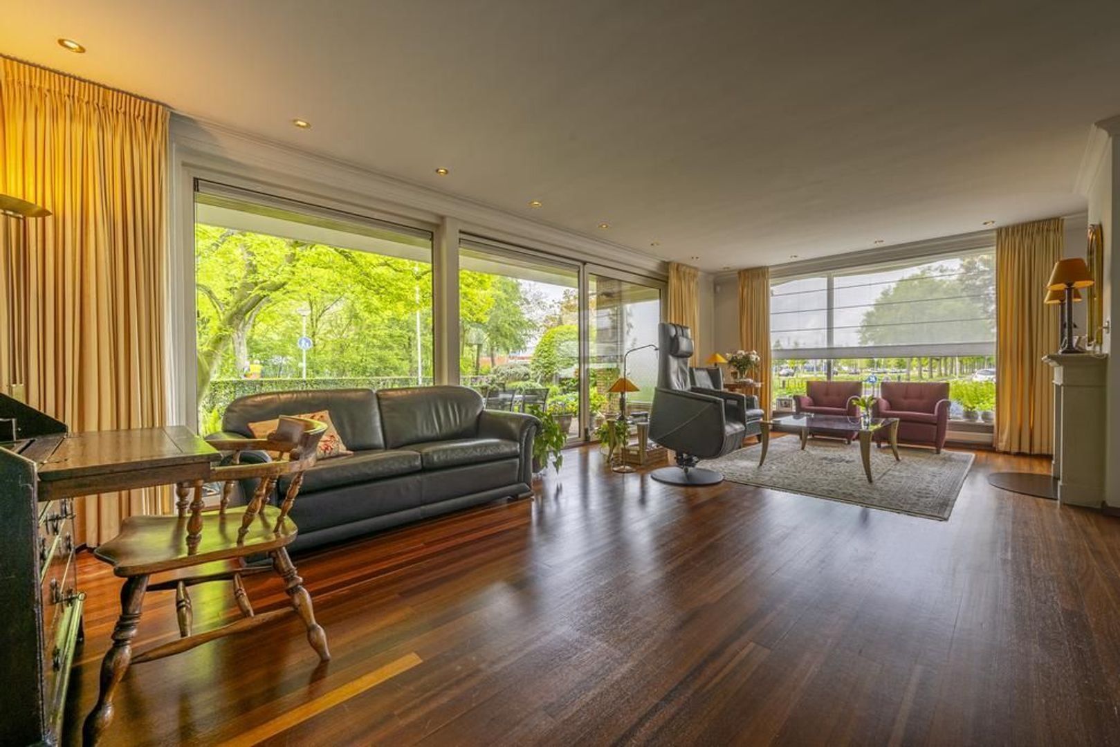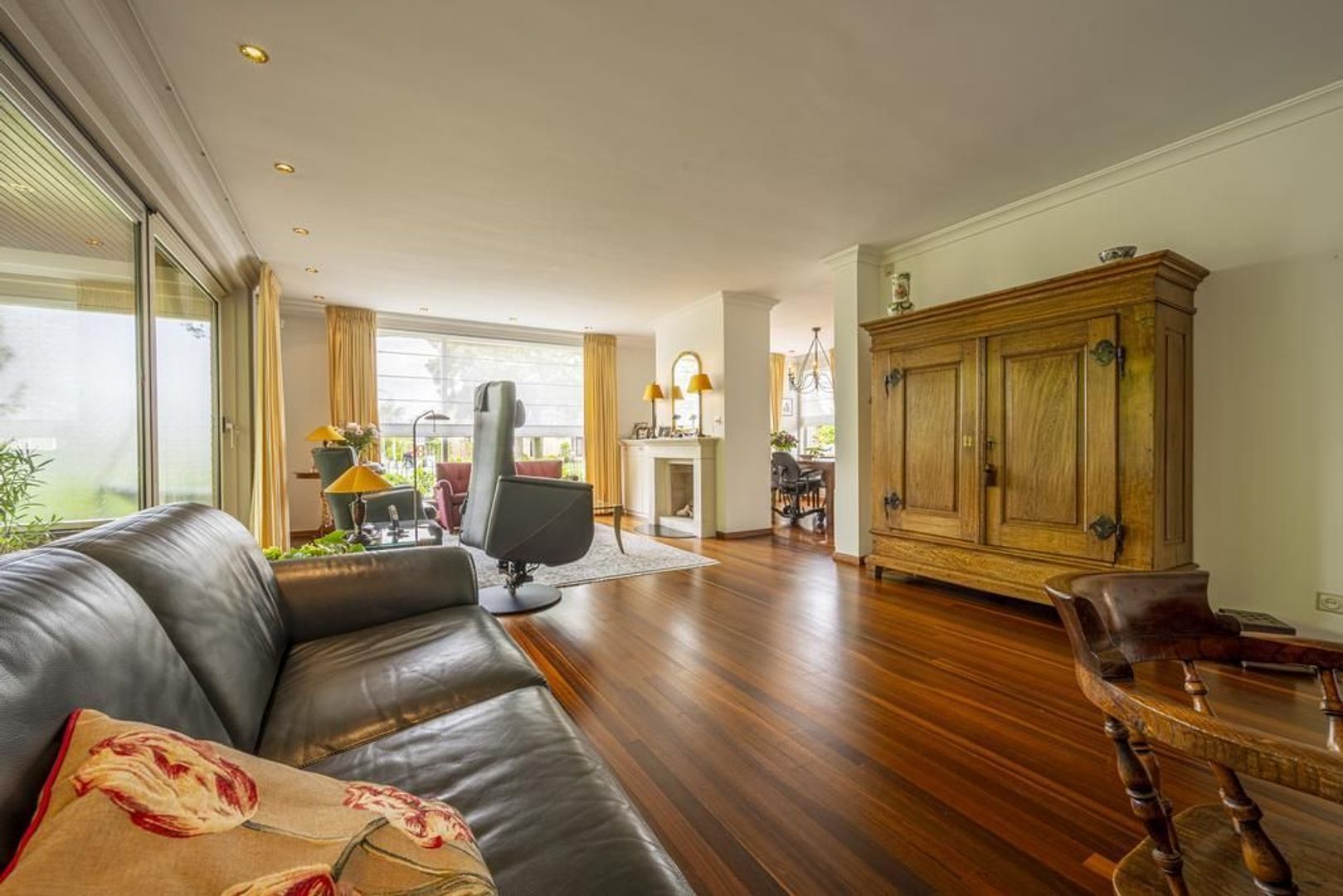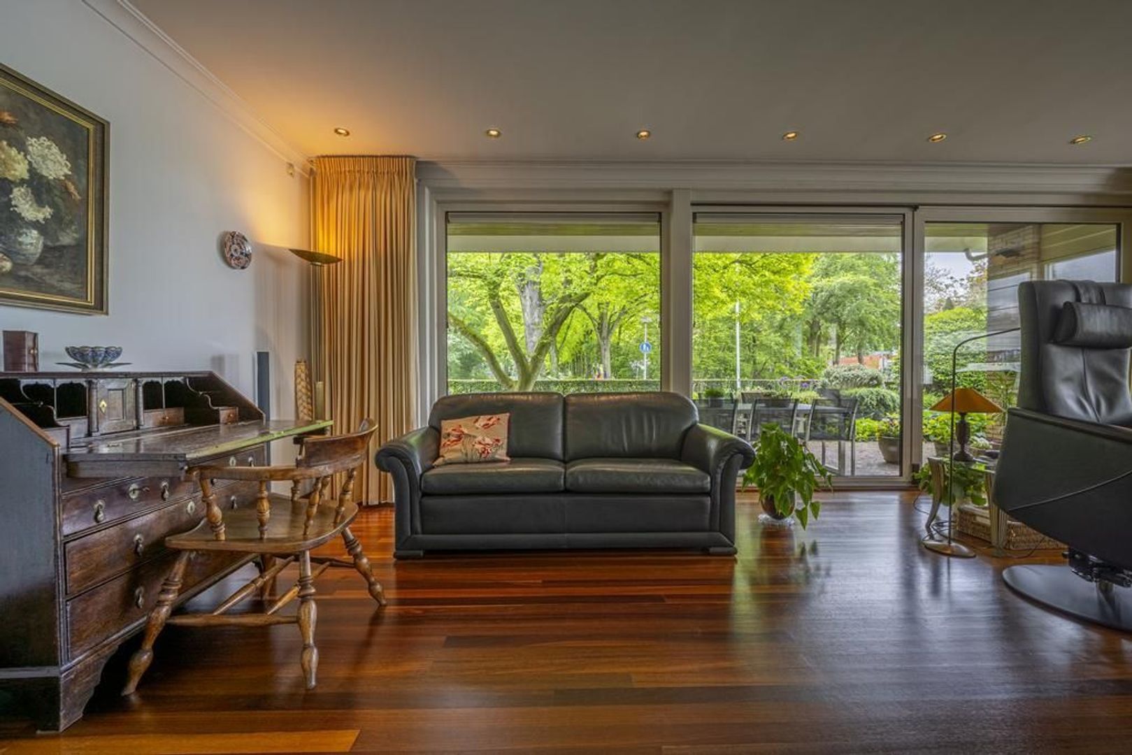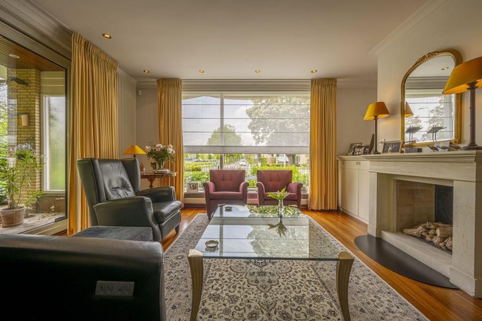 Ruime en lichte L-vormige woonkamer met gezellige gashaard en zicht op de tuin.