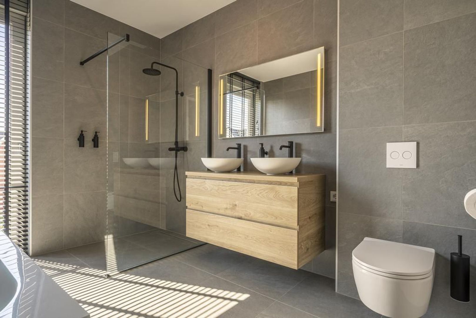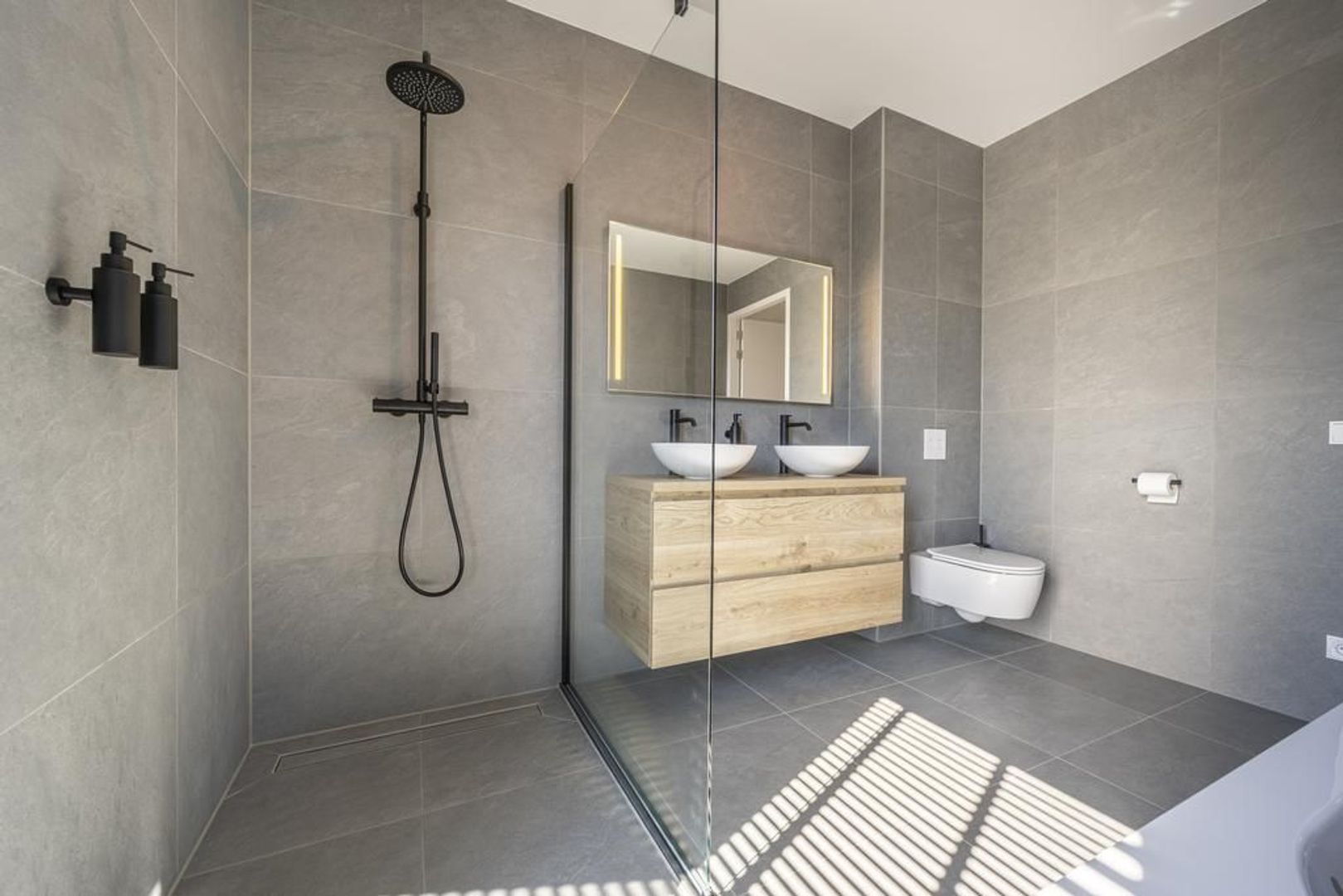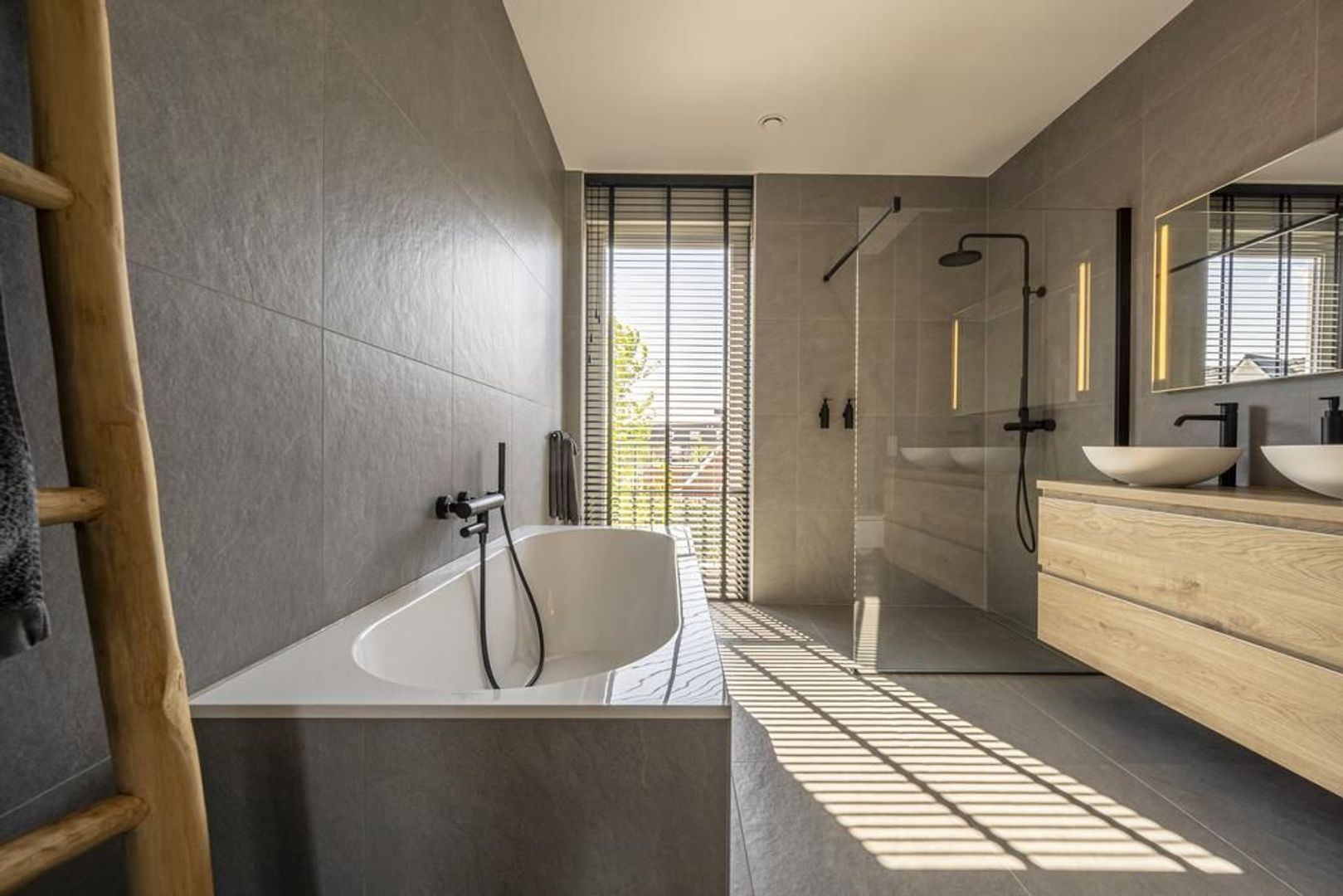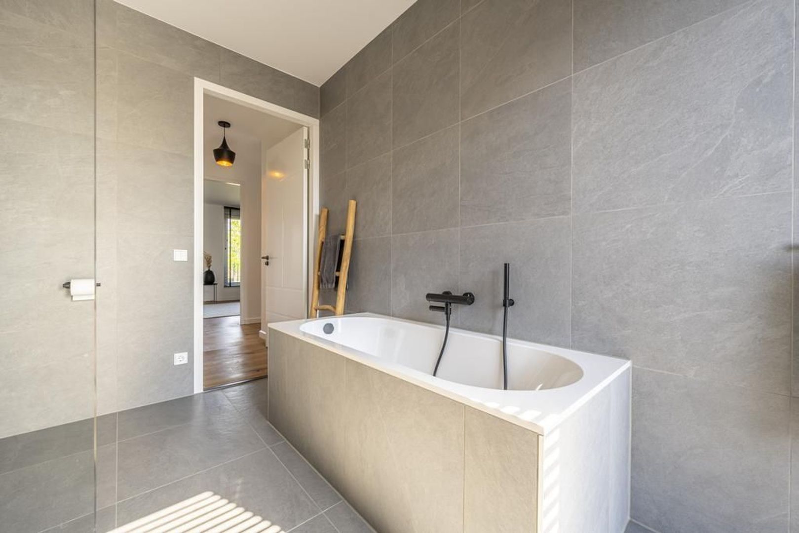 De overloop op de eerste verdieping geeft toegang tot twee ruime slaapkamers en een aparte kledingkamer. De master bedroom is uitgevoerd met elektrische rolluiken op zonne-energie. Deze slaapkamer kan eventueel worden gesplitst in twee slaapkamers. De badkamer is ingericht met een ligbad, een inloopdouche, een wastafelmeubel, een verwarmde spiegel, een wandcloset en vloerverwarming. De verdiepingsvloer is afgewerkt met een eiken lamelparketvloer.