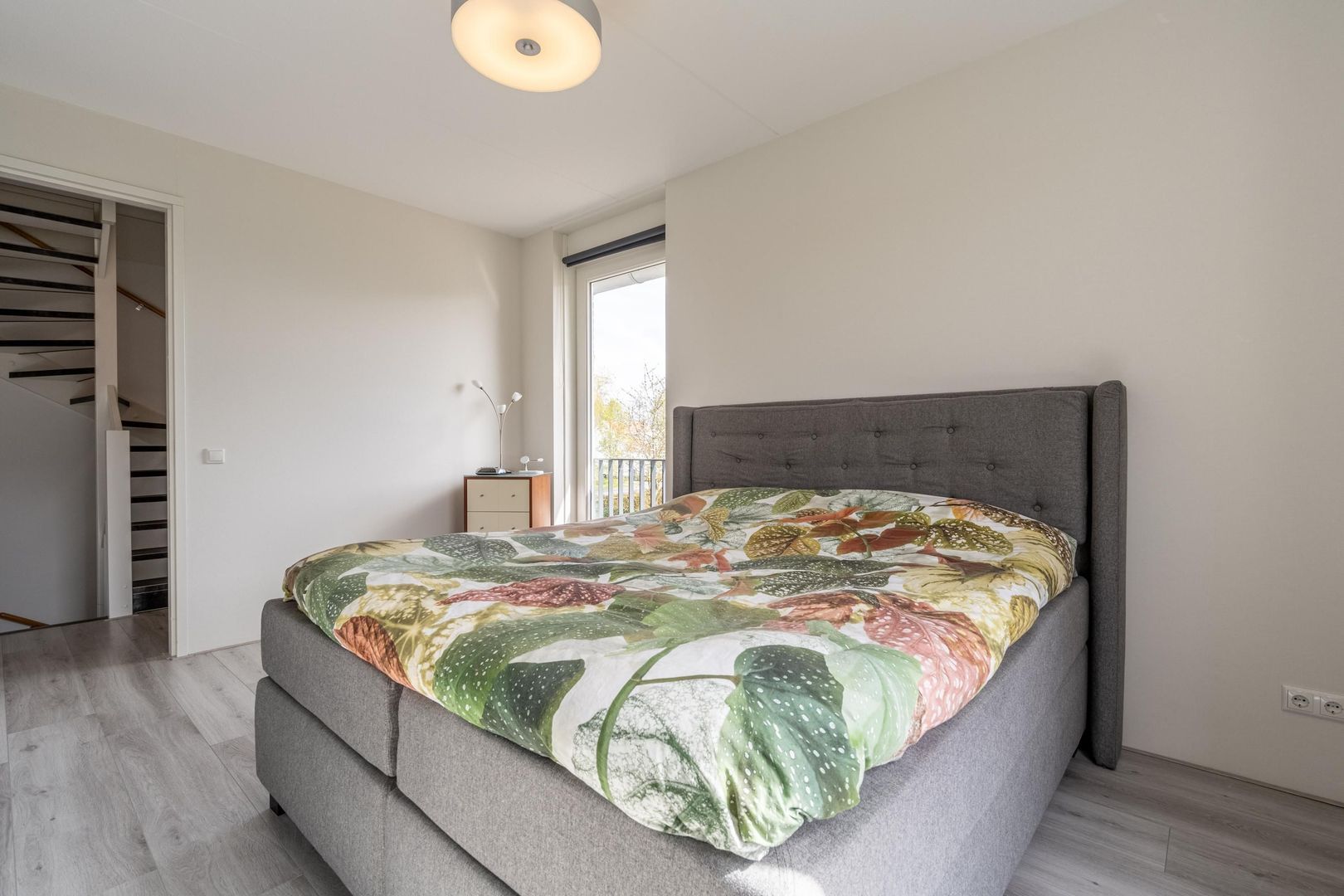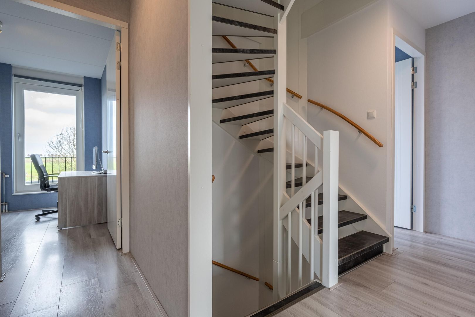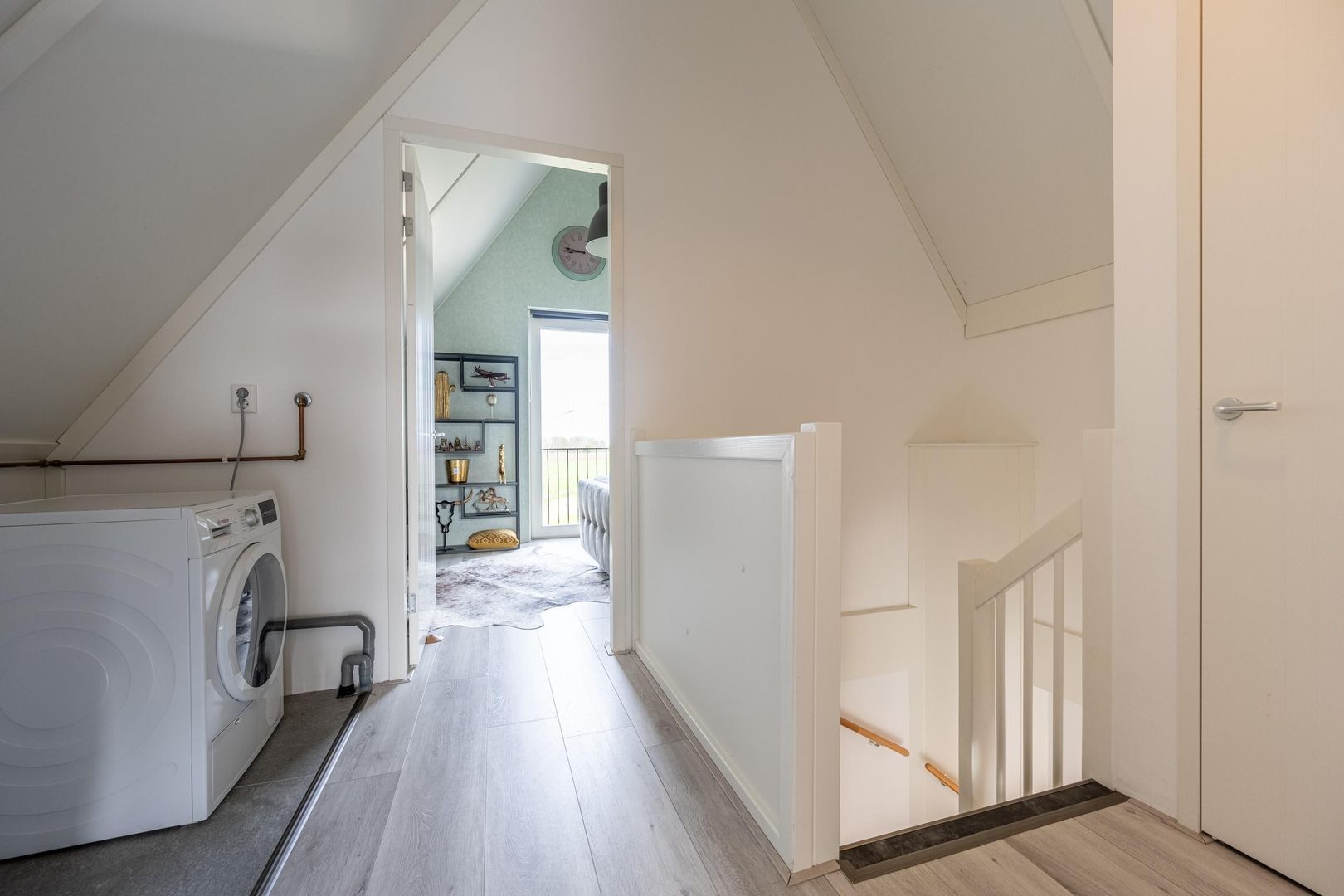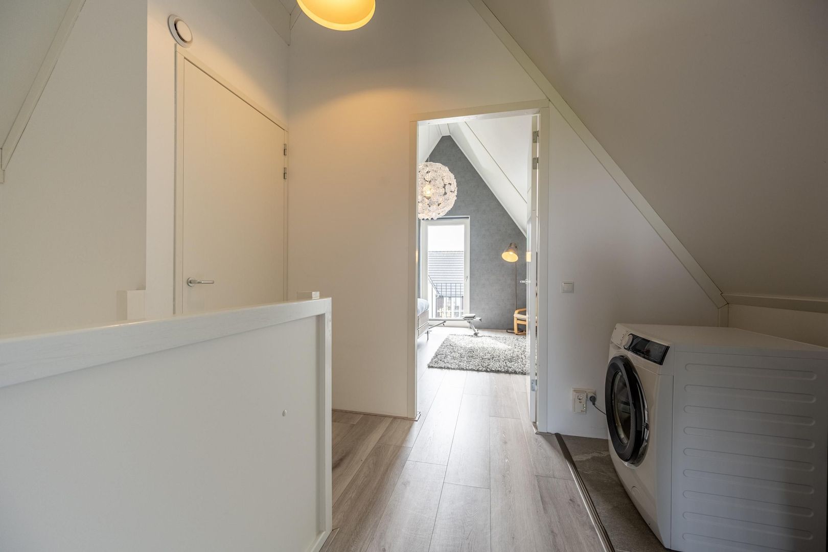 De tweede verdieping is met een vaste trap bereikbaar. Omdat het huis zo hoog is, konden hier met gemak nog twee extra slaapkamers worden gerealiseerd. Op de overloop/voorzolder is ruimte voor de wasapparatuur en in de kast hangt de cv-ketel.