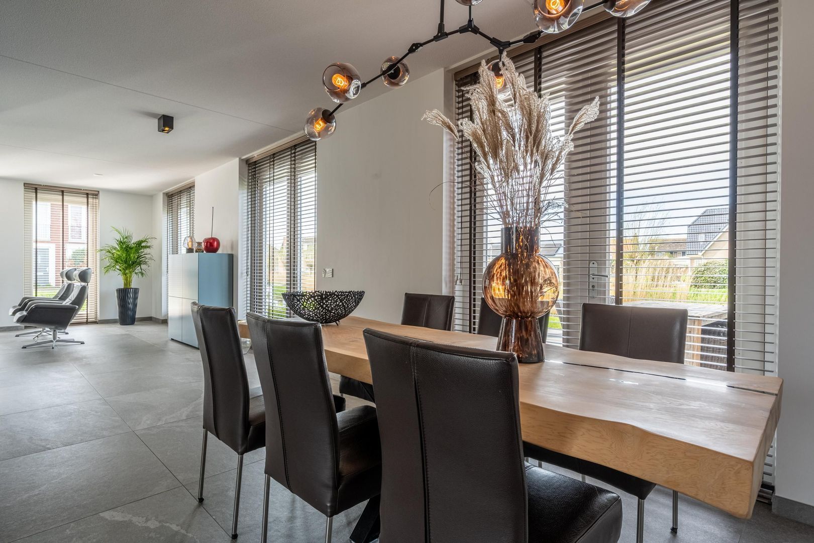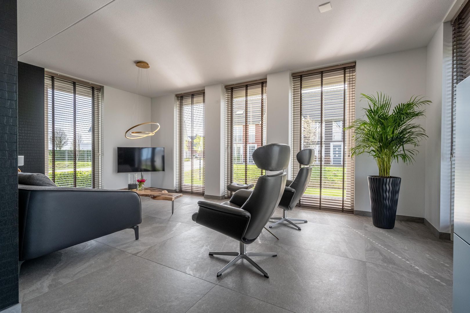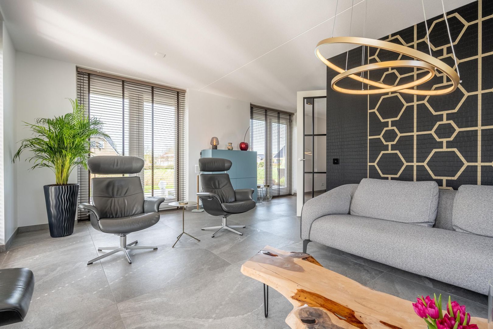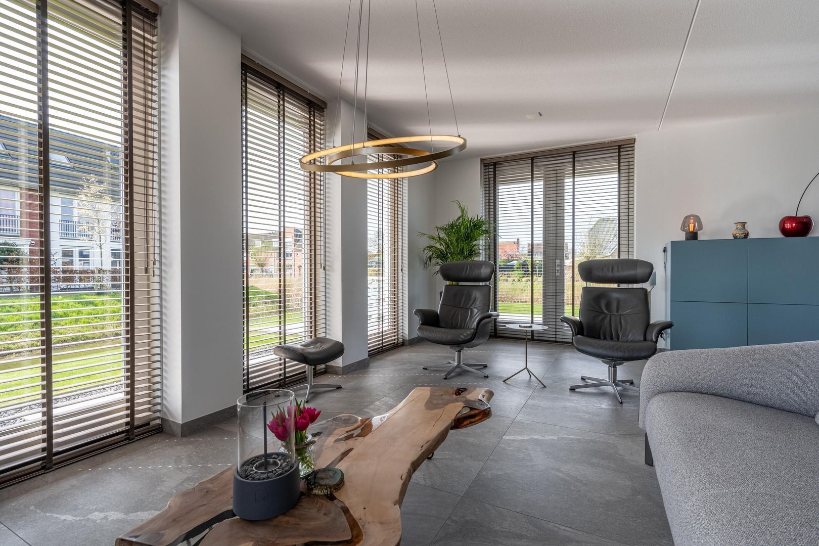 De L-vormige woonkamer wordt gekenmerkt door de vele plafondhoge ramen en een drietal openslaande deuren naar buiten. De lichtinval en het weidse uitzicht dragen bij aan een prettige woonsfeer.