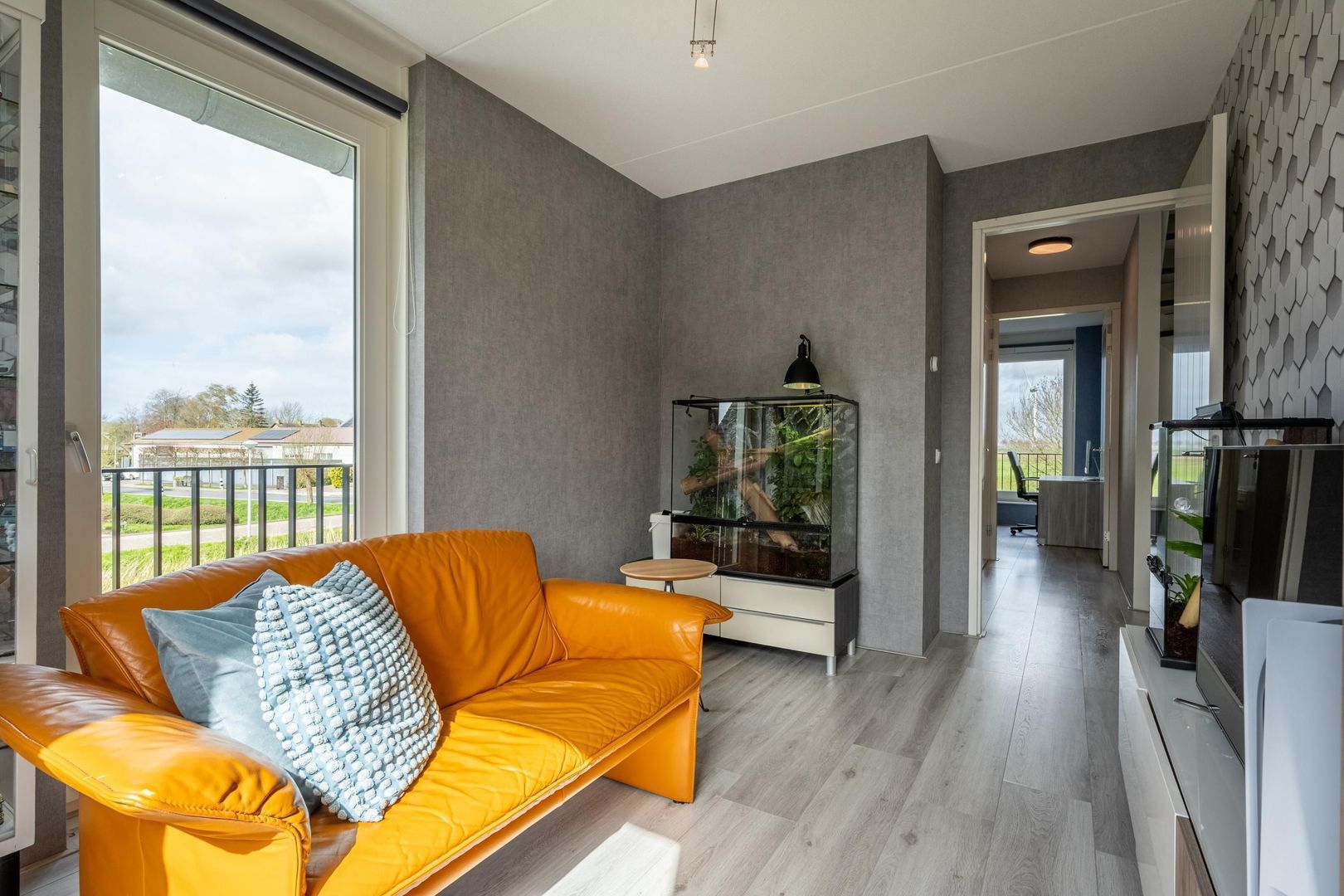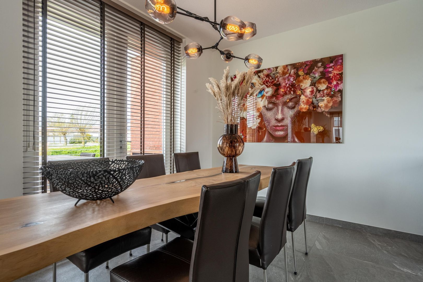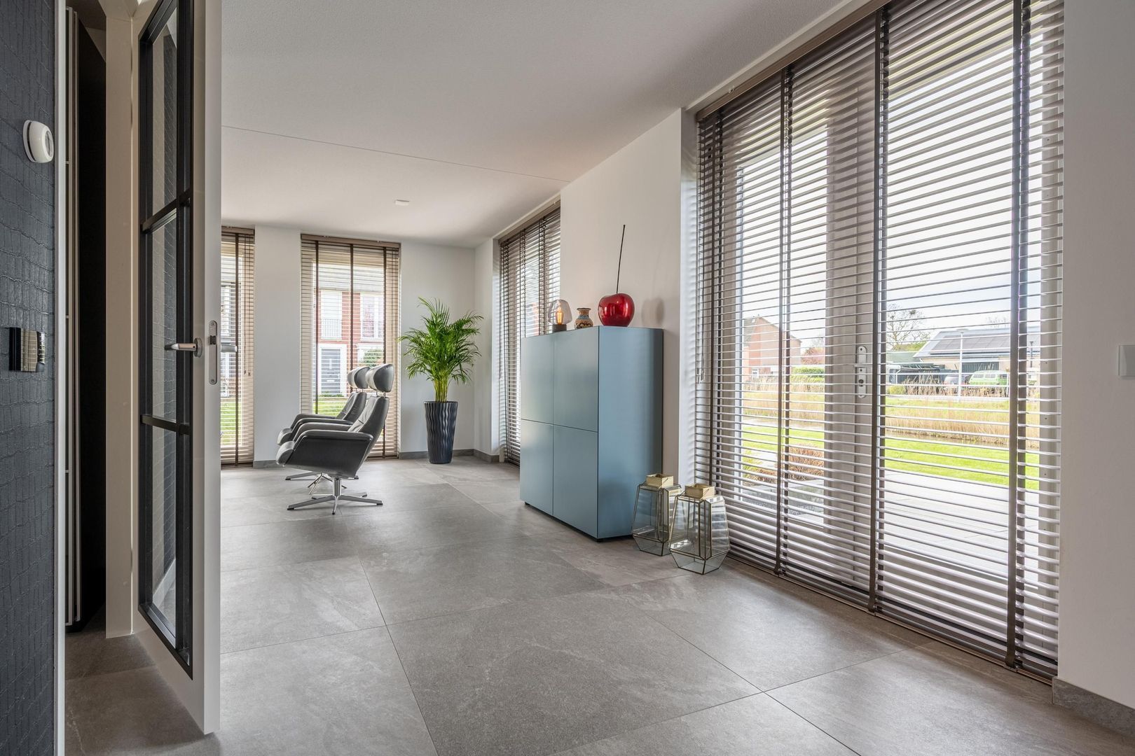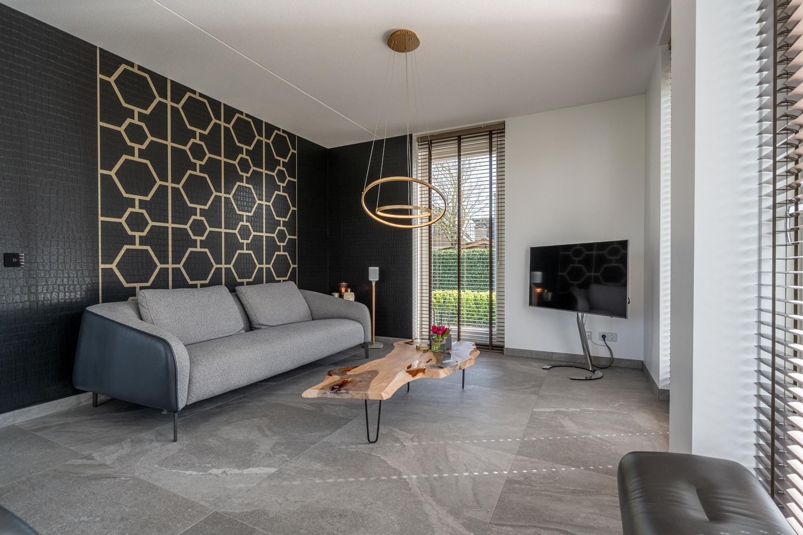 De L-vormige woonkamer wordt gekenmerkt door de vele plafondhoge ramen en een drietal openslaande deuren naar buiten. De lichtinval en het weidse uitzicht dragen bij aan een prettige woonsfeer.