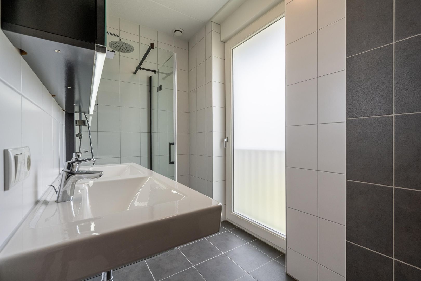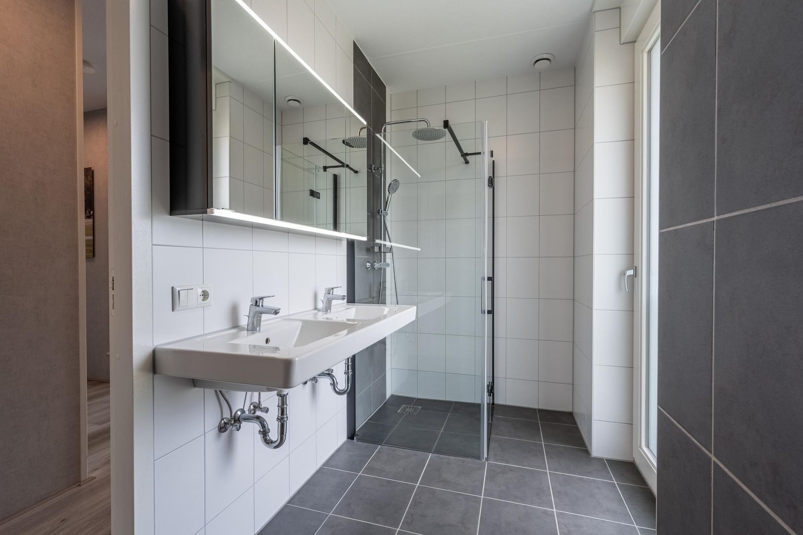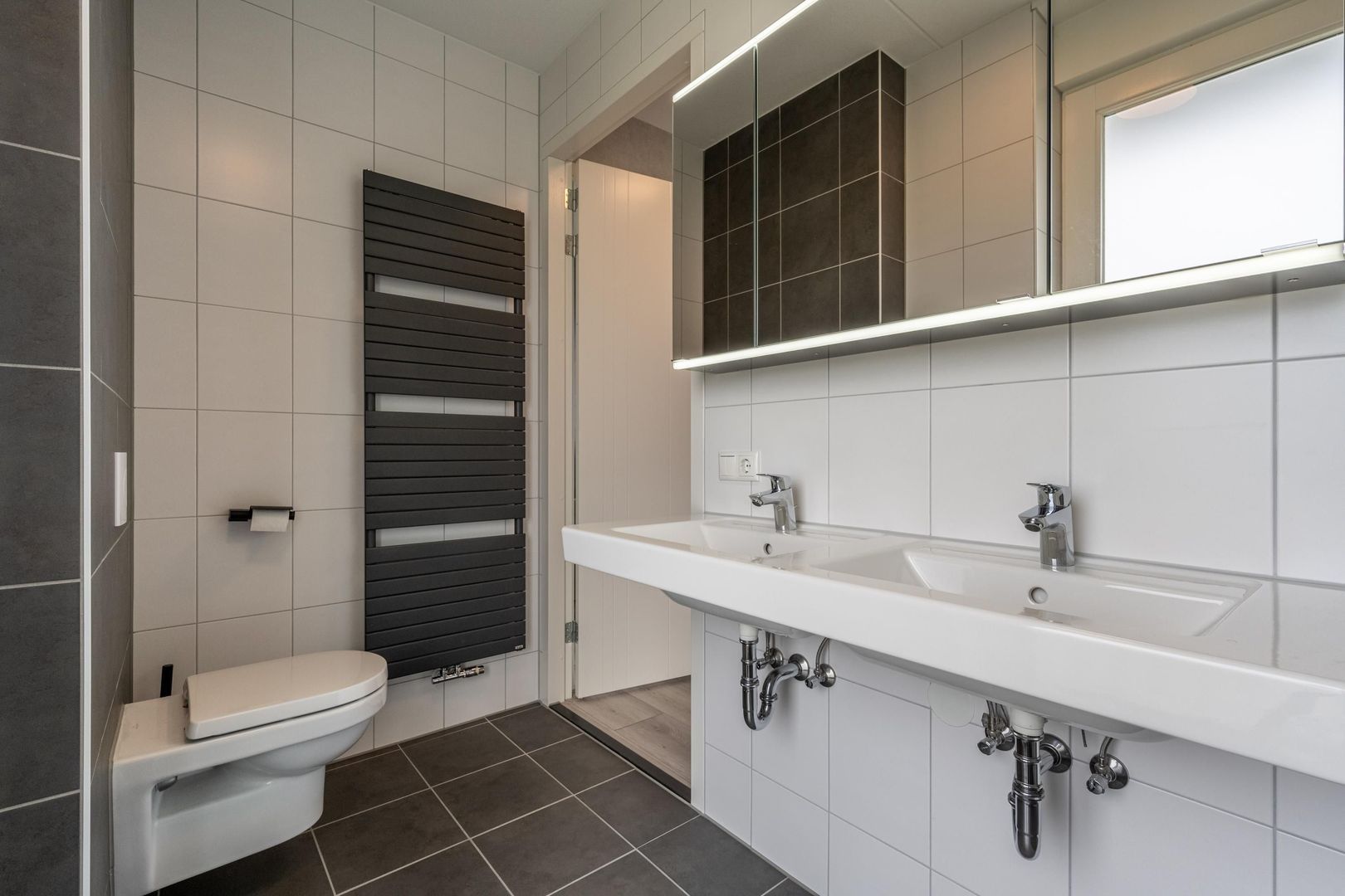 De badkamer is ingericht met een dubbel wastafelmeubel met bijpassende spiegelkast, een inloopdouche en een tweede toilet. Het raam kan open, zodat desgewenst kan worden geventileerd met frisse buitenlucht.