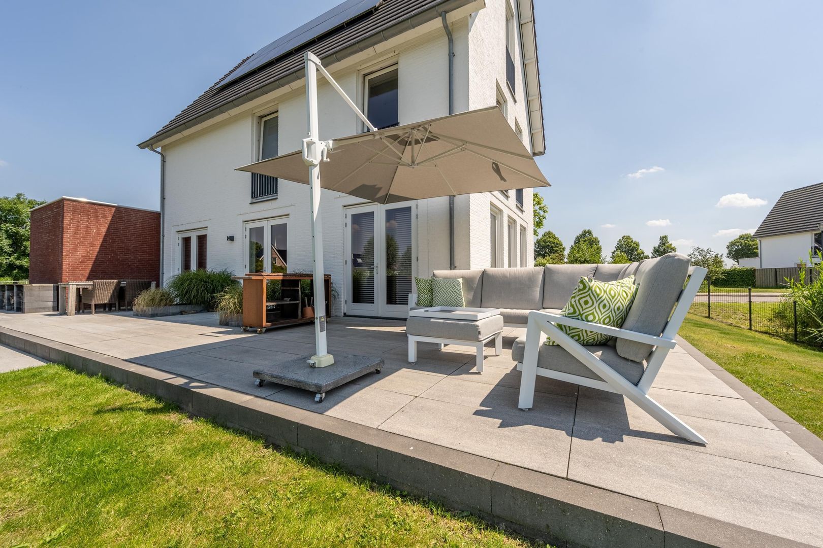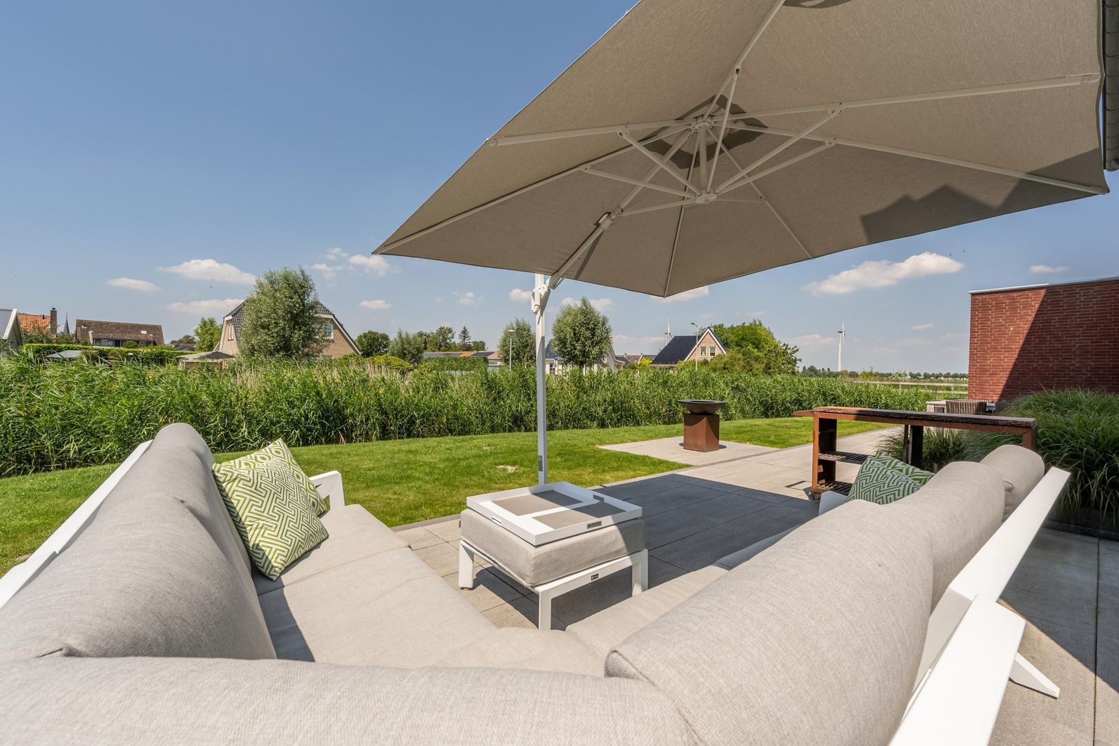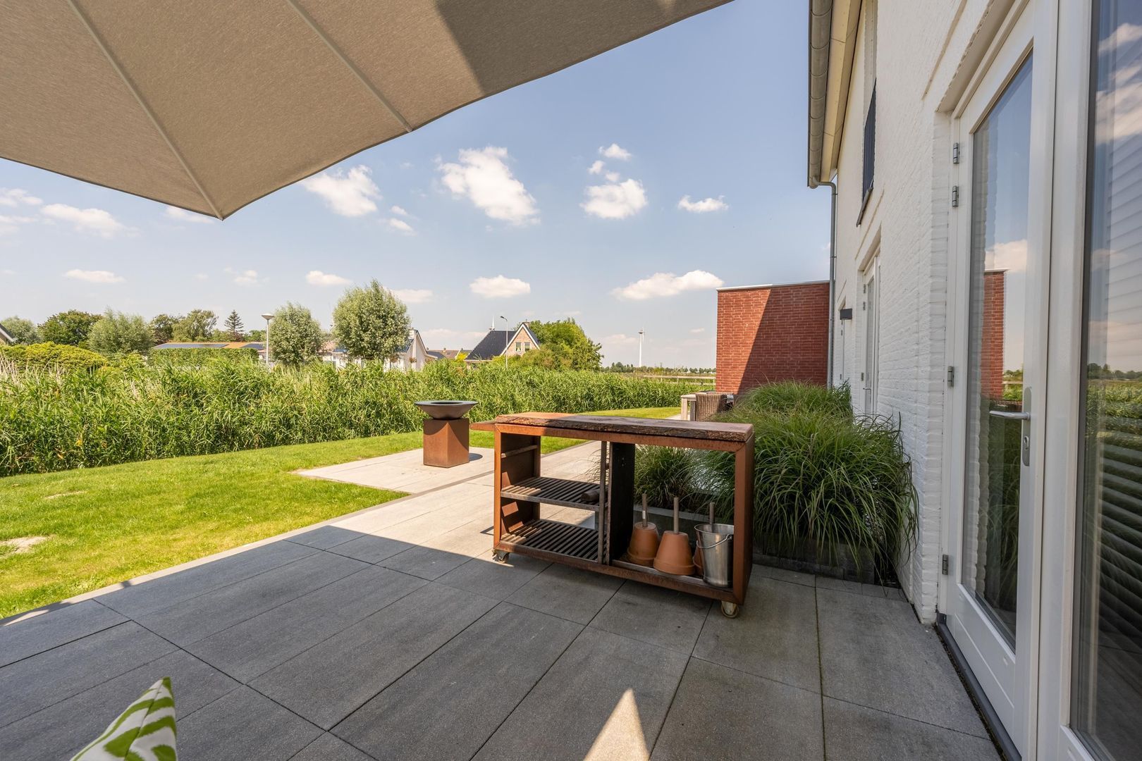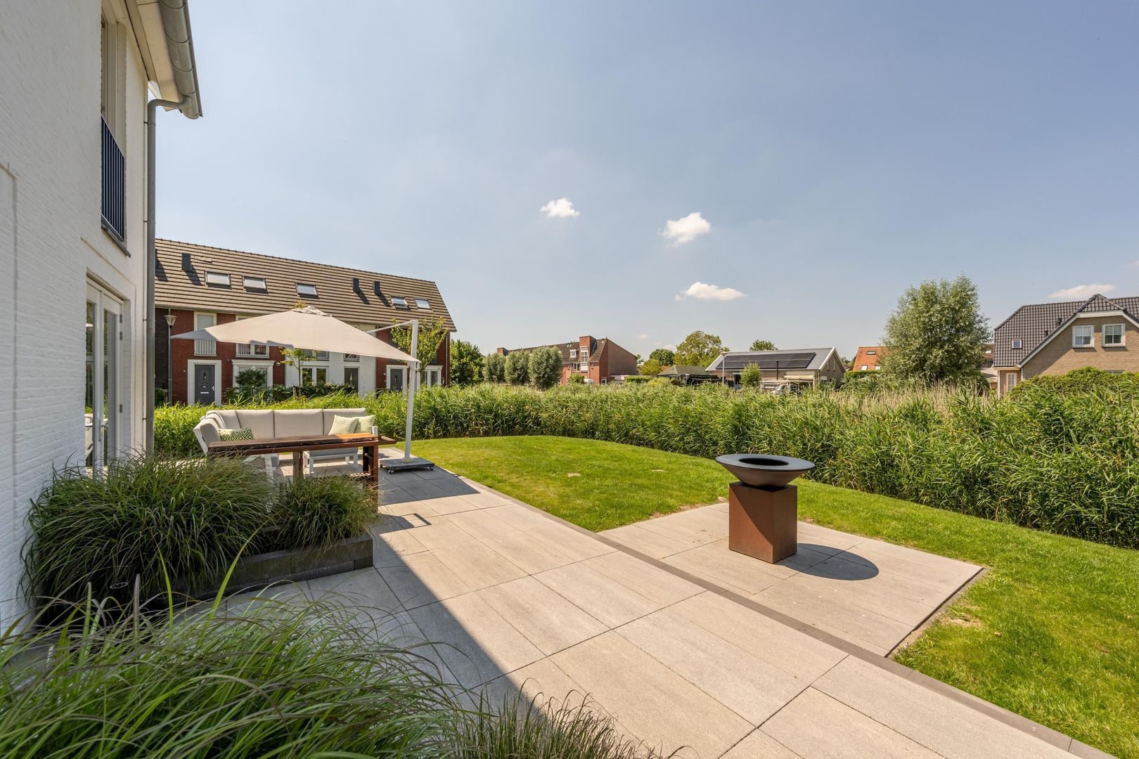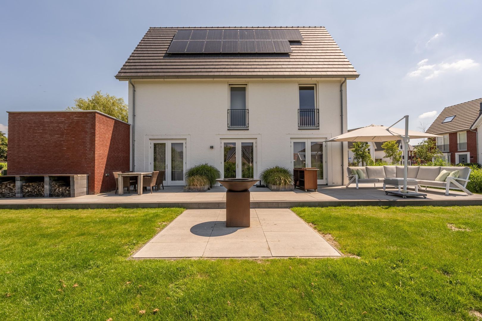 De tuin is netjes aangelegd met o.a. een groot terras met moderne tegels en geïntegreerde plantenbakken, een stookplaats voor de buitenhaard en veel gras om de natuurlijke omgeving te benadrukken.