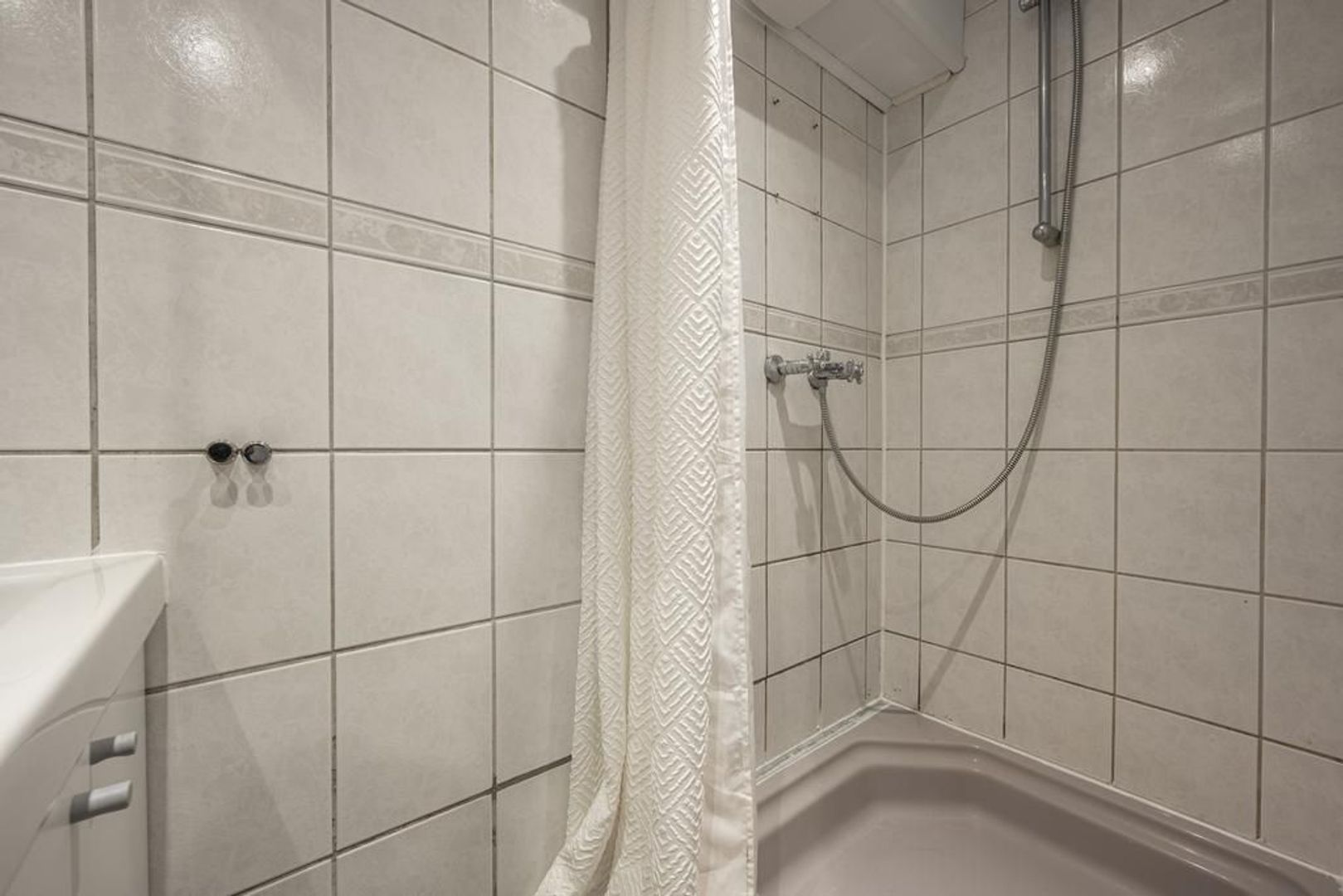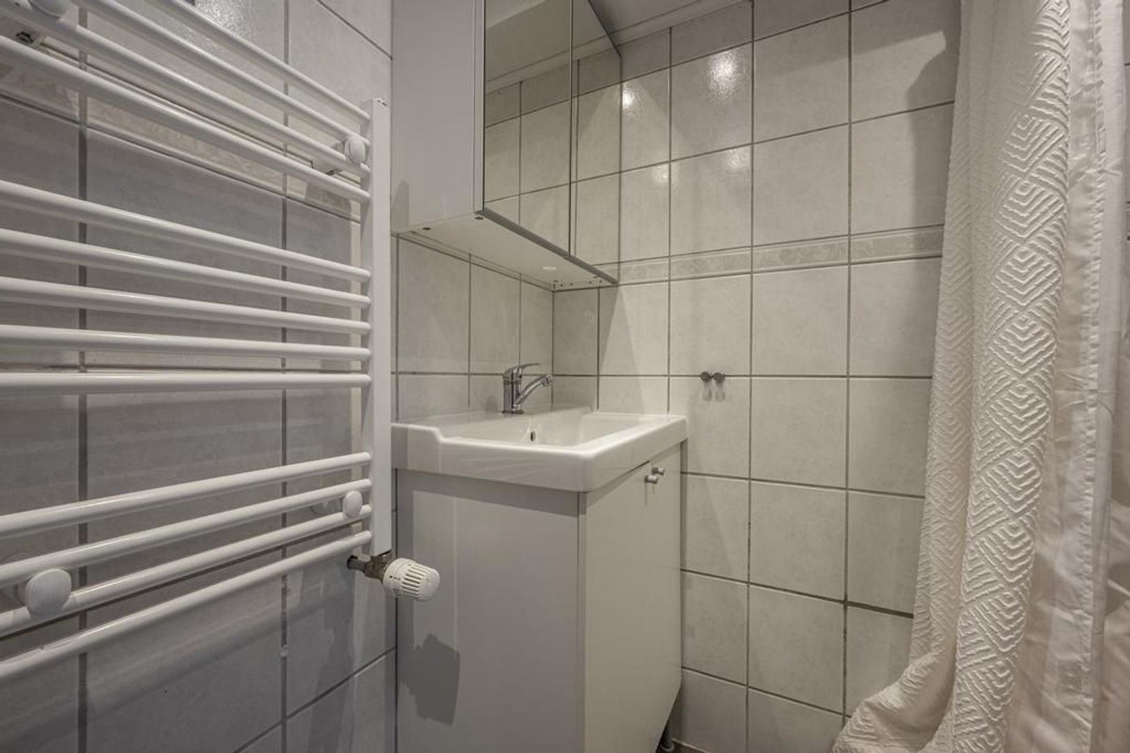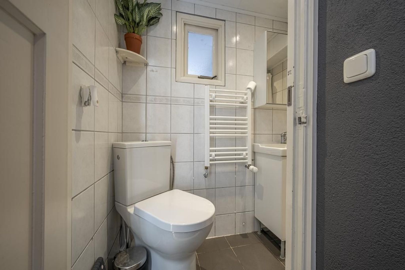 In de aanbouw aan de achterkant bevindt zich de badkamer/toiletruimte, welke is voorzien van een douchegelegenheid, wastafelmeubel en toilet. Achter de badkamer is een bergruimte waarin de cv-ketel hangt en ruimte is voor de wasmachine.