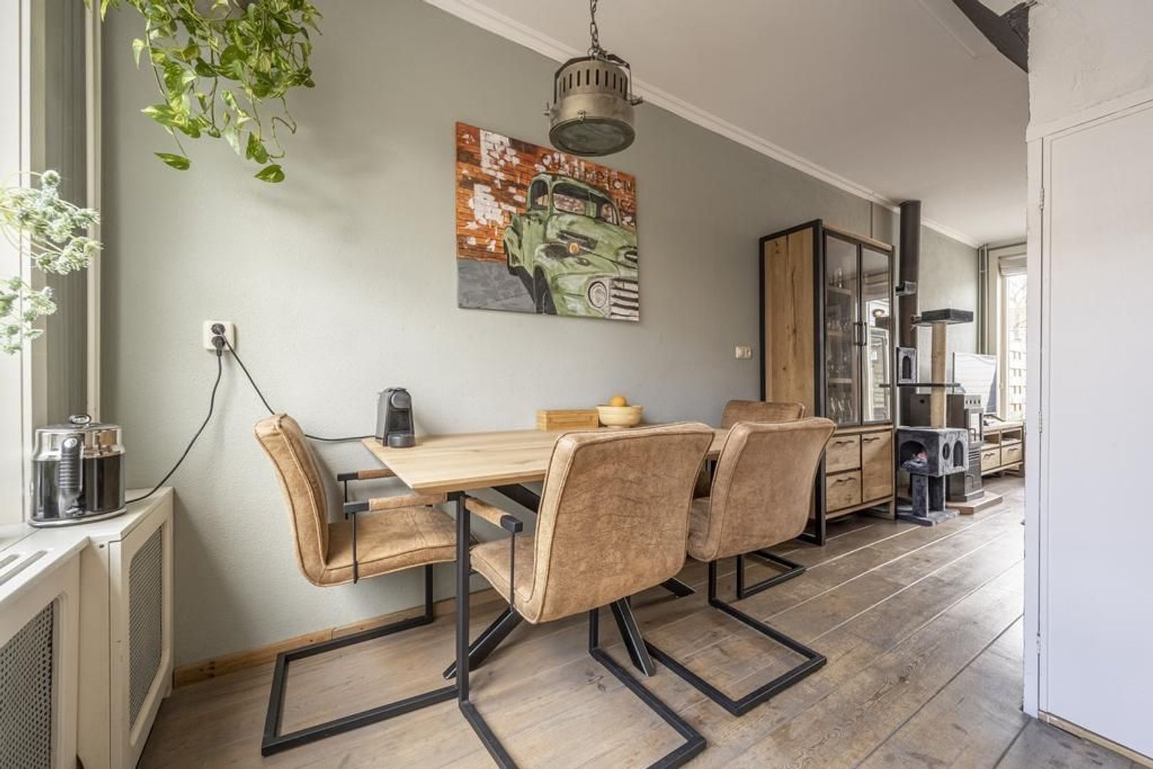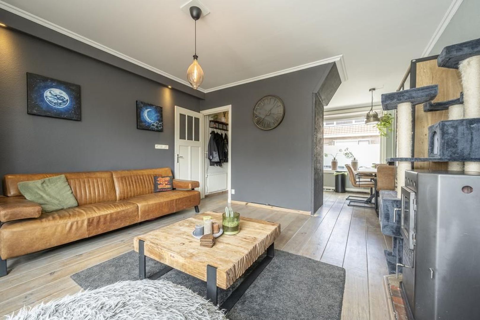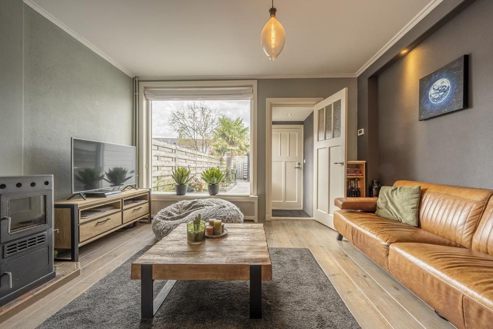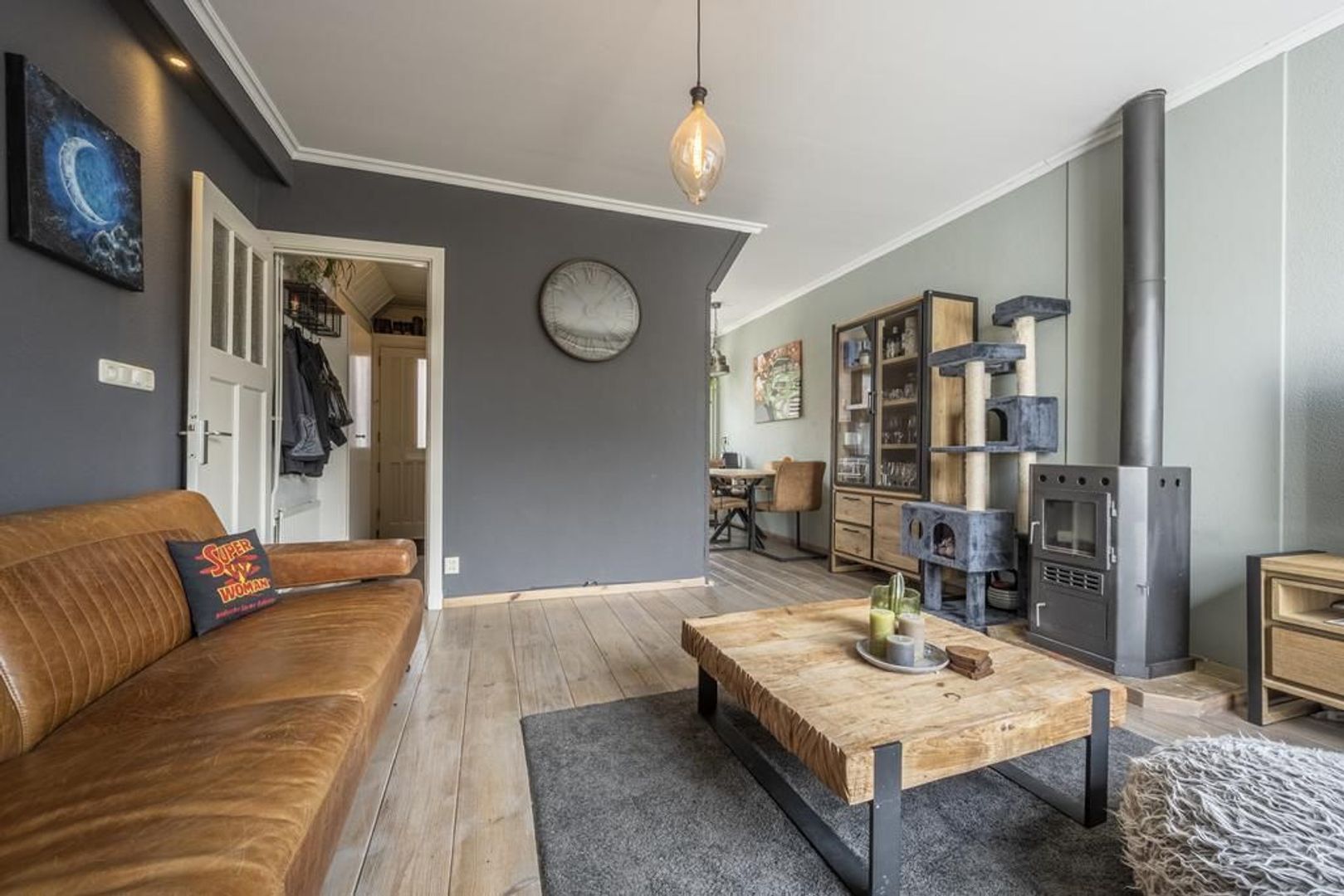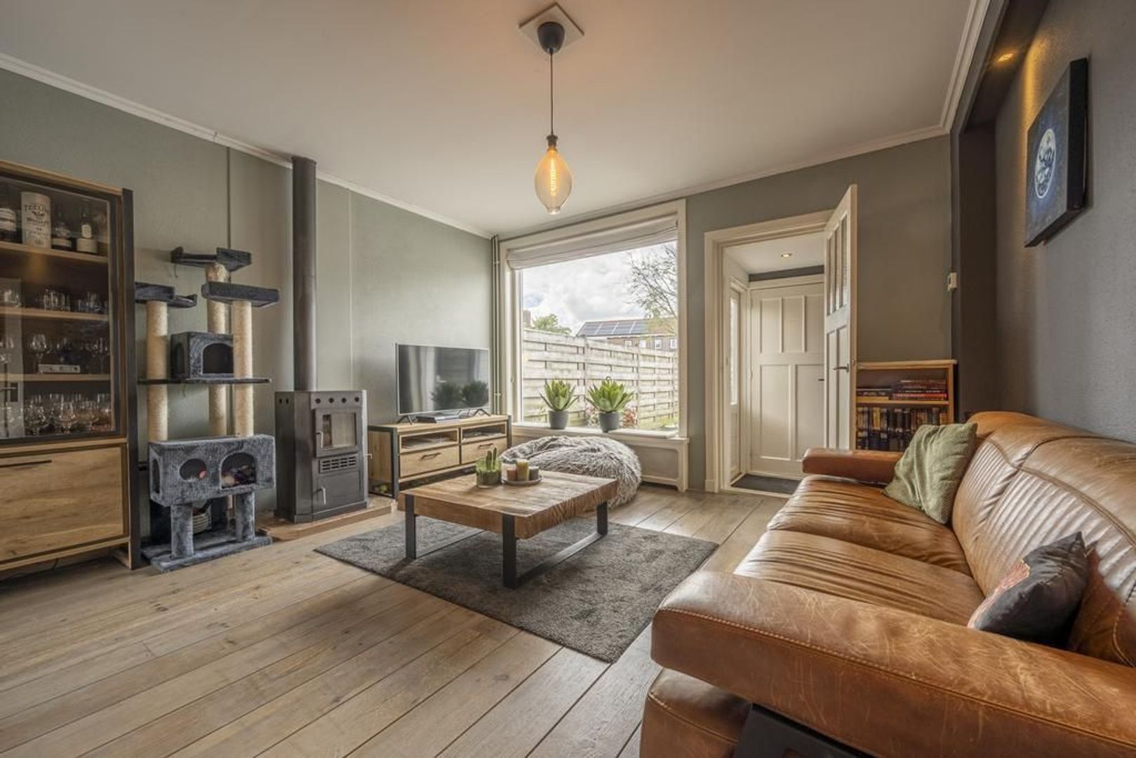 Gezellige woonkamer met houtkachel.