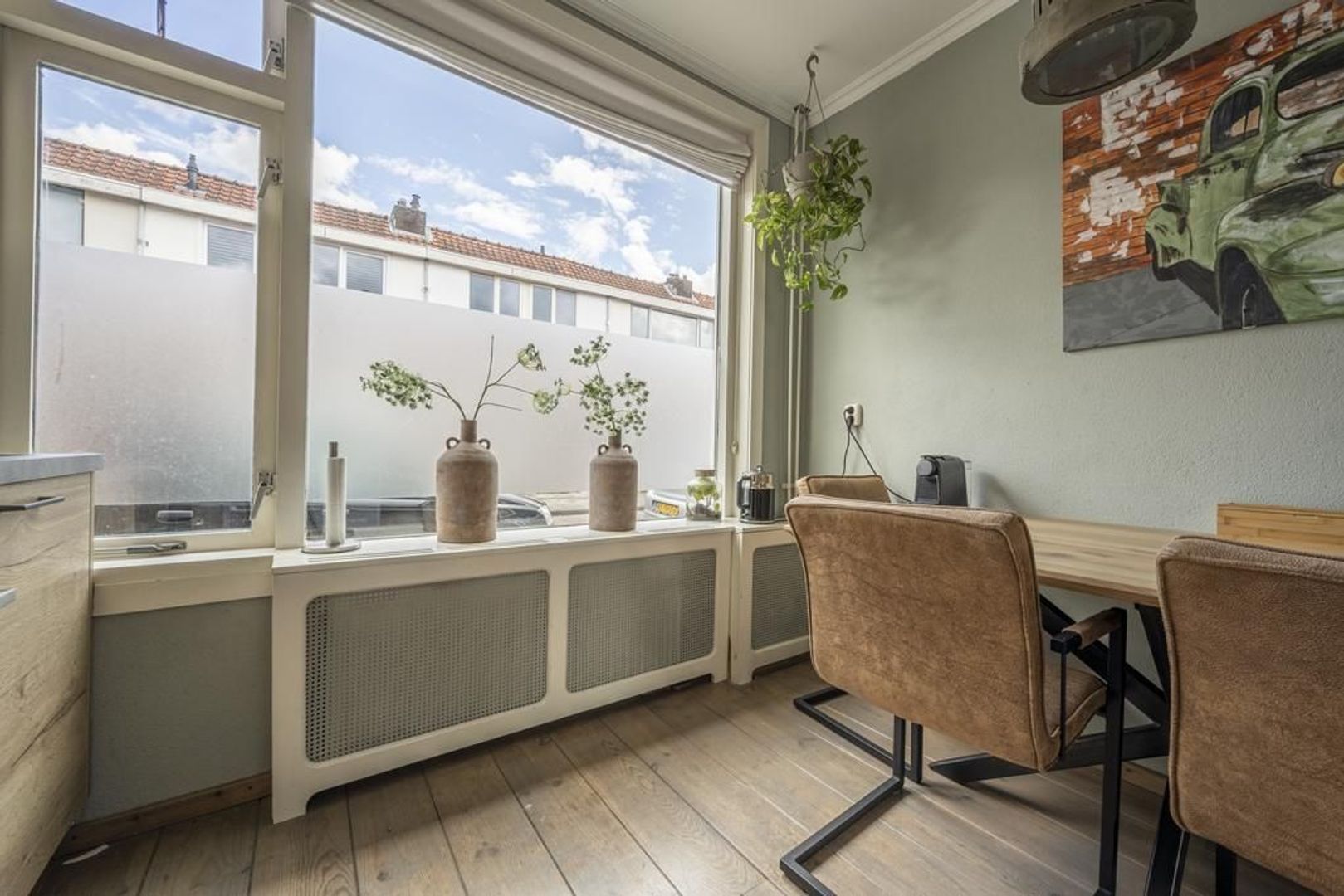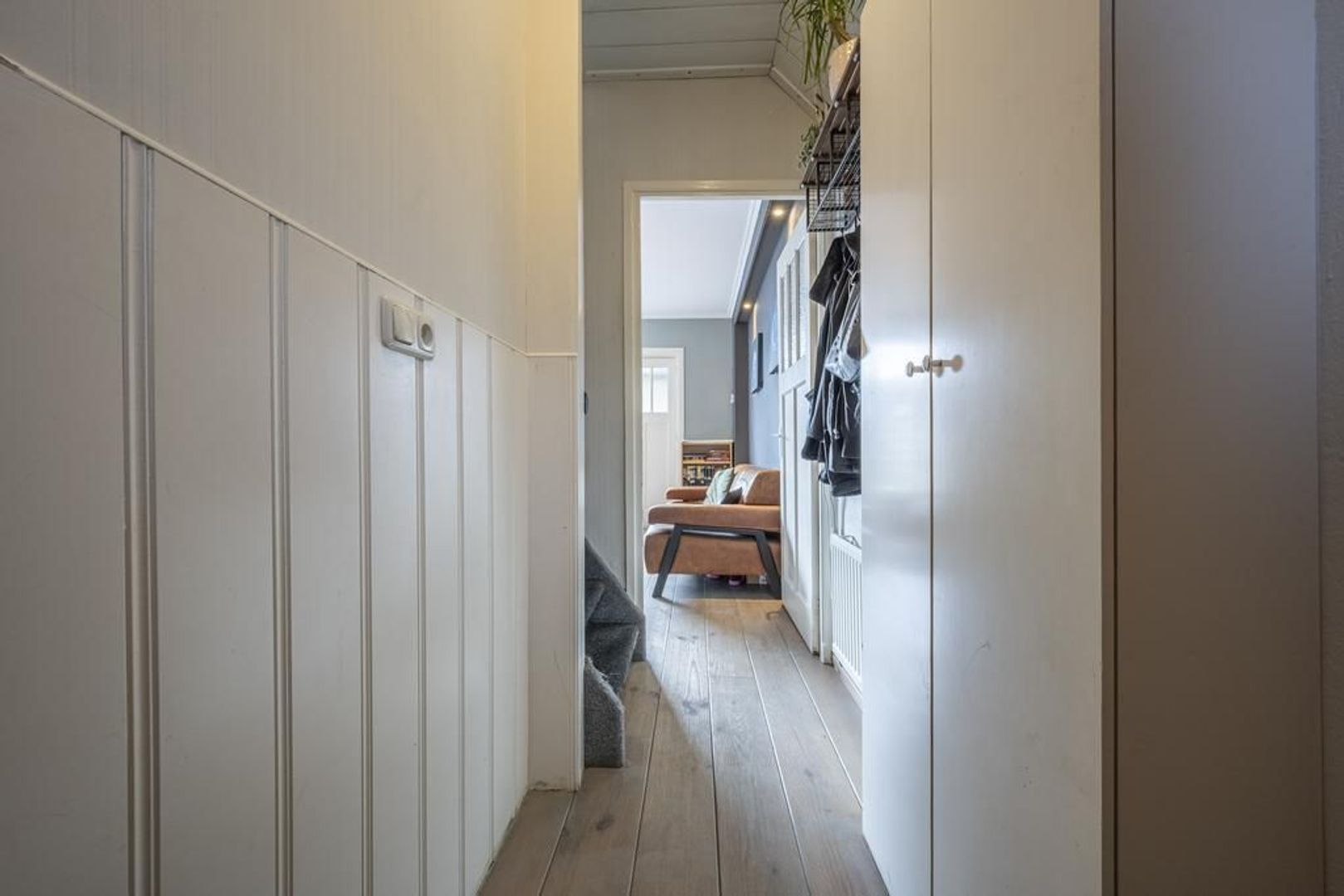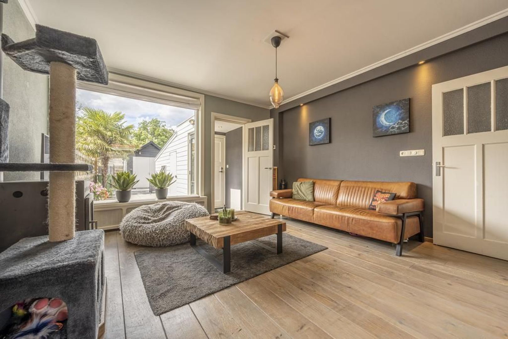 De leefruimte is afgewerkt met houten vloerdelen.