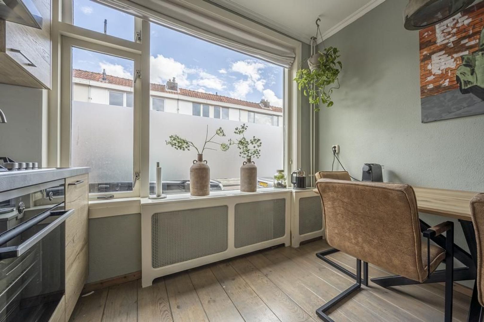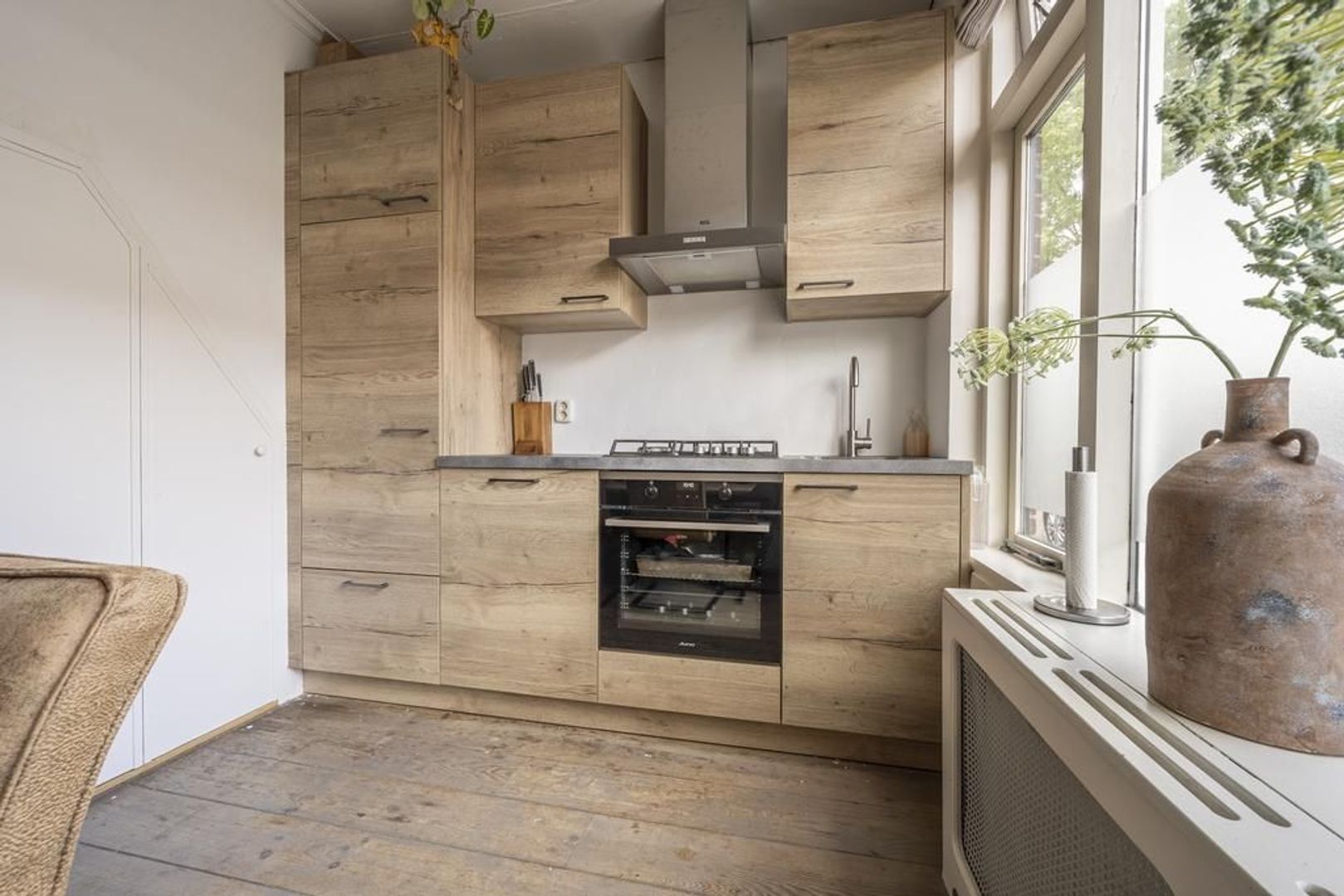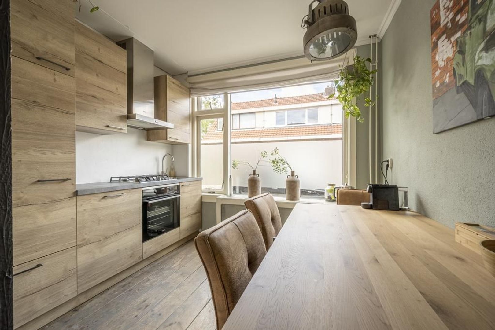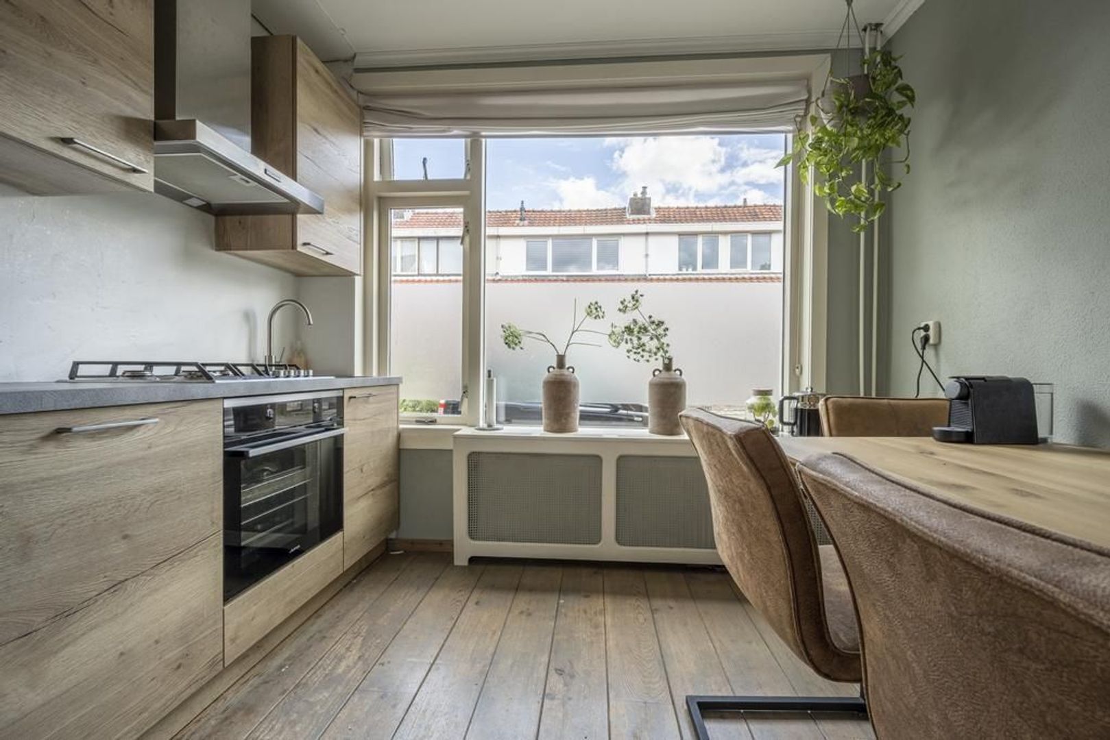 Halfopen keuken aan de straatkant. Deze is ingericht met een modern landelijke wandopstelling en is voorzien van een gaskookplaat, oven, afzuigkap, vaatwasser en koelkast.