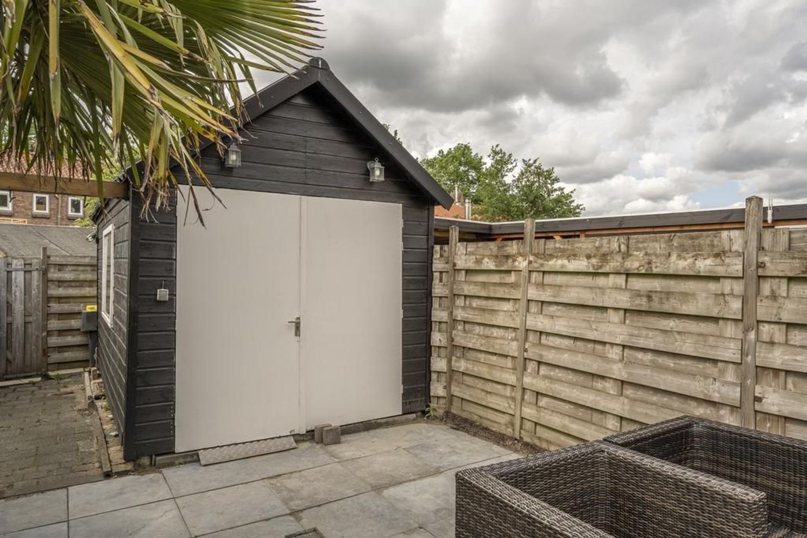 Achterop het erf staat een houten schuur met openslaande deuren.