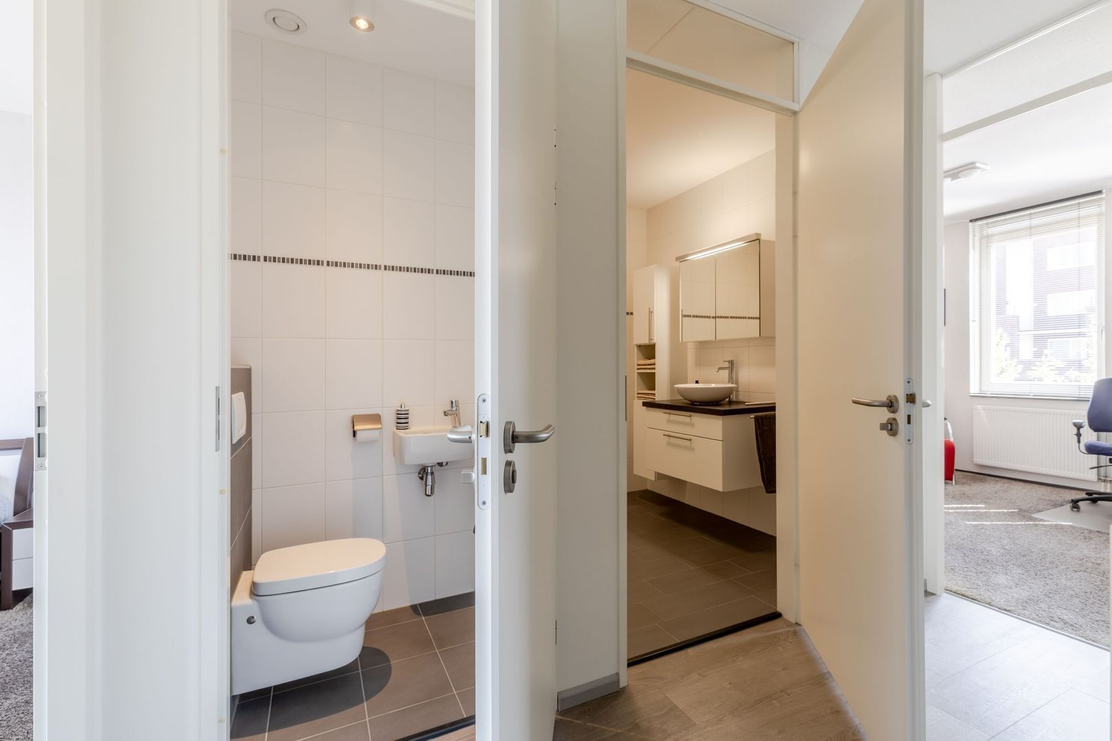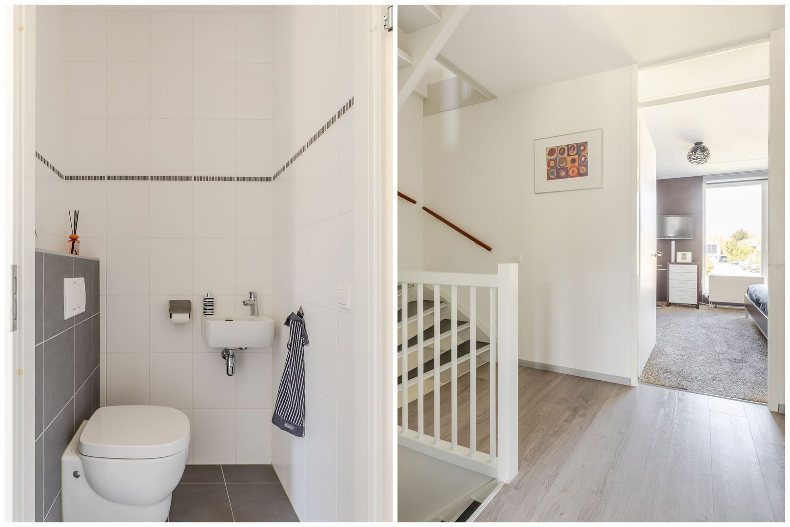 Het aparte toilet op de overloop is een luxe, zo apart van de badkamer.