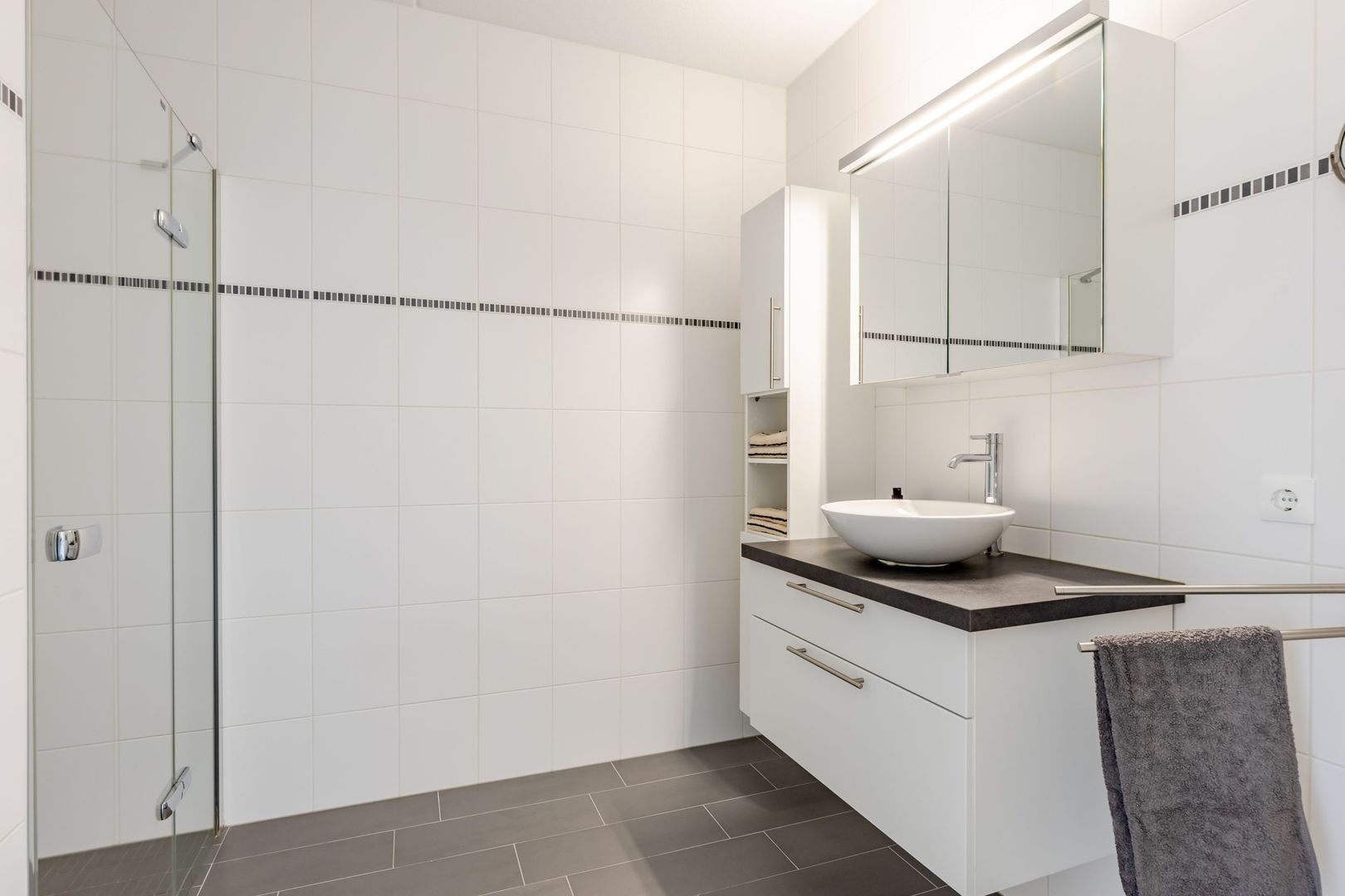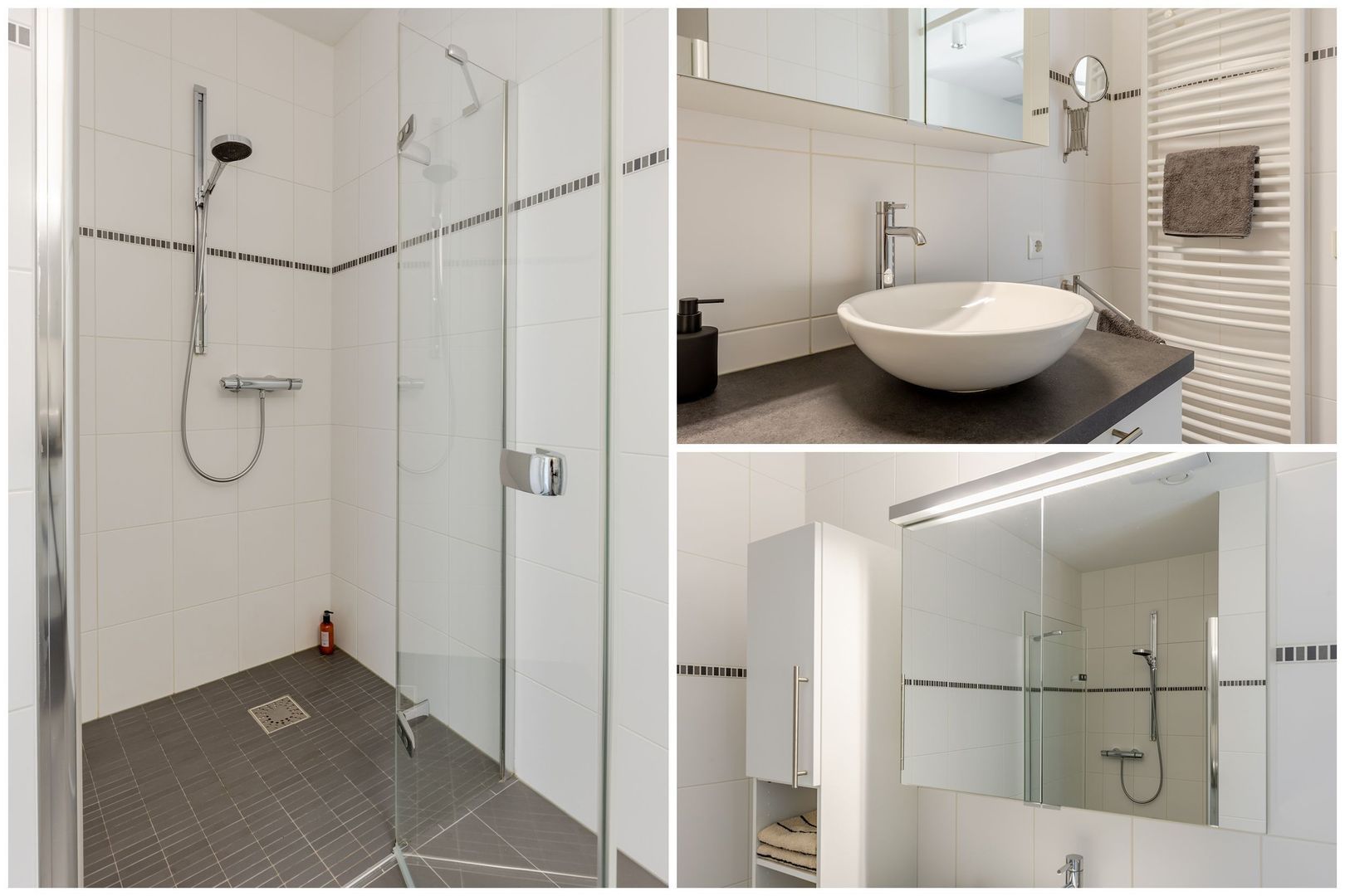 De badkamer is tijdloos en ingericht met een inloopdouche, een wastafelmeubel en een design radiator. De vloer is behaaglijk warm door de vloerverwarming.