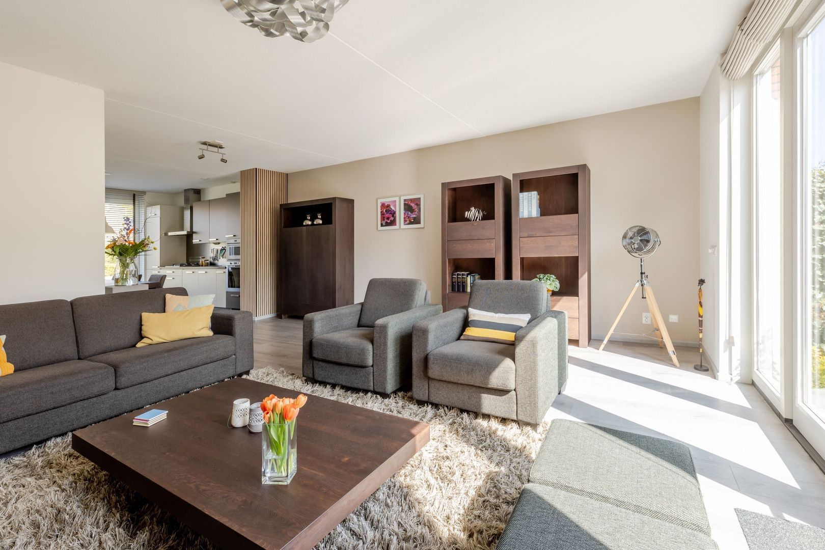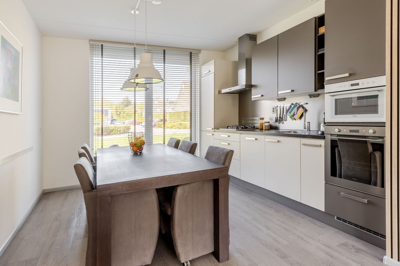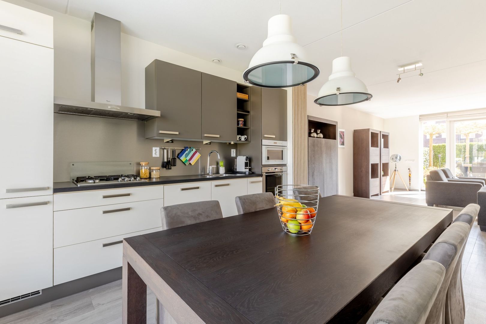 De leefruimte bestaat uit een tuingerichte woonkamer die bijzonder licht is vanwege de openslaande deuren en de plafondhoge ramen. De keuken bevindt zich aan de voorkant van de woning. Ook hier grote ramen en veel licht. De moderne wand opgestelde inrichting is uitgevoerd in twee kleuren en voorzien van inbouwapparatuur.