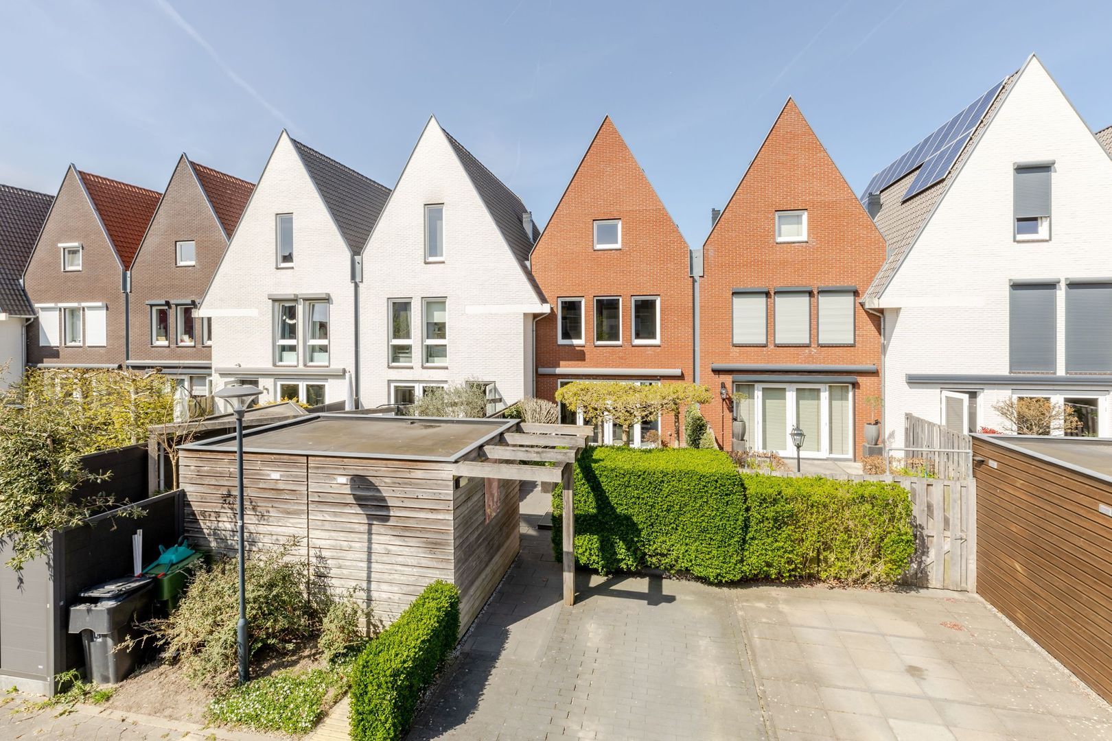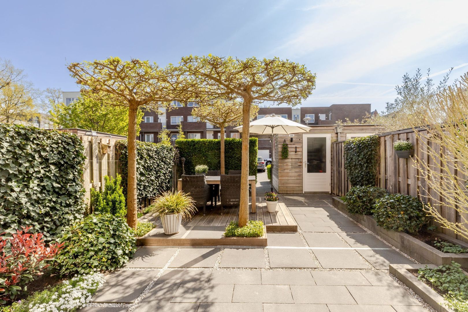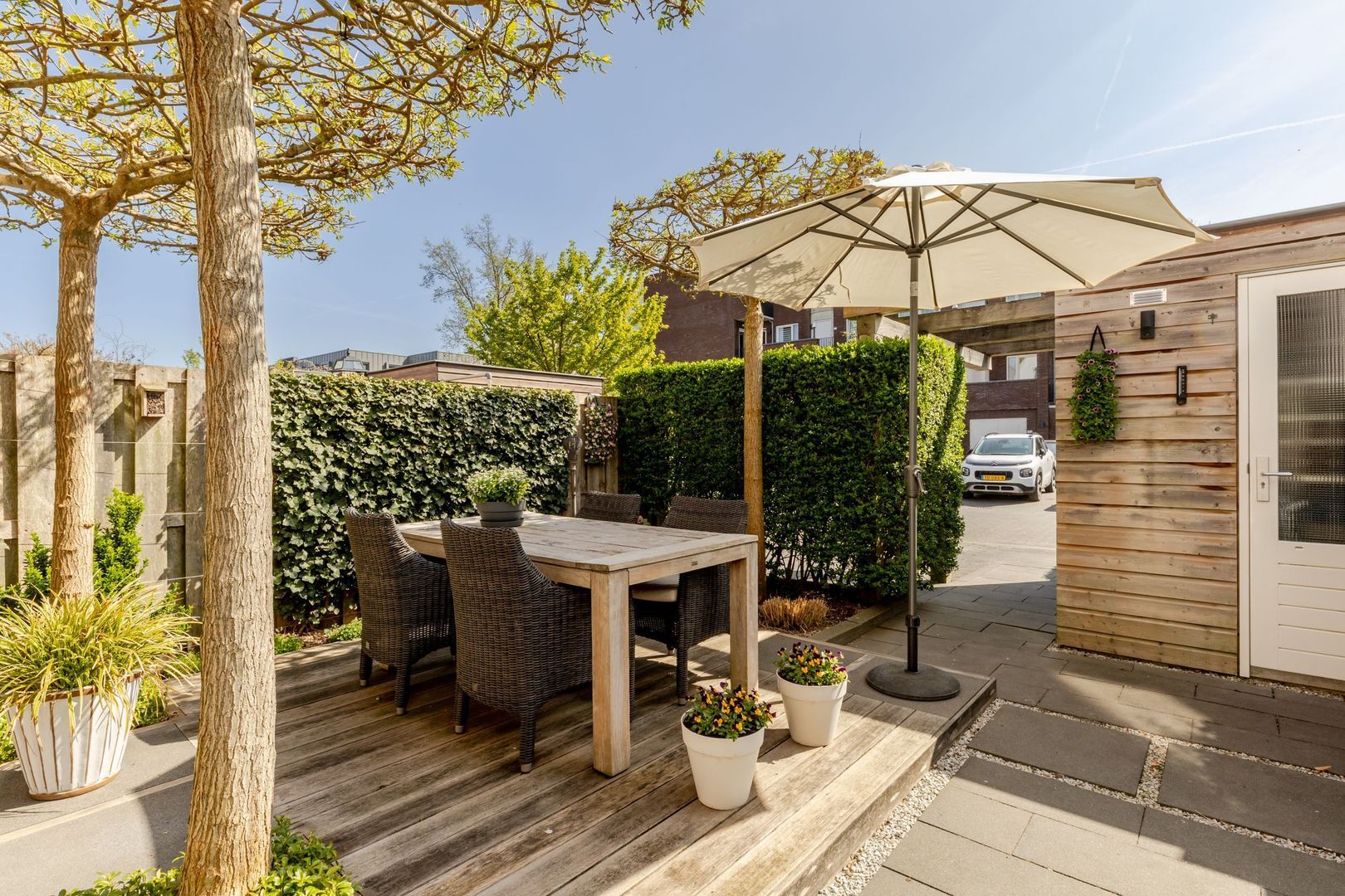 De achtertuin ligt op het zuidoosten en deze is fraai aangelegd en onderhouden. Achterin staat een houten berging. Op de achtergevel is een buitenkraan aangebracht. De parkeerplaats op eigen terrein ligt uit het zicht achter de groene haag.