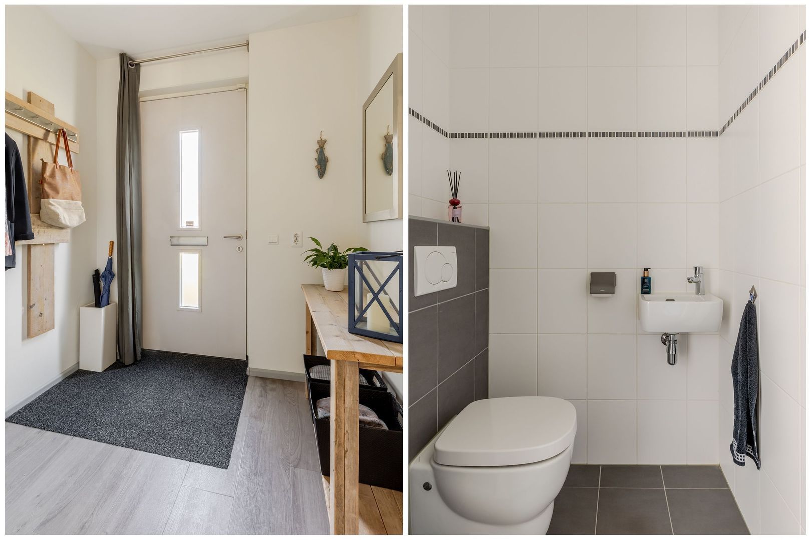 entree, ruime hal met garderoberuimte, modern toilet en grote, praktische trapkast.