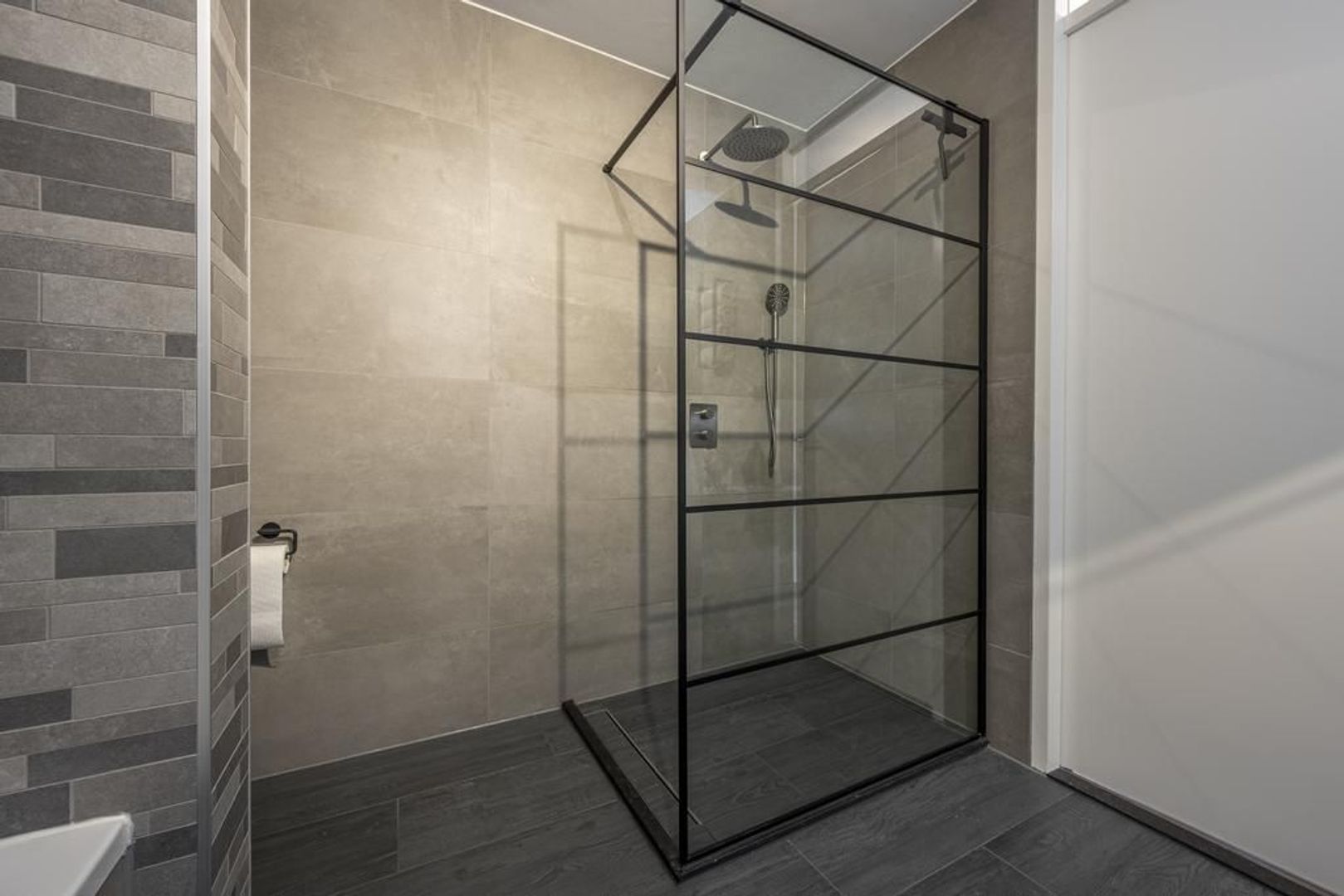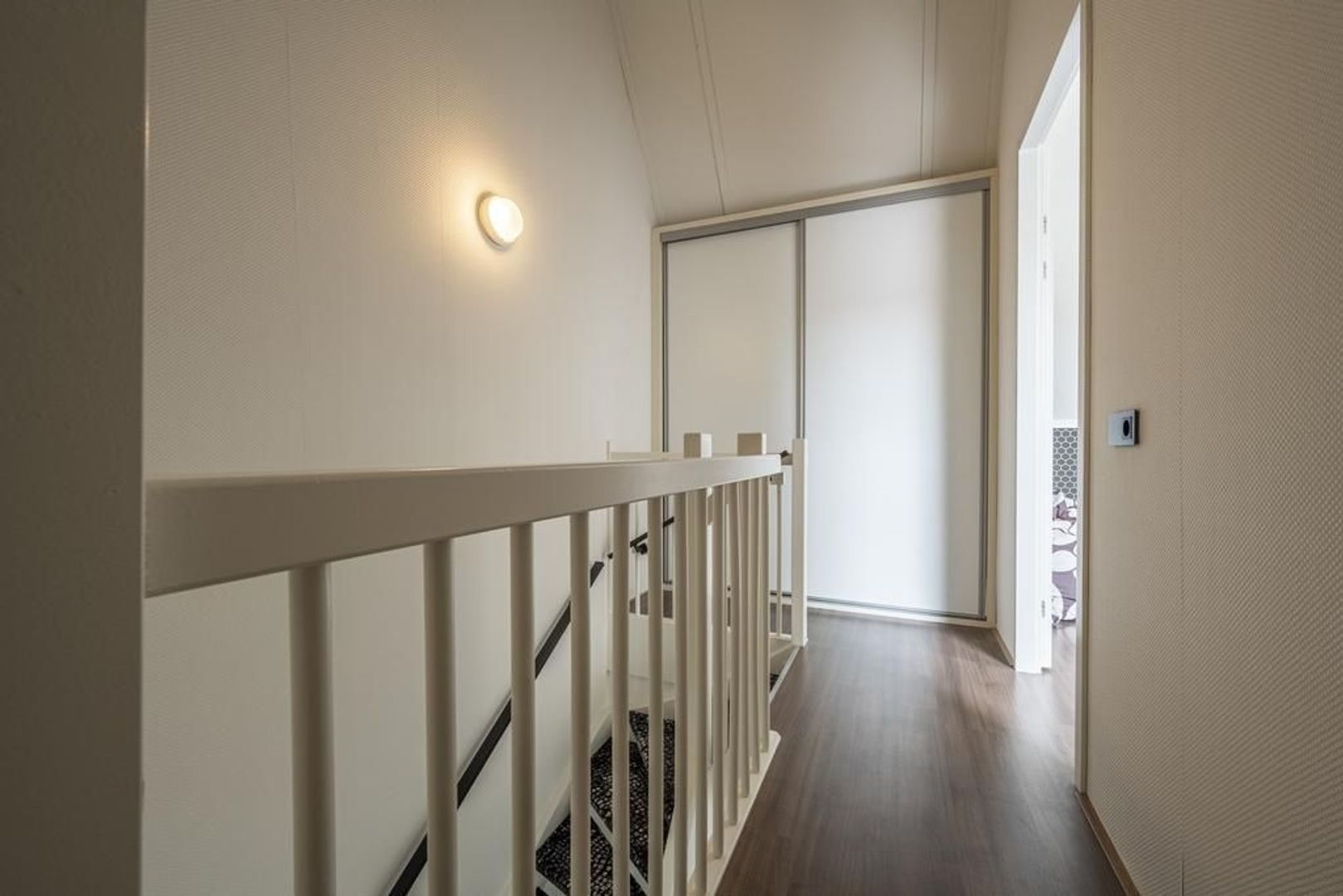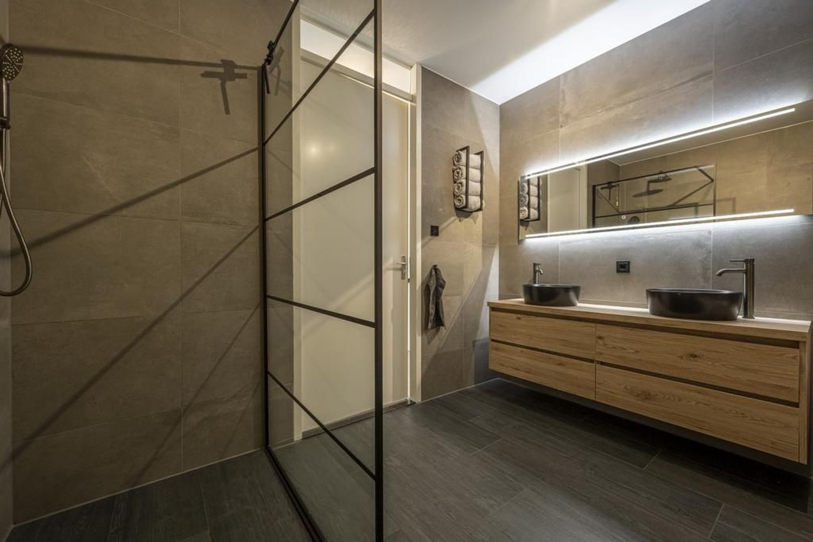 Op de eerste verdieping is de indeling gewijzigd en er zijn nu twee grote slaapkamers en een nieuwe badkamer. Deze is dankzij de vergroting nu extra ruim en is prachtig ingericht met een wastafelmeubel met kommen, een inloopdouche, een ligbad en een tweede toilet.