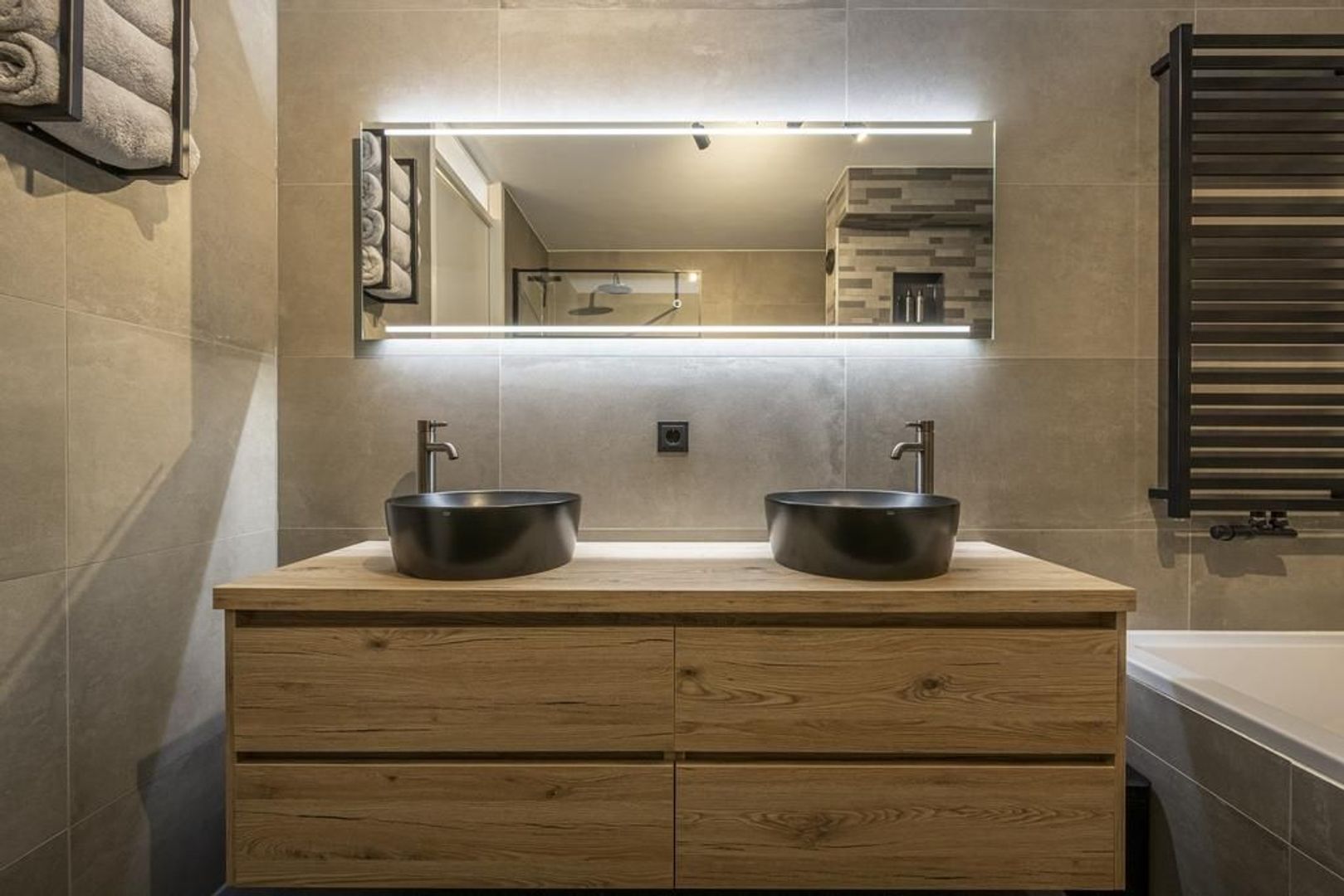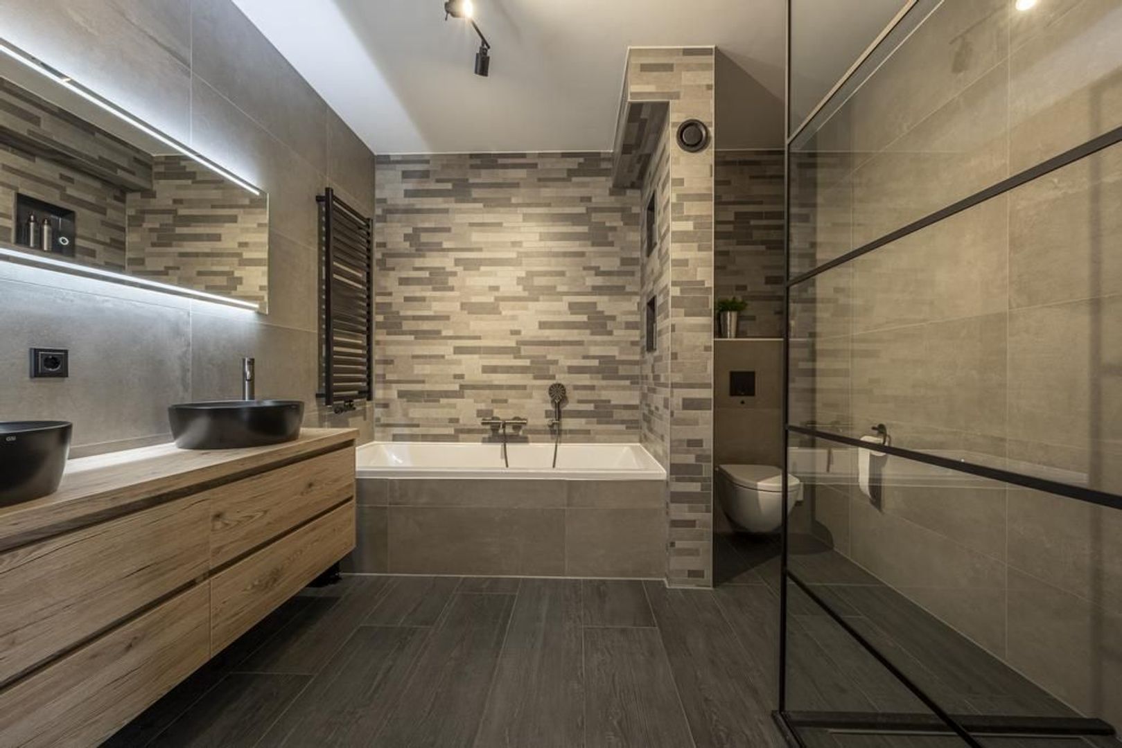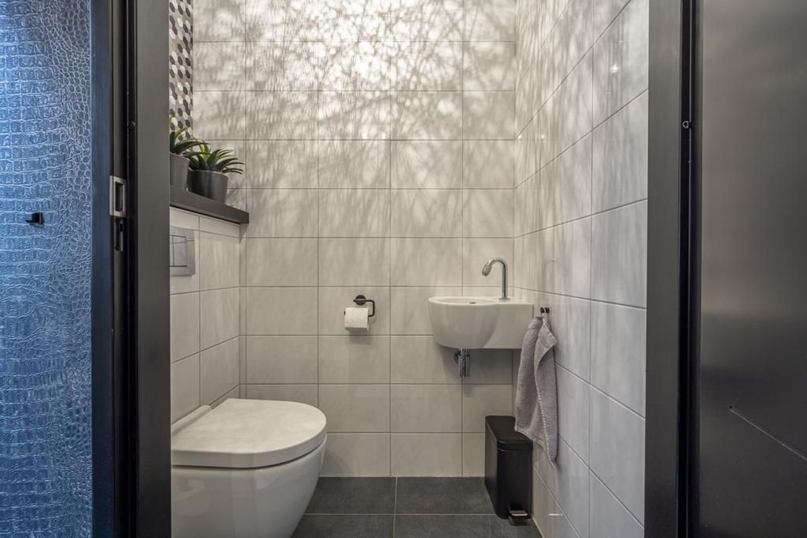 Op de eerste verdieping is de indeling gewijzigd en er zijn nu twee grote slaapkamers en een nieuwe badkamer. Deze is dankzij de vergroting nu extra ruim en is prachtig ingericht met een wastafelmeubel met kommen, een inloopdouche, een ligbad en een tweede toilet.
