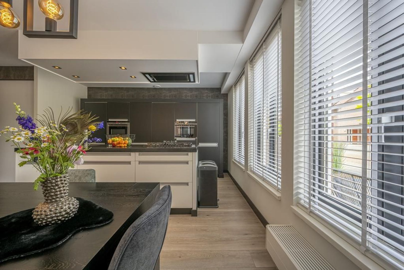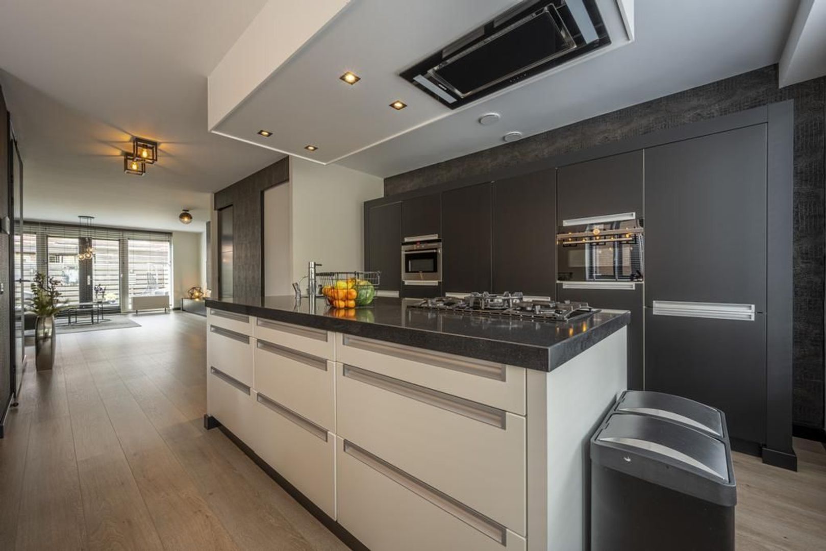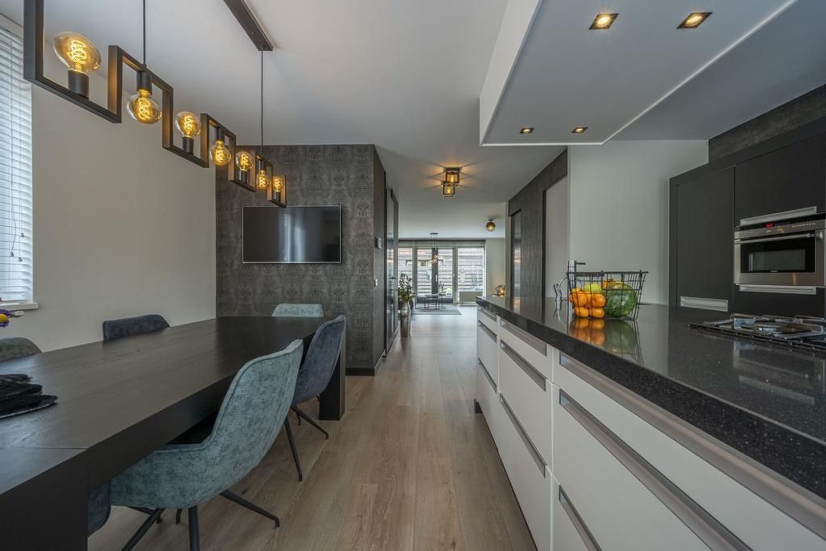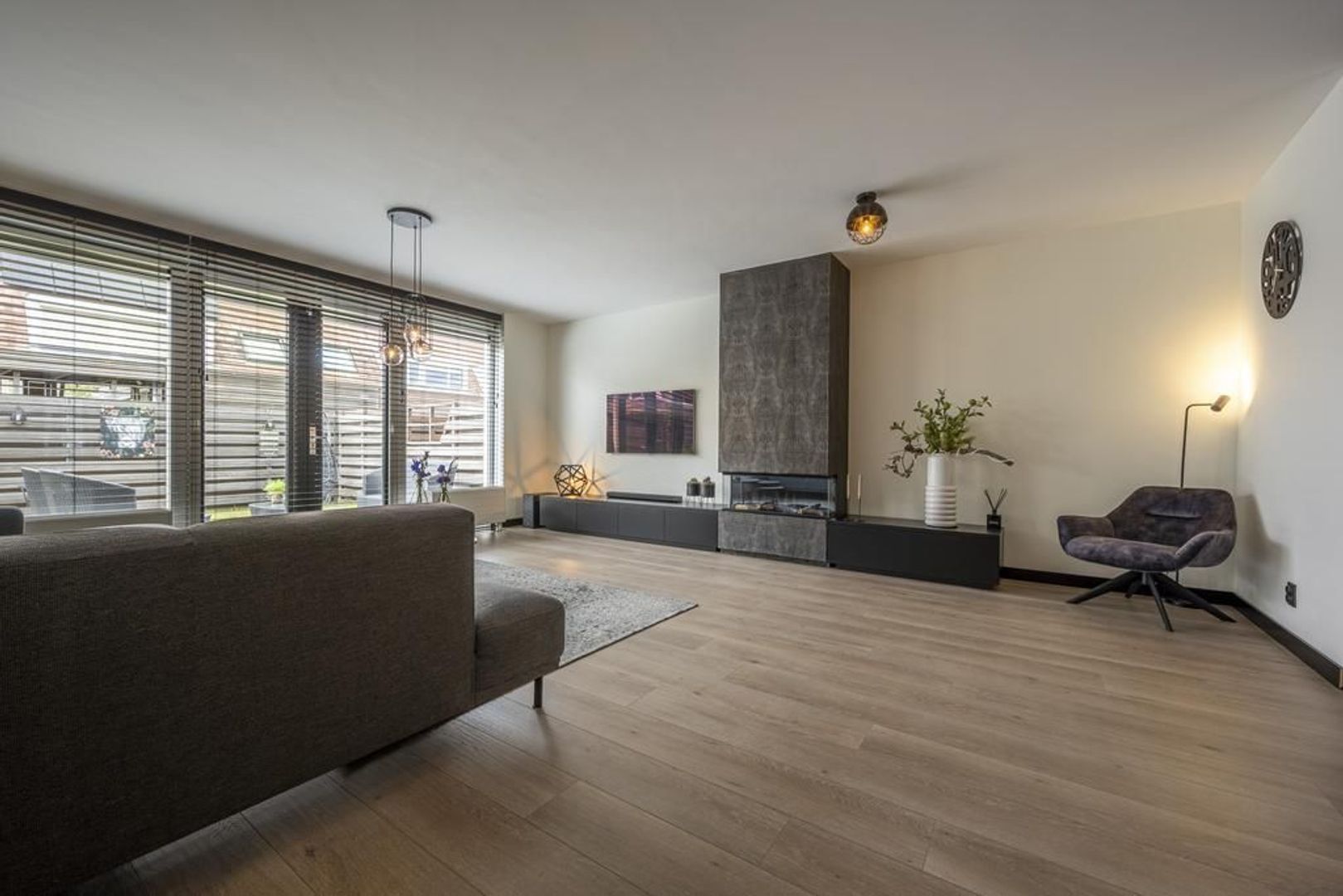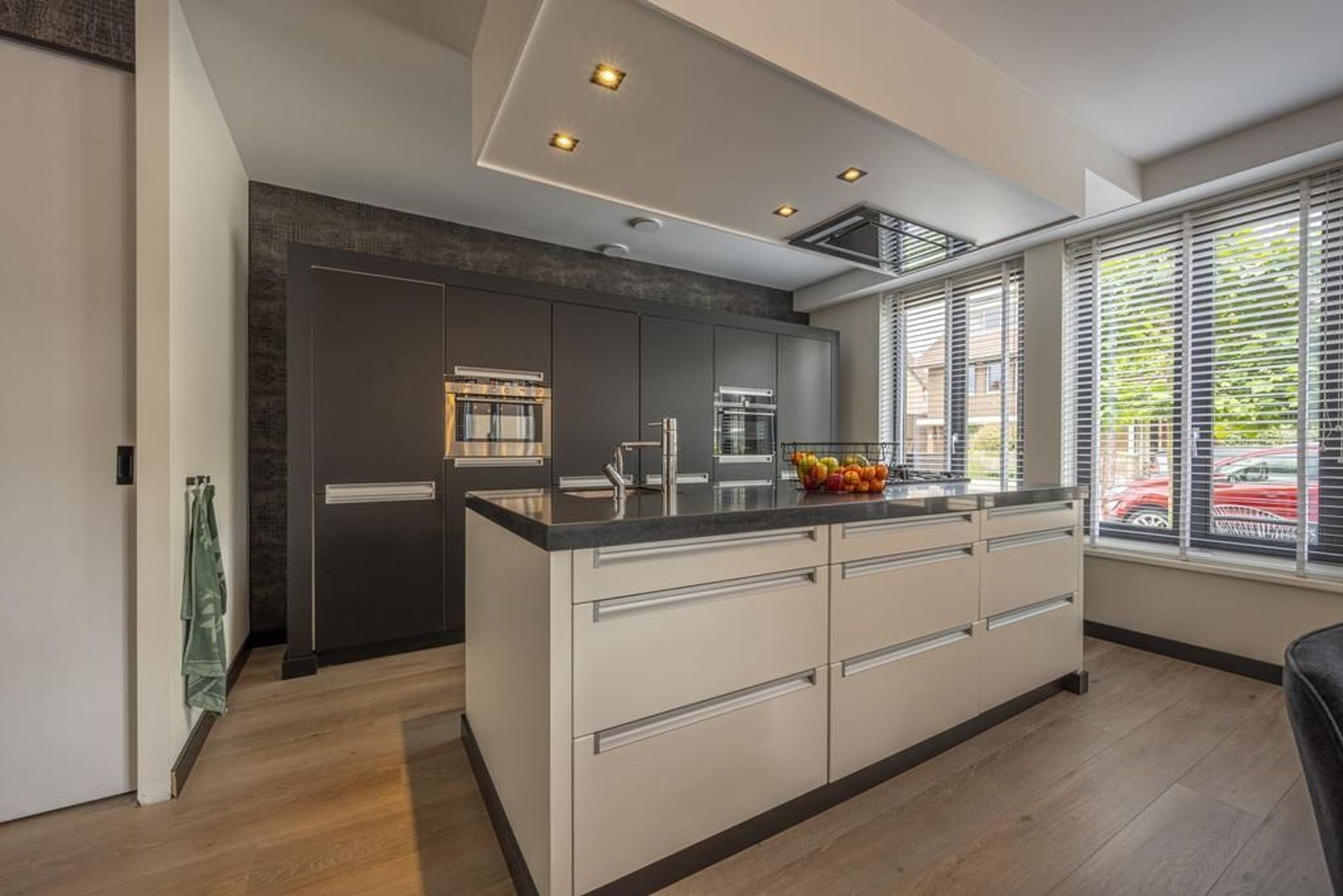 De keukeninrichting bestaat uit een wandopstelling en solitair eiland en is uitgevoerd met complete inbouwapparatuur, natuurstenen aanrechtblad en een Quooker. De woonkamer beschikt over openslaande deuren naar de tuin en een elektrische haard.