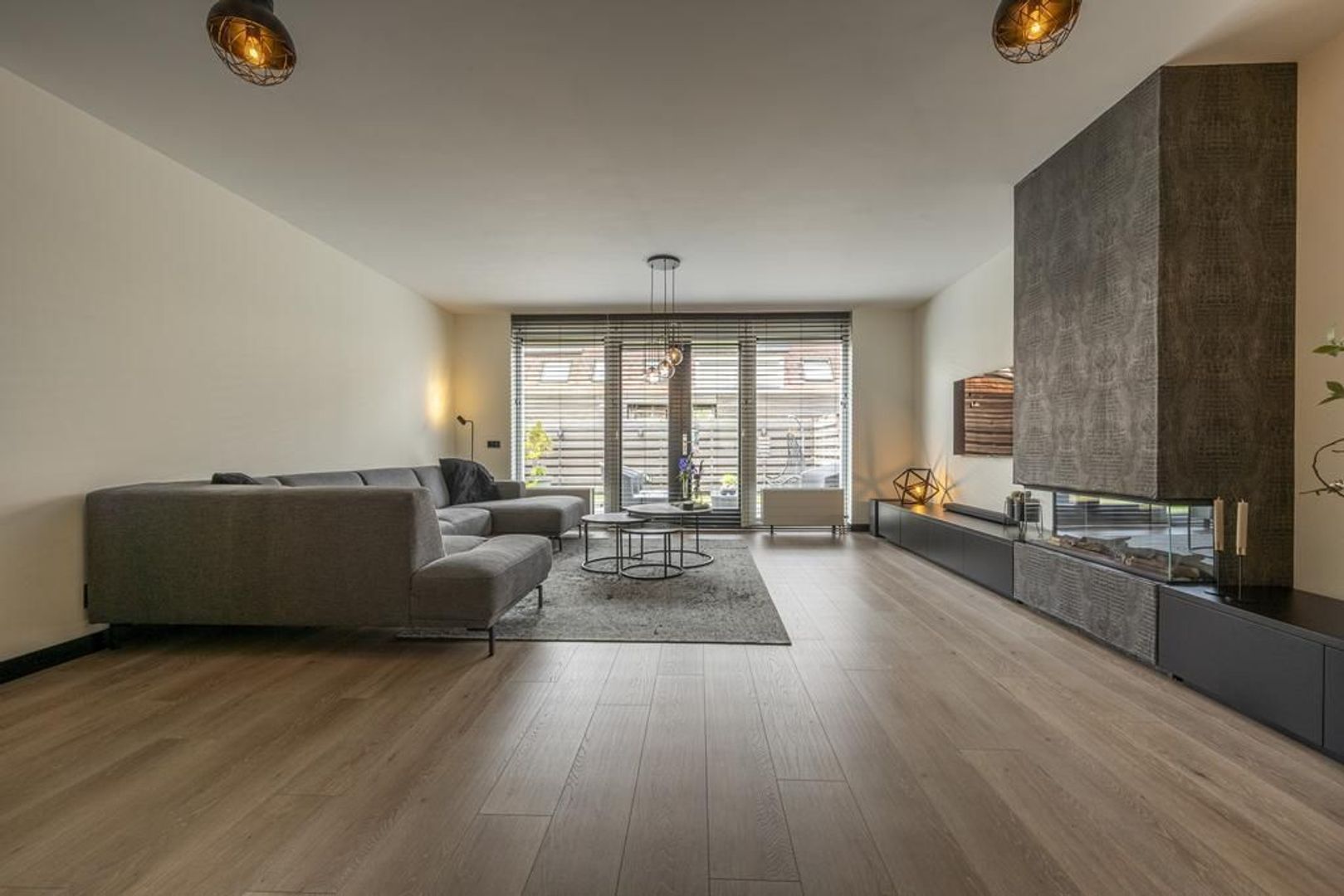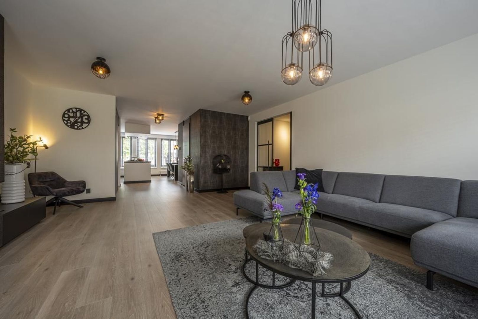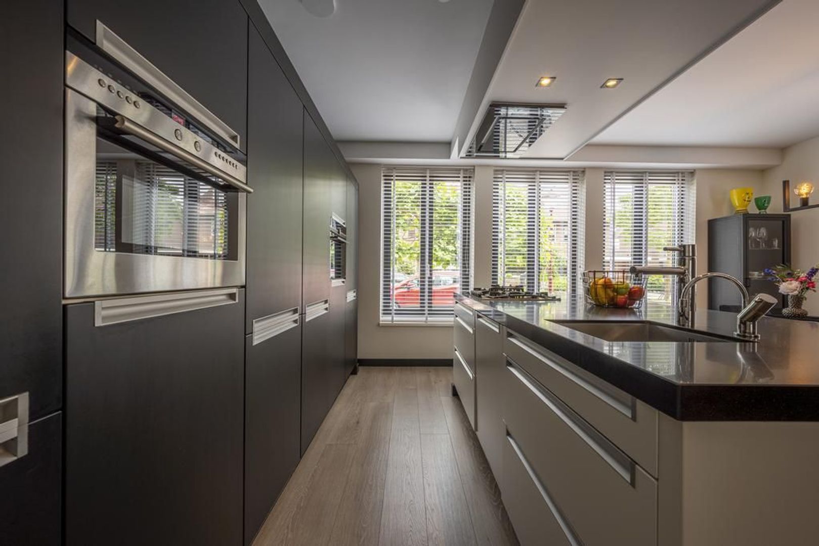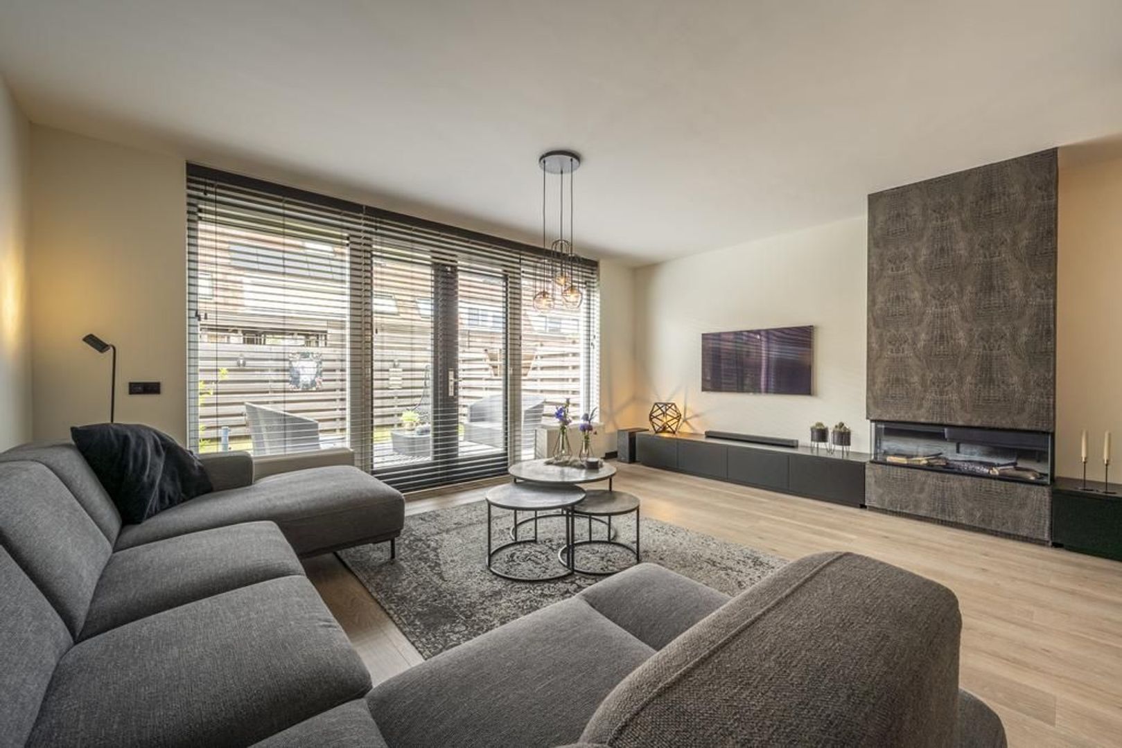 De keukeninrichting bestaat uit een wandopstelling en solitair eiland en is uitgevoerd met complete inbouwapparatuur, natuurstenen aanrechtblad en een Quooker. De woonkamer beschikt over openslaande deuren naar de tuin en een elektrische haard.
