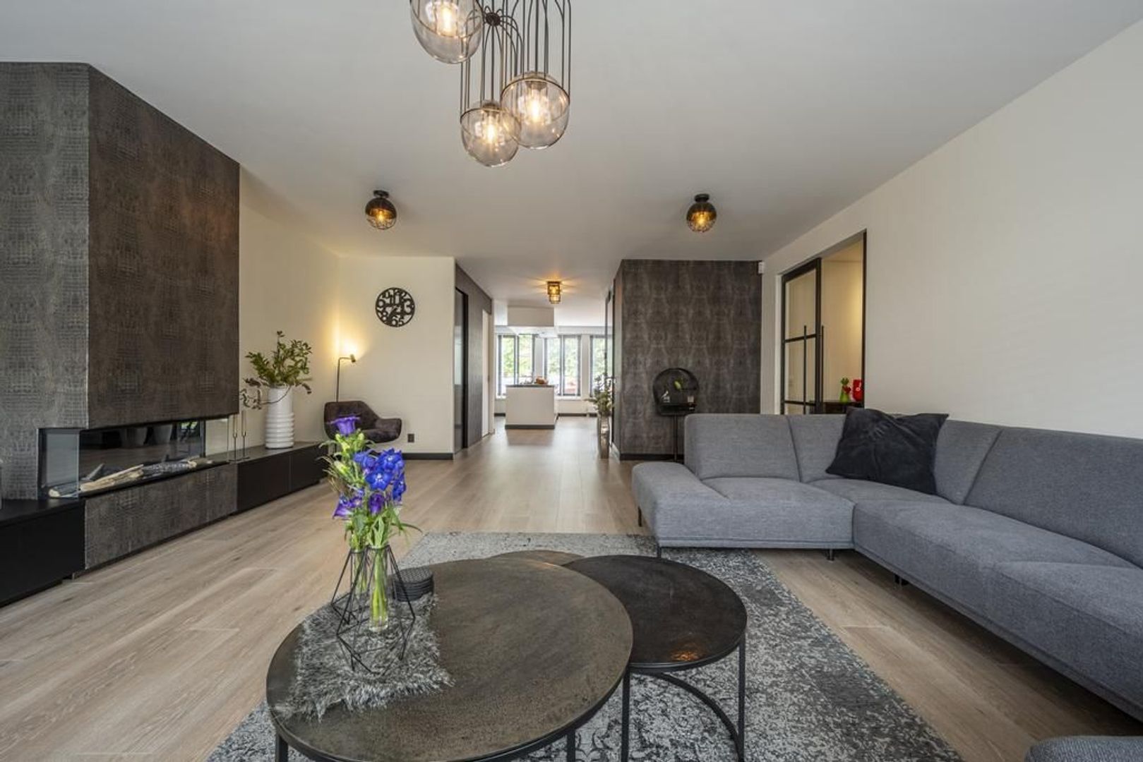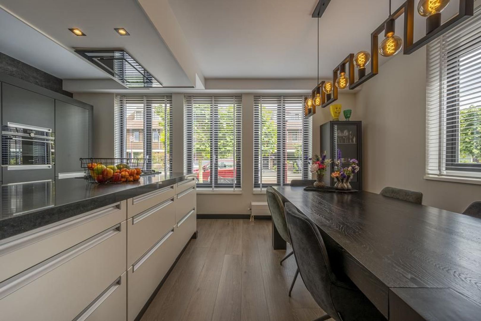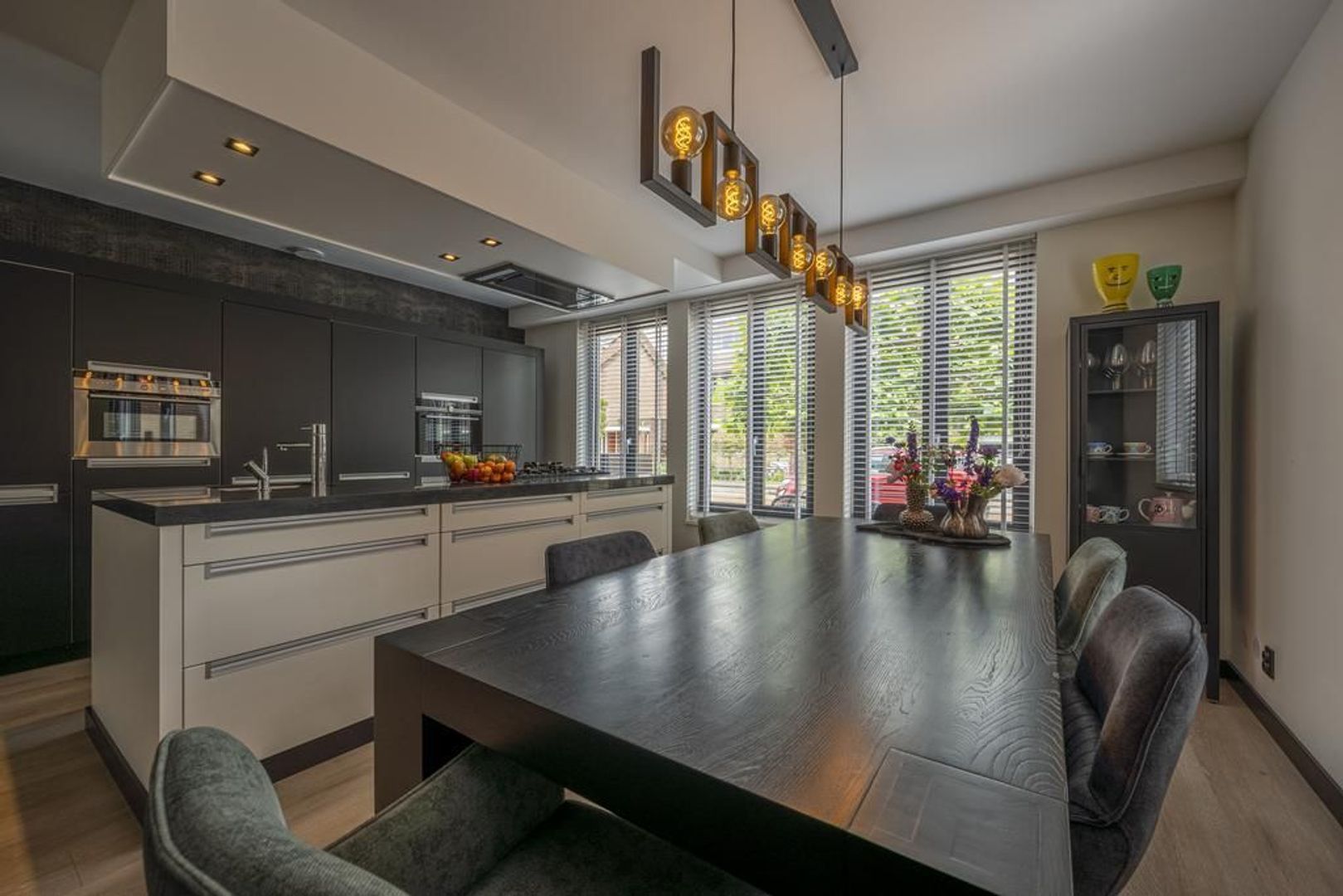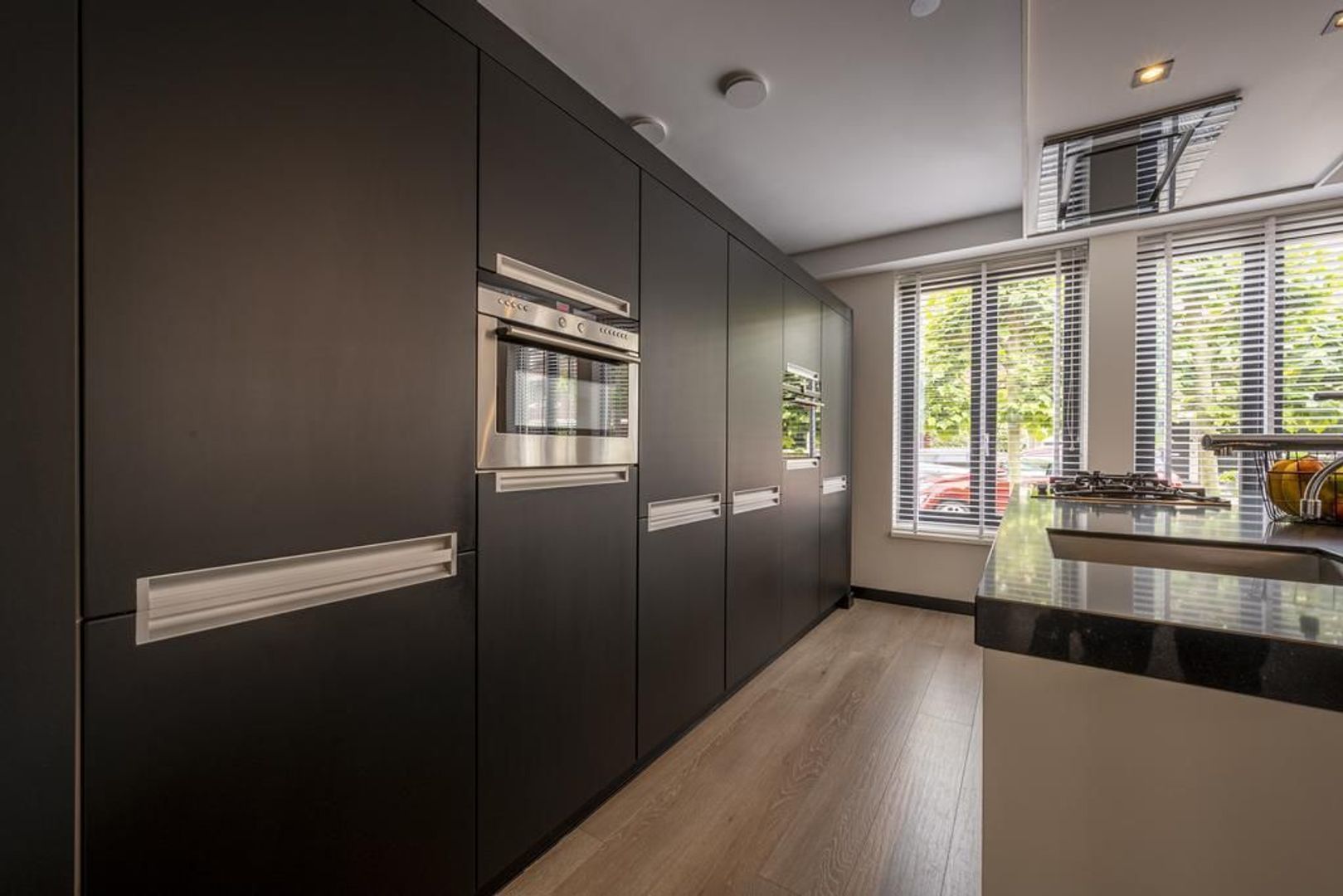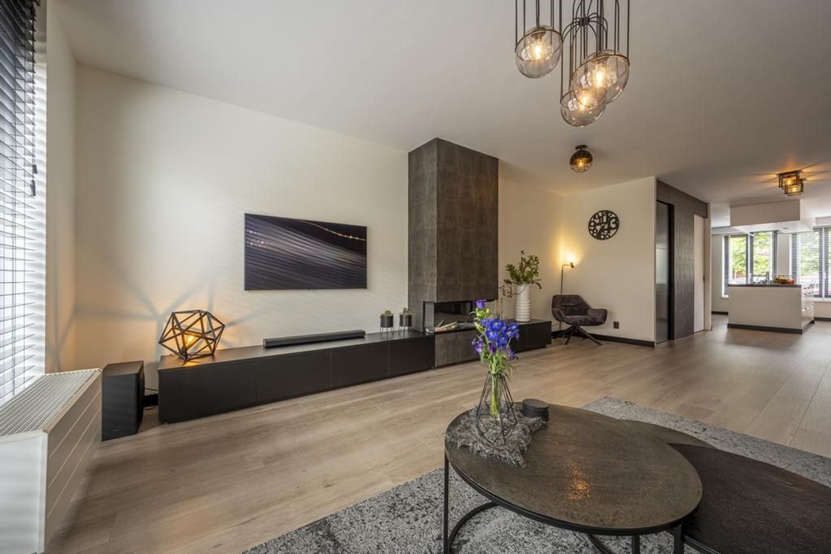 De keukeninrichting bestaat uit een wandopstelling en solitair eiland en is uitgevoerd met complete inbouwapparatuur, natuurstenen aanrechtblad en een Quooker. De woonkamer beschikt over openslaande deuren naar de tuin en een elektrische haard.
