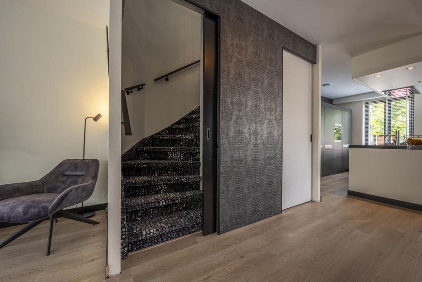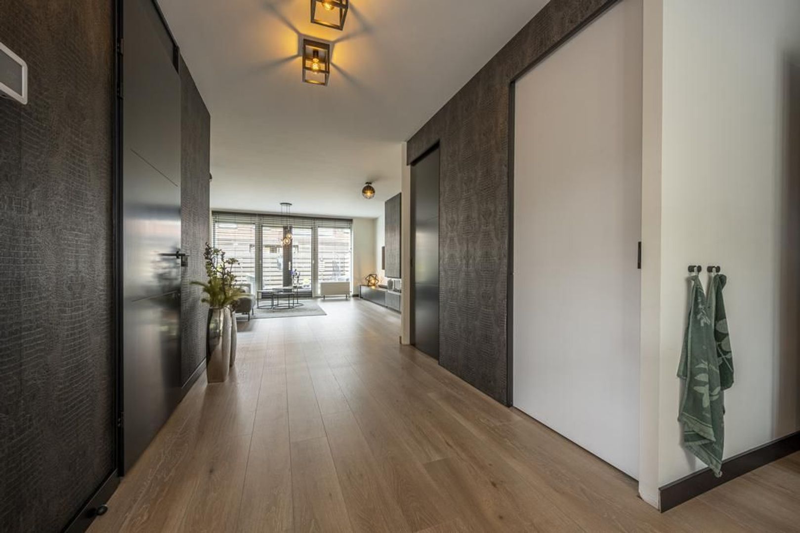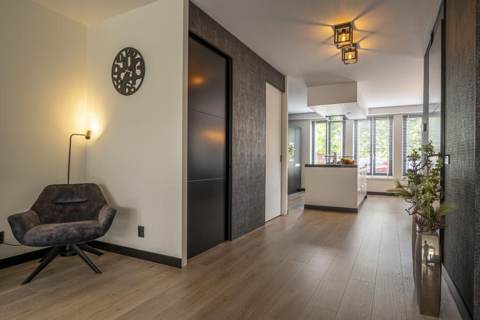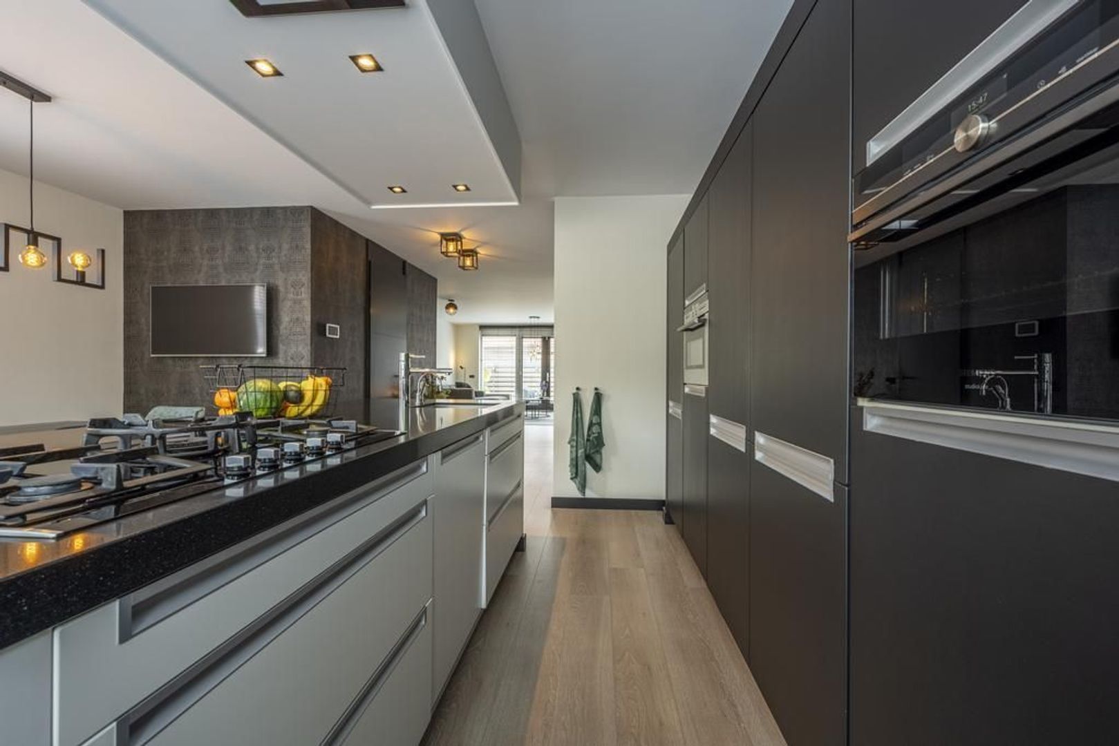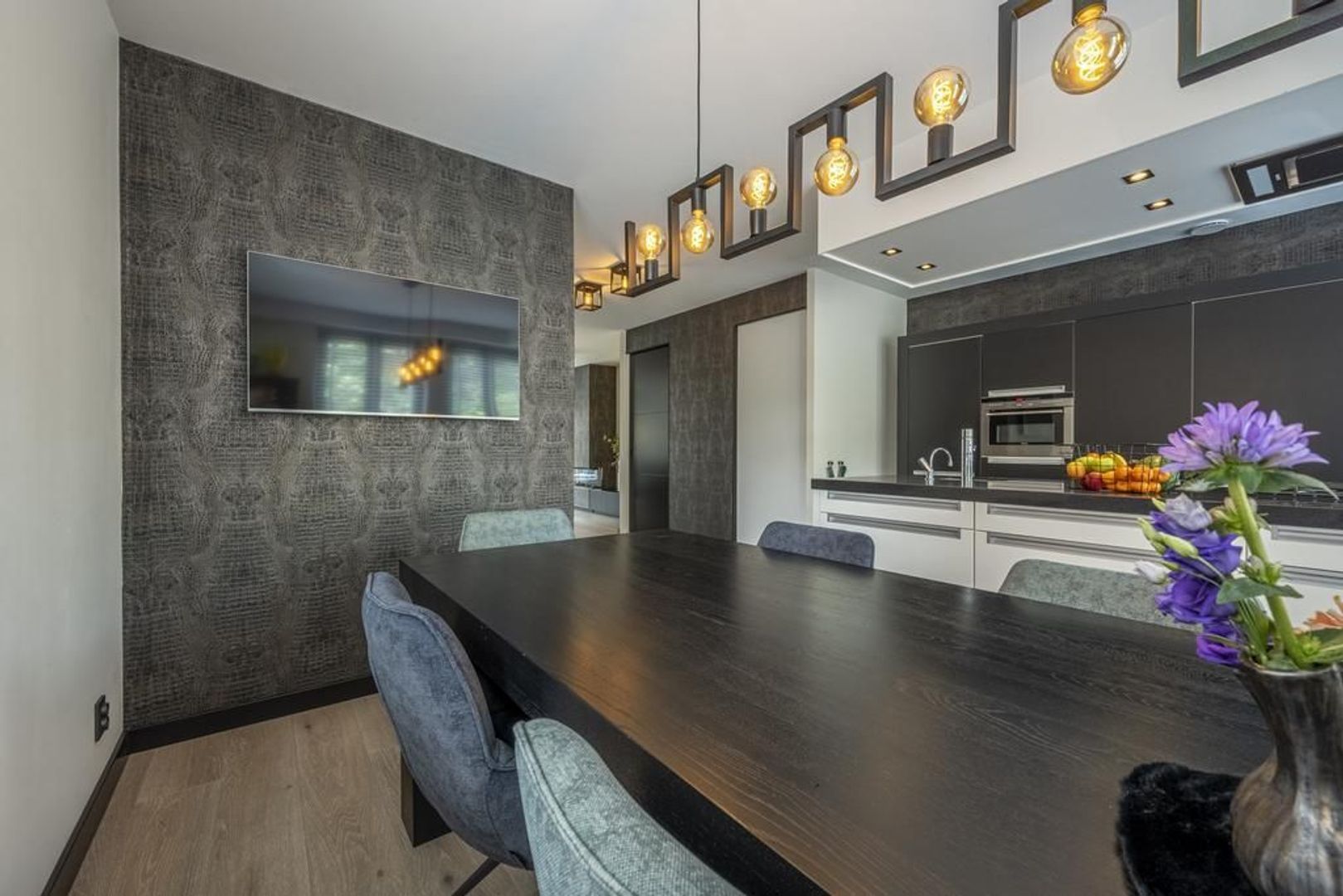 De keukeninrichting bestaat uit een wandopstelling en solitair eiland en is uitgevoerd met complete inbouwapparatuur, natuurstenen aanrechtblad en een Quooker. De woonkamer beschikt over openslaande deuren naar de tuin en een elektrische haard.