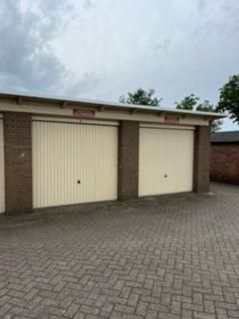 De garage is in steen opgetrokken en heeft een handbediende kanteldeur. Het dak is voorzien van bitumineuze dakbedekking.