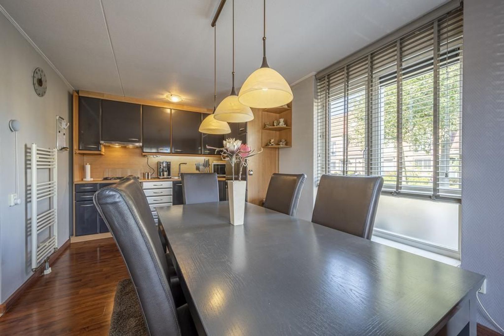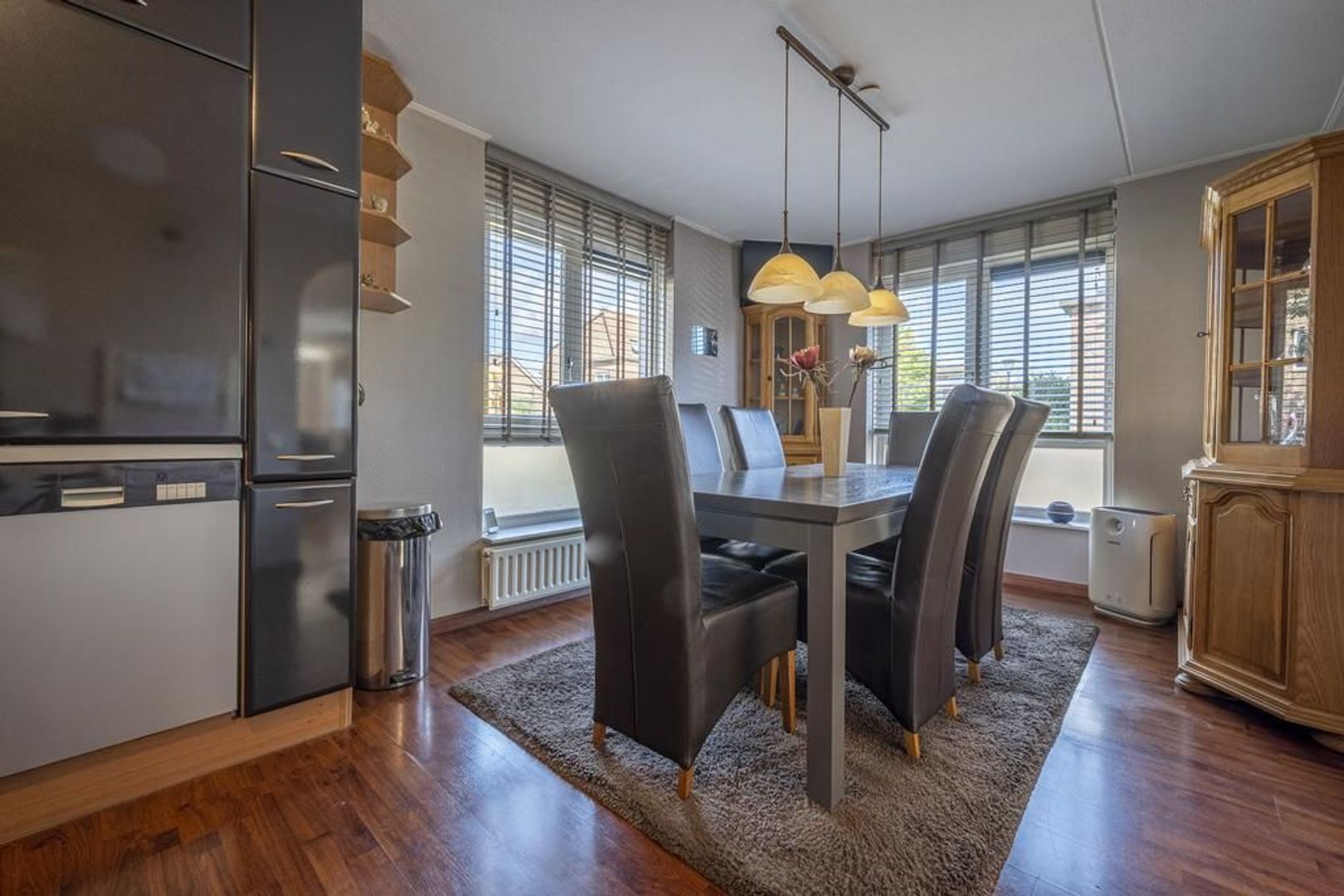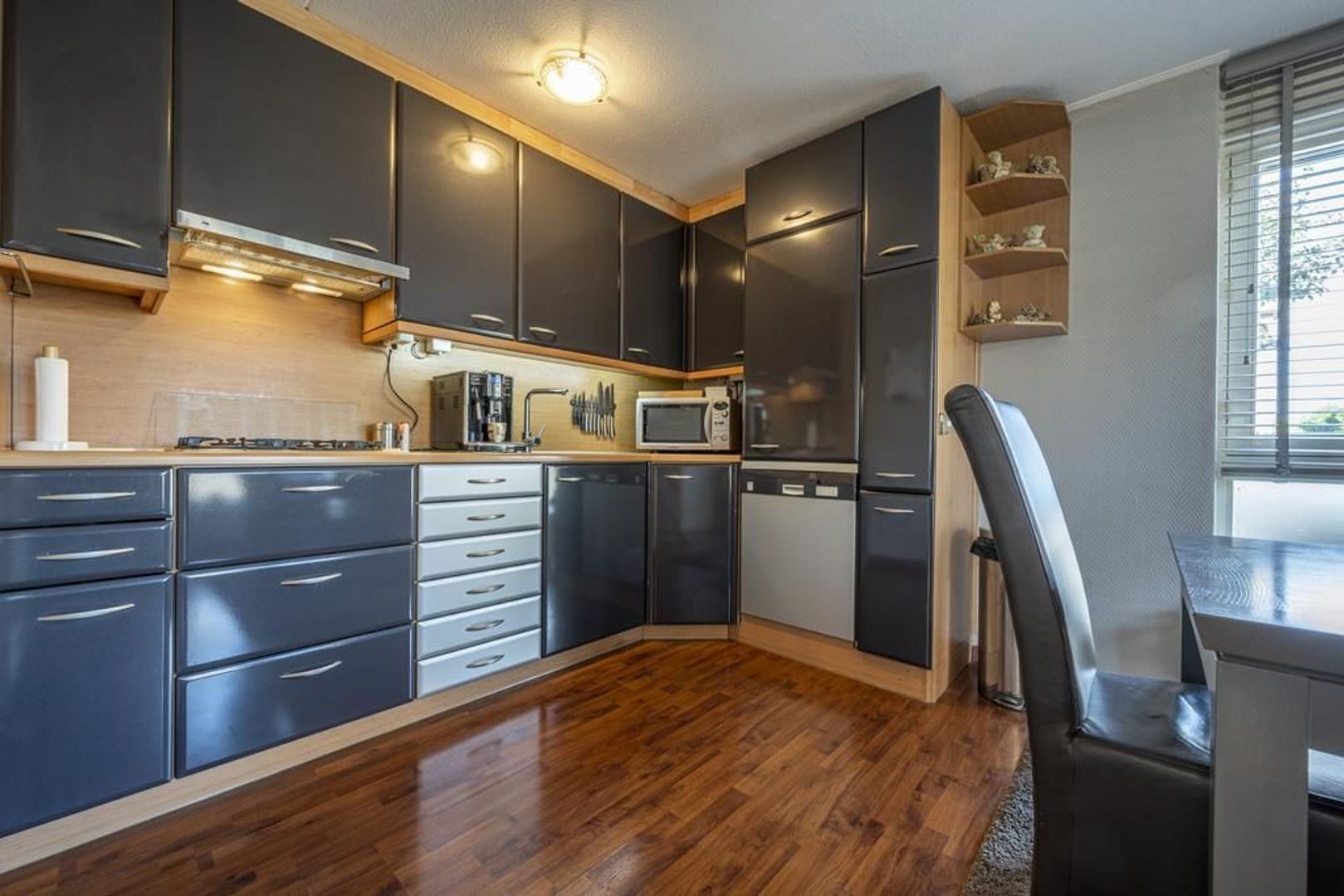 De (woon)keuken heeft een L-vormige inrichting en is uitgevoerd met inbouwapparatuur.