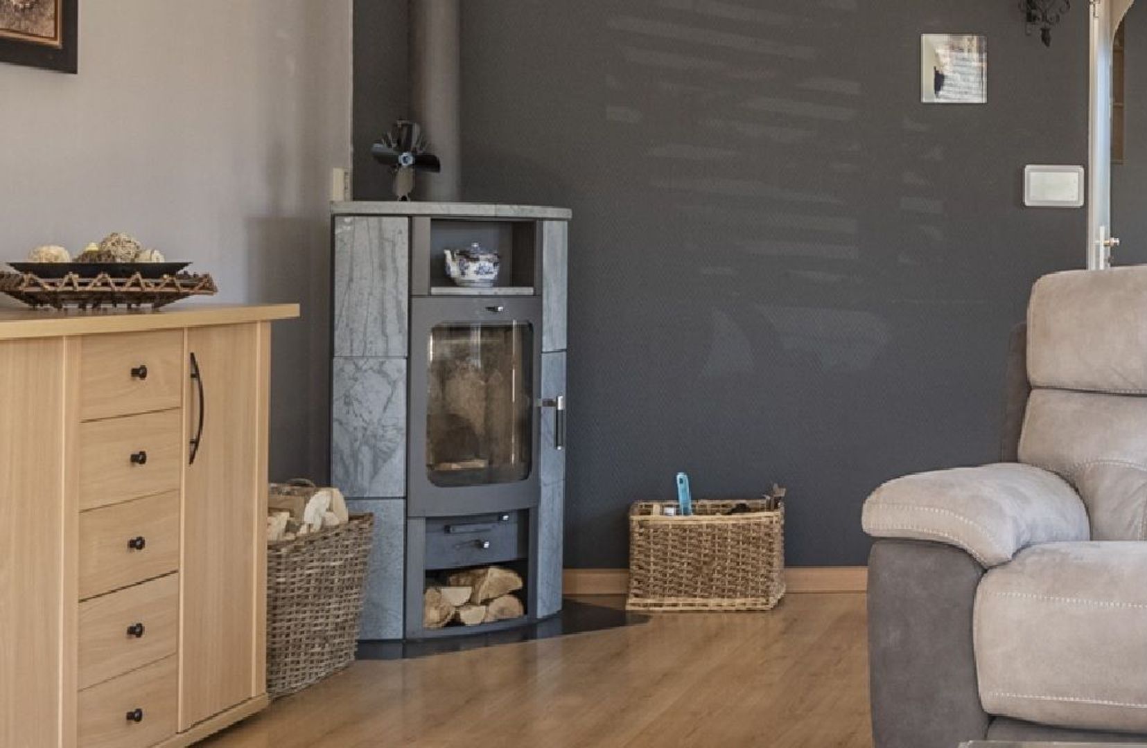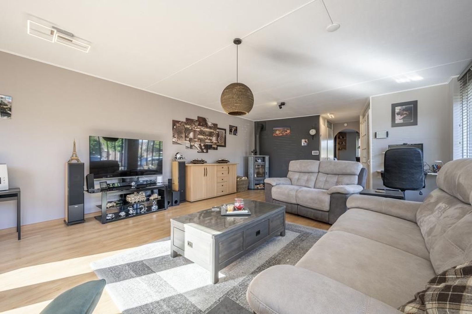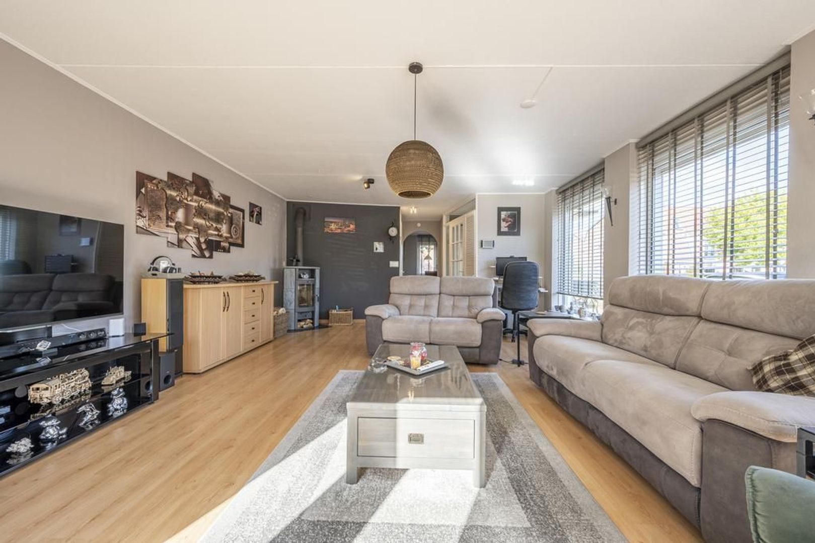 Woonkamer met openslaande deuren naar de tuin en gezellige houtkachel (speksteen); ideaal om de stookkosten laag te houden! De zijramen zorgen voor prettig lichtinval.