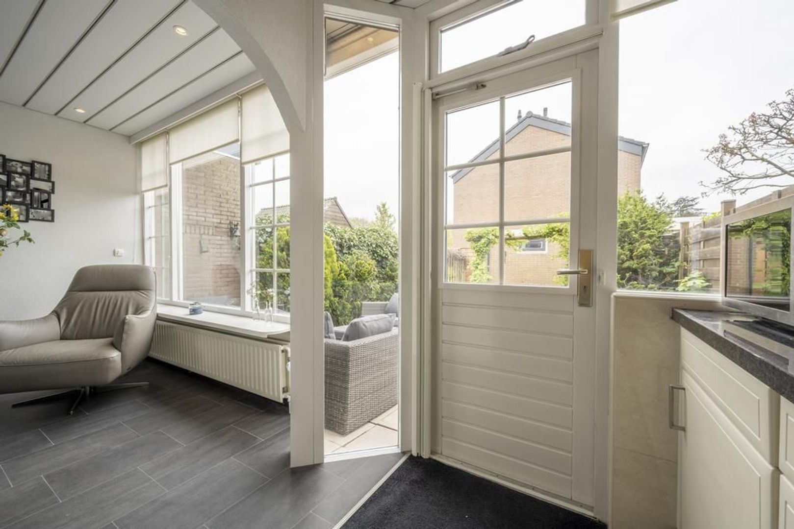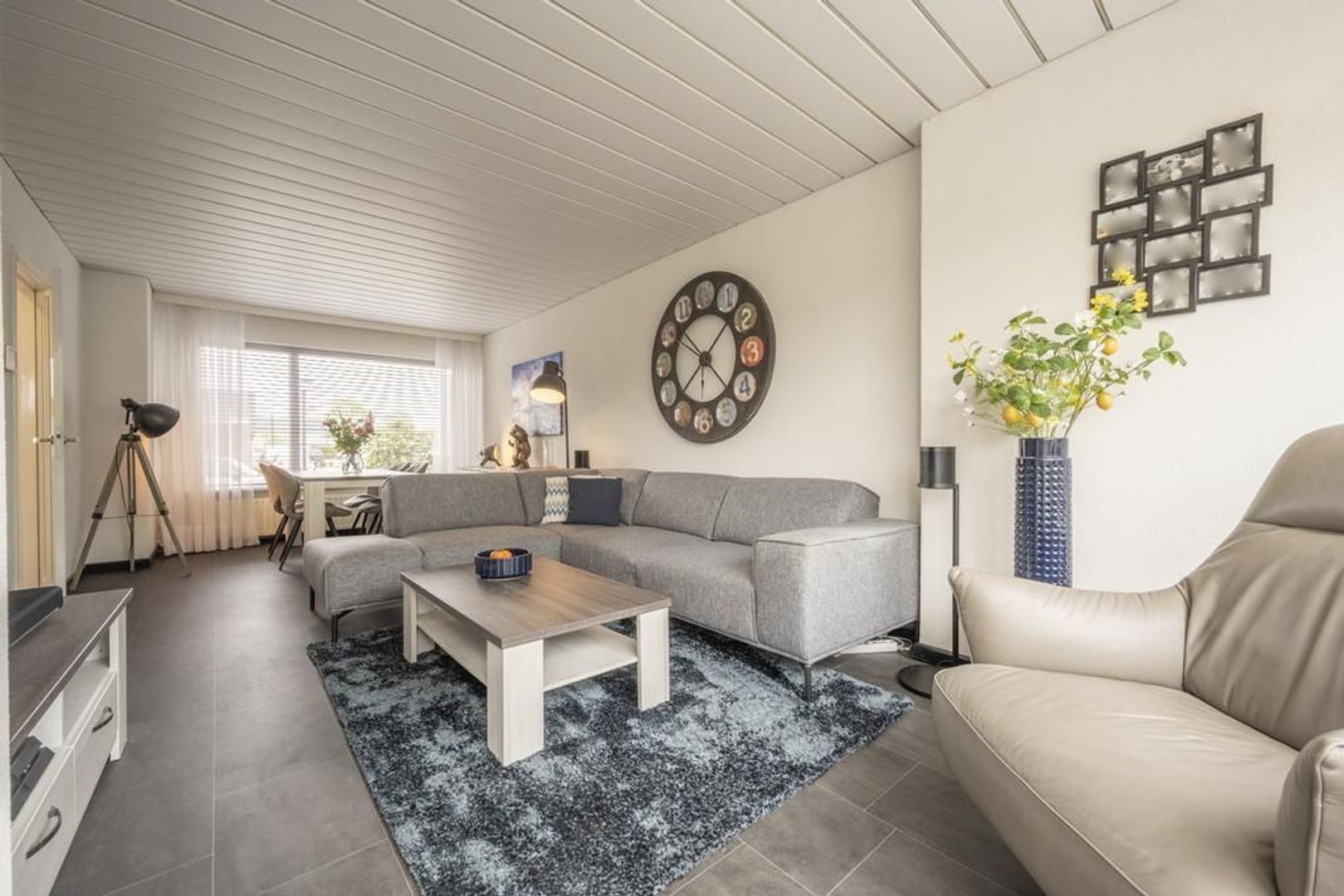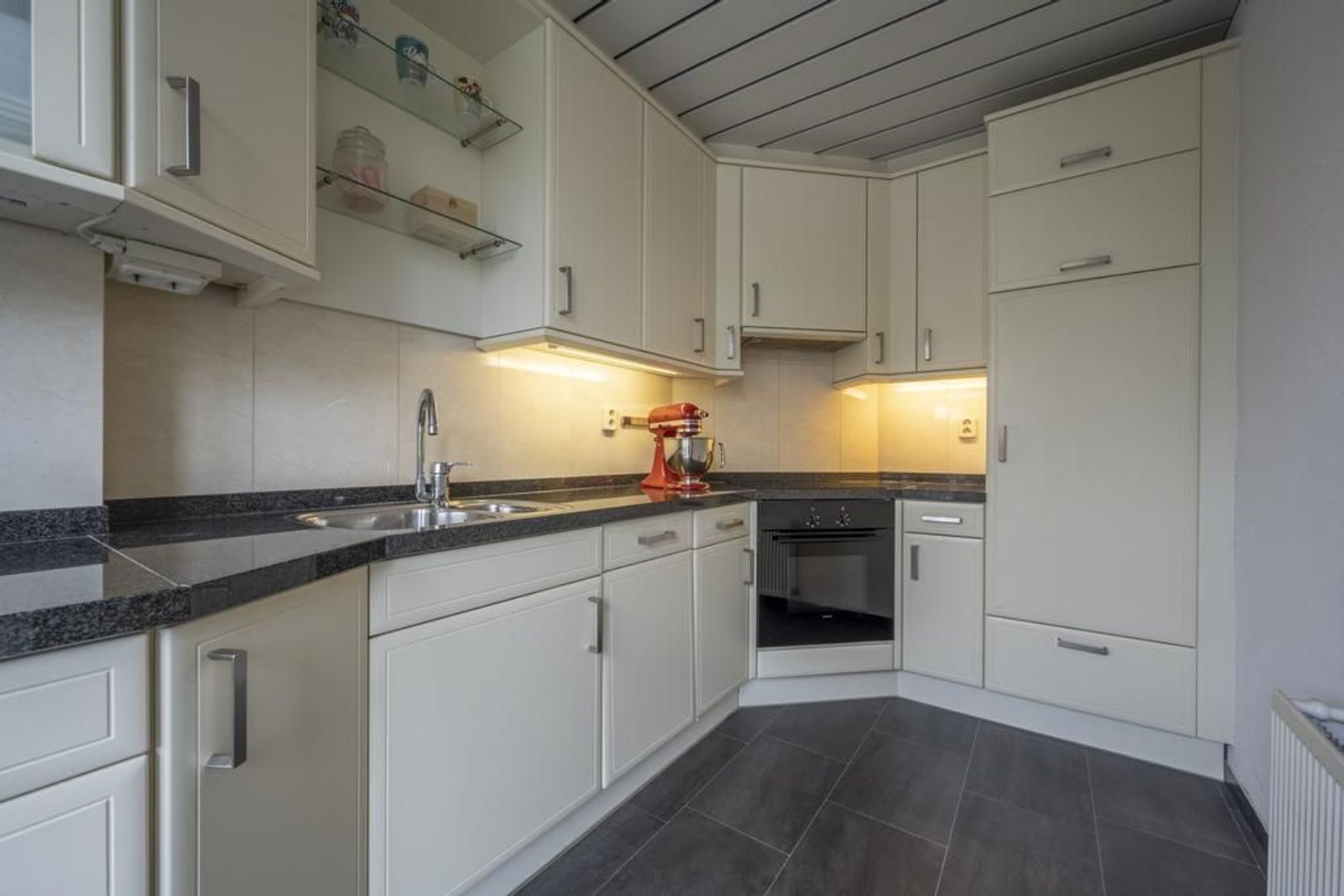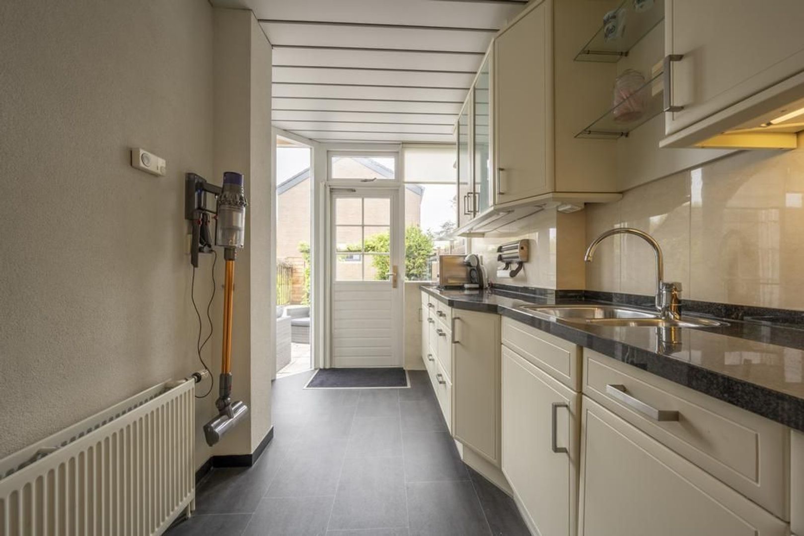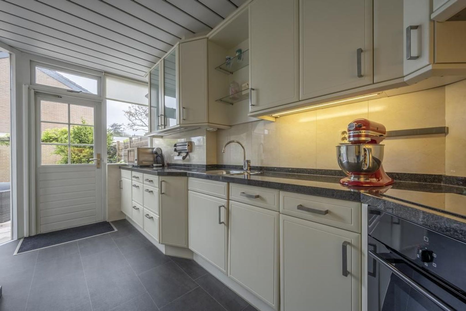 De woonkamer is lang en licht, door de grote glaspartijen aan de voor- en achterkant. Er is in het verleden een doorgang gemaakt van woonkamer naar de keuken, zodat er nu een halfopen keuken is. Deze heeft een wandopstelling en is uitgevoerd met een granieten aanrechtblad en diverse inbouwapparaten.