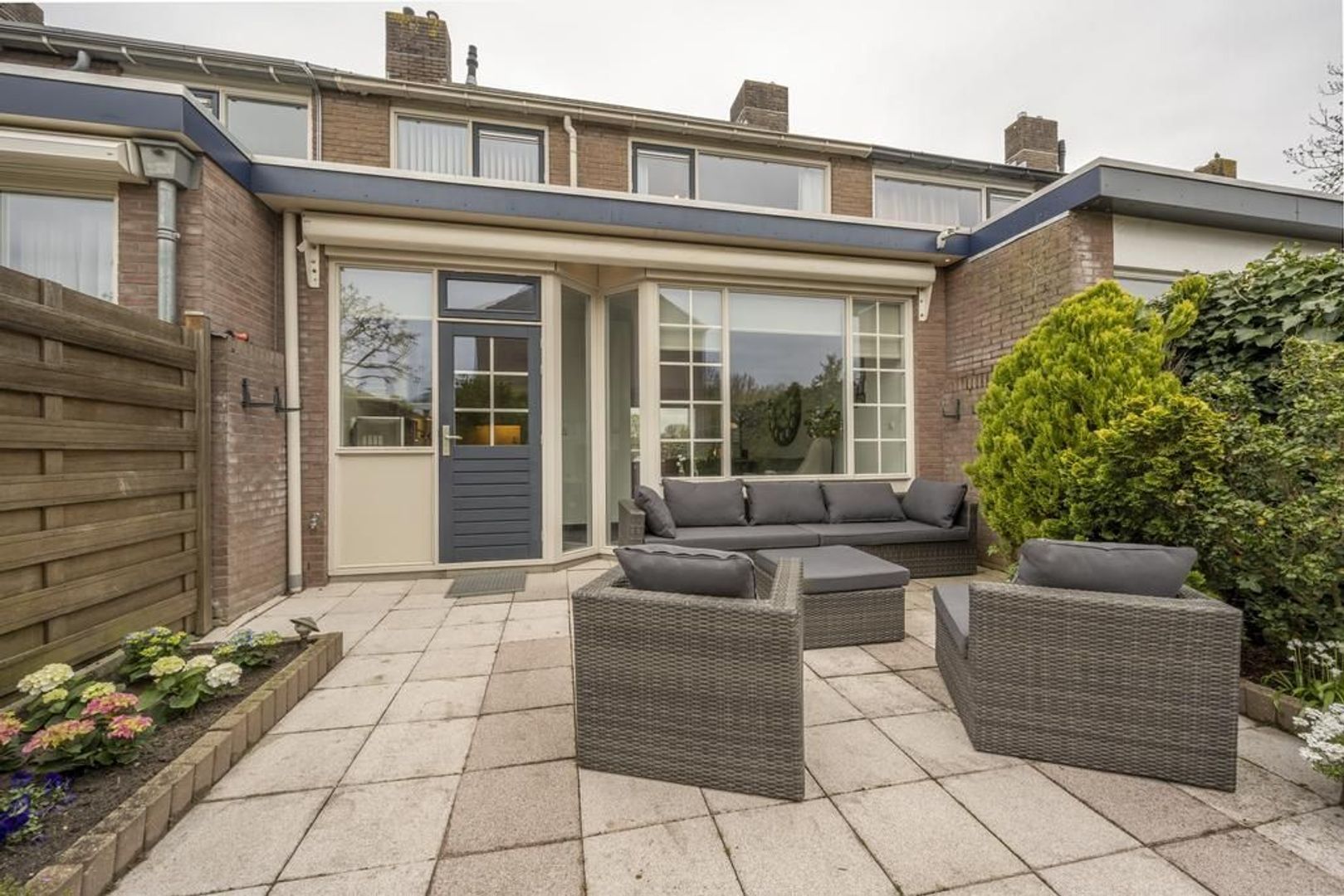 Aan de achtergevel is een fris gestreept zonnescherm aangebracht dat vanuit de woonkamer elektrisch te bedienen is. Het voorraam van de woning is voorzien van een elektrisch rolluik.