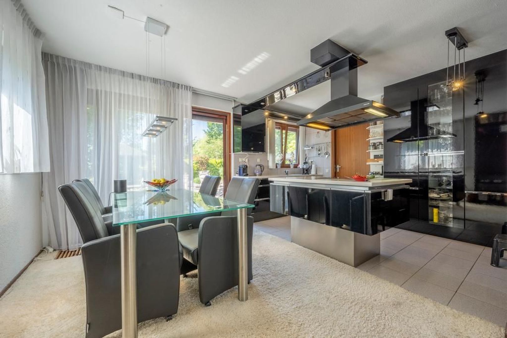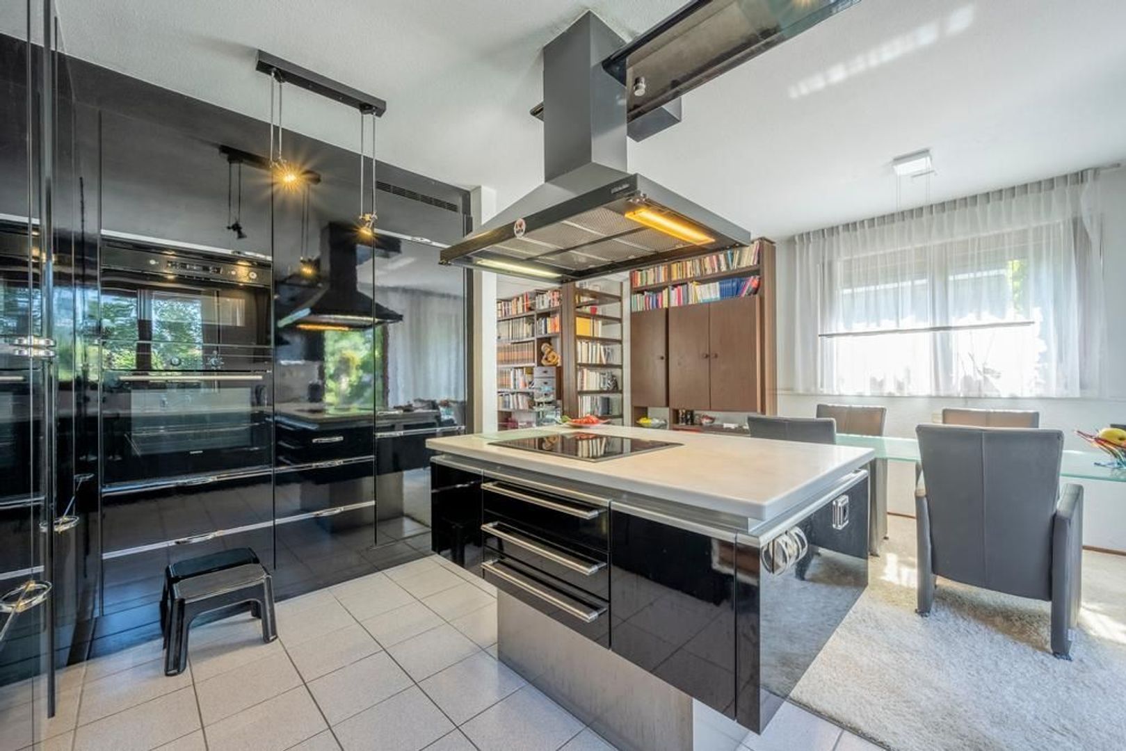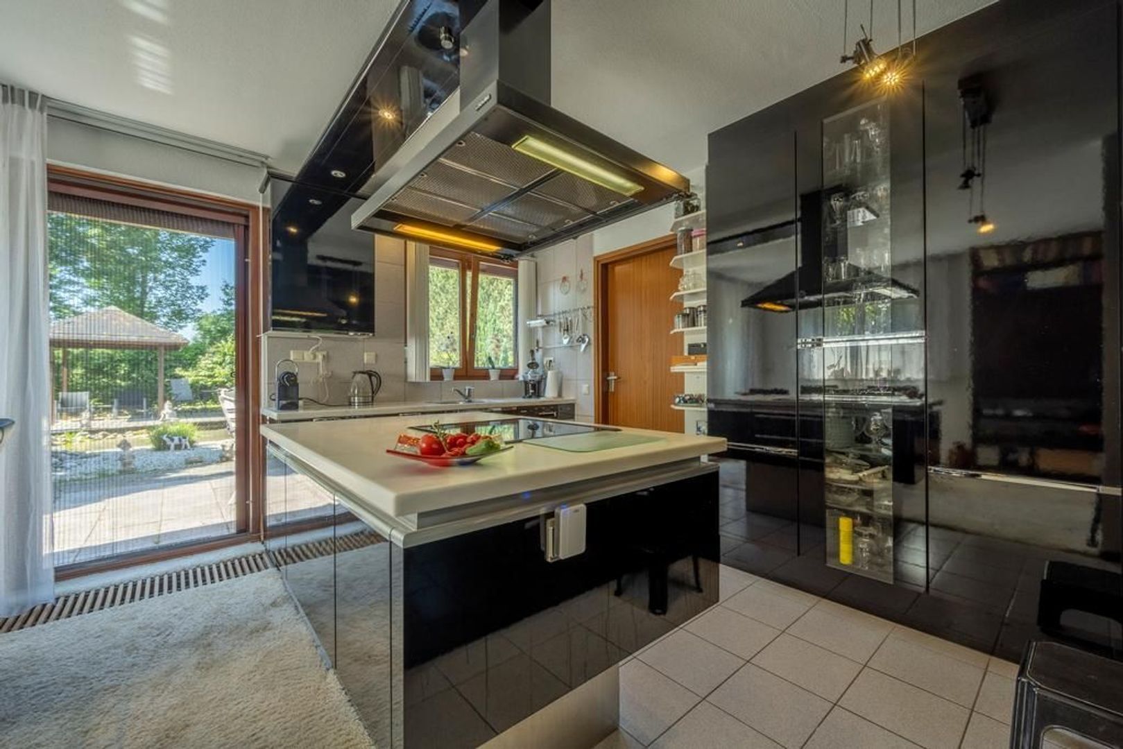 Half open woonkeuken met voldoende ruimte voor een grote eethoek. De keukeninrichting is groot en biedt veel opbergruimte. Uitvoering in hoogglans zwart met een Corian aanrechtblad.