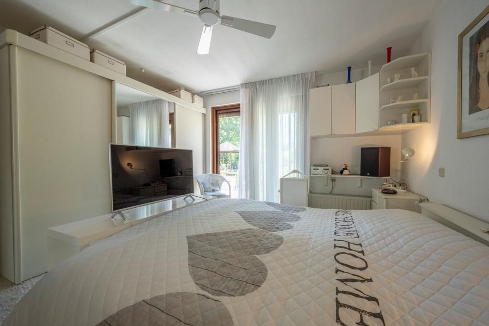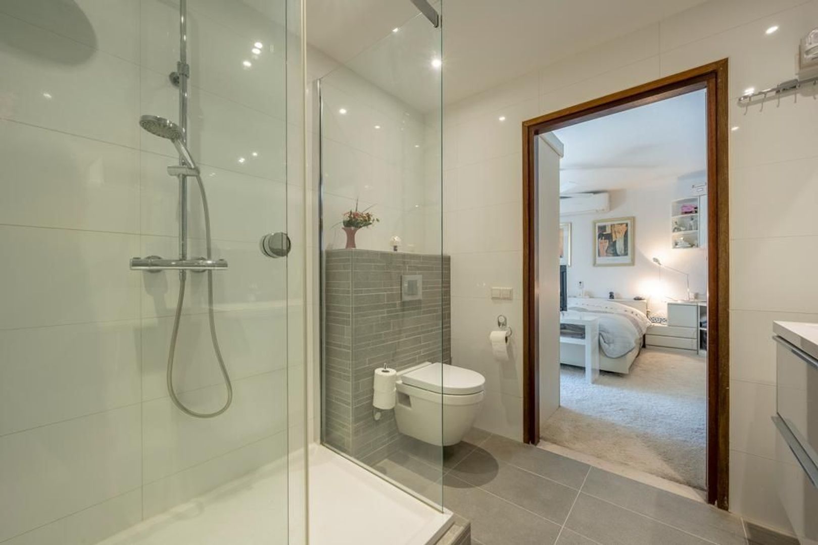 De slaapkamer op de begane grond grenst aan de tuin. Deze is ruim van opzet en geeft toegang tot de moderne badkamer, die is ingericht met een inloopdouche, wastafelmeubel en een toilet. De vloer is voorzien van comfortabele vloerverwarming.