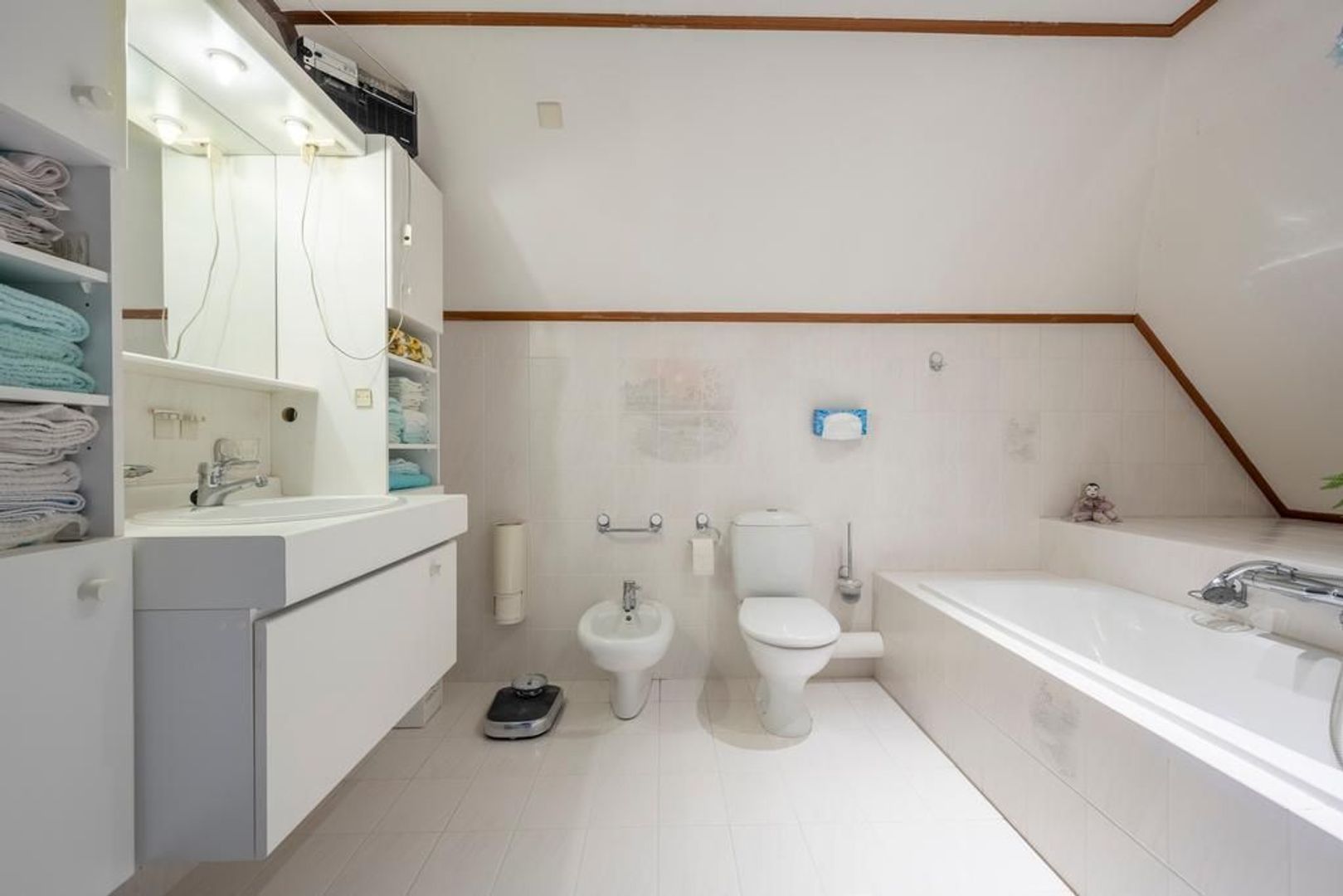Op de eerste verdieping bevinden zich o.a. drie ruime slaapkamers en een tweede badkamer. Deze is ingericht met een ligbad, een aparte doucheruimte, een toilet, bidet en wastafelmeubel. De slaapkamer aan de voorzijde beschikt over een mooi balkon.