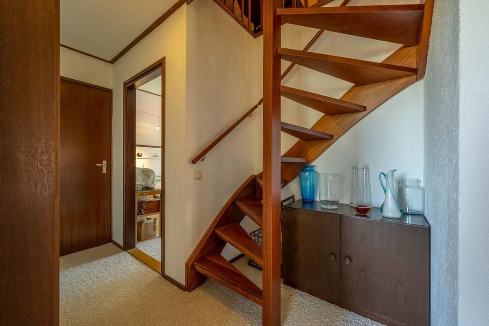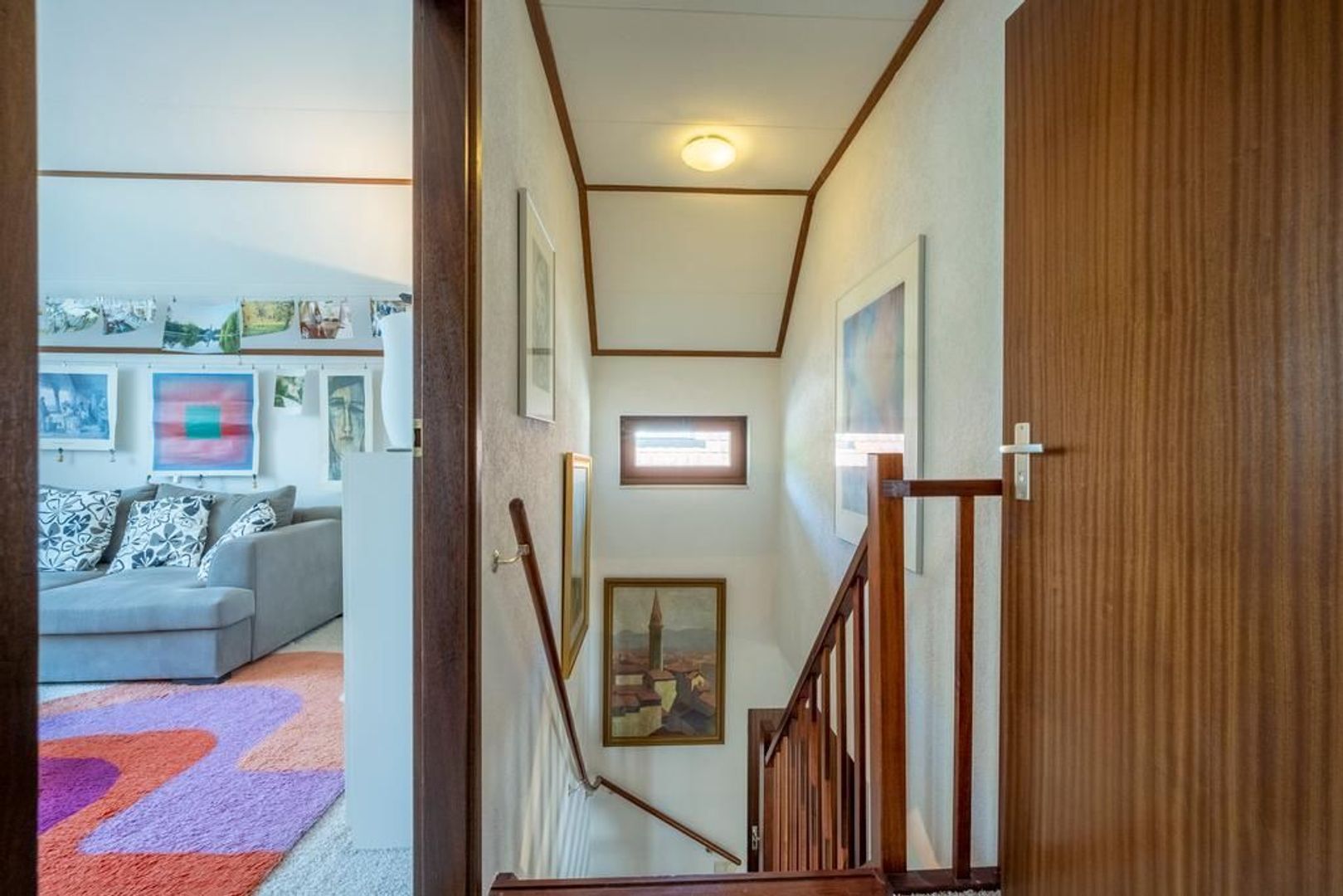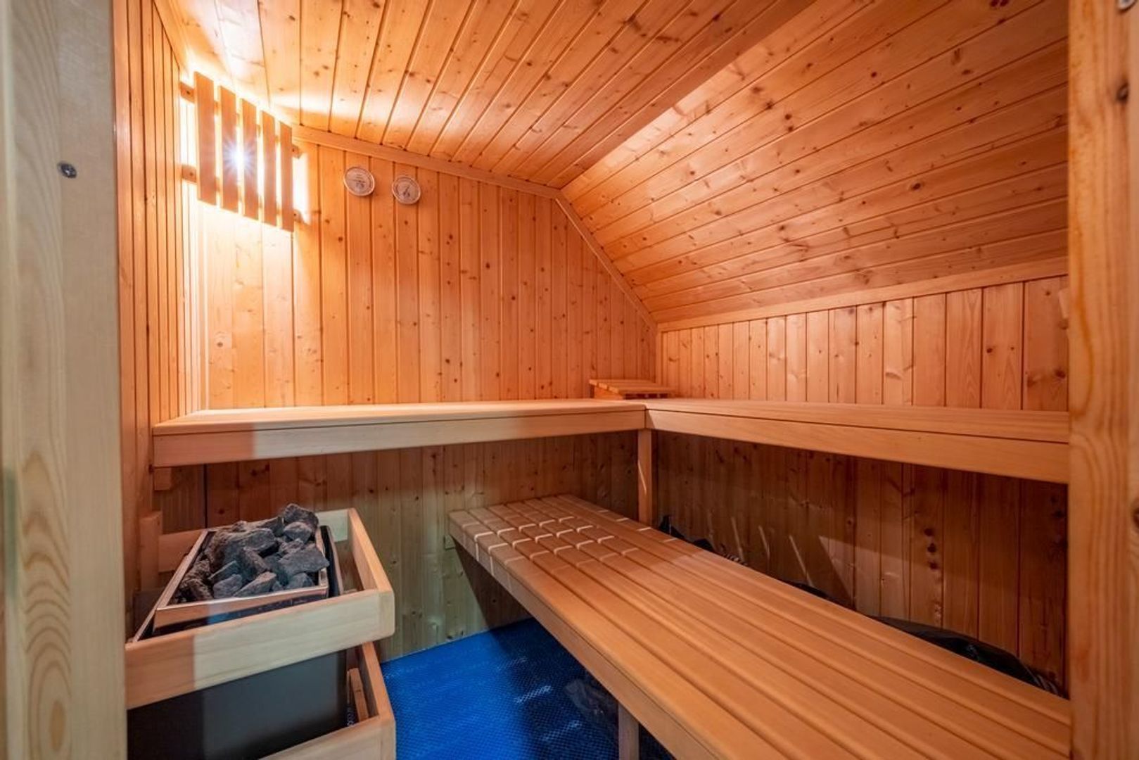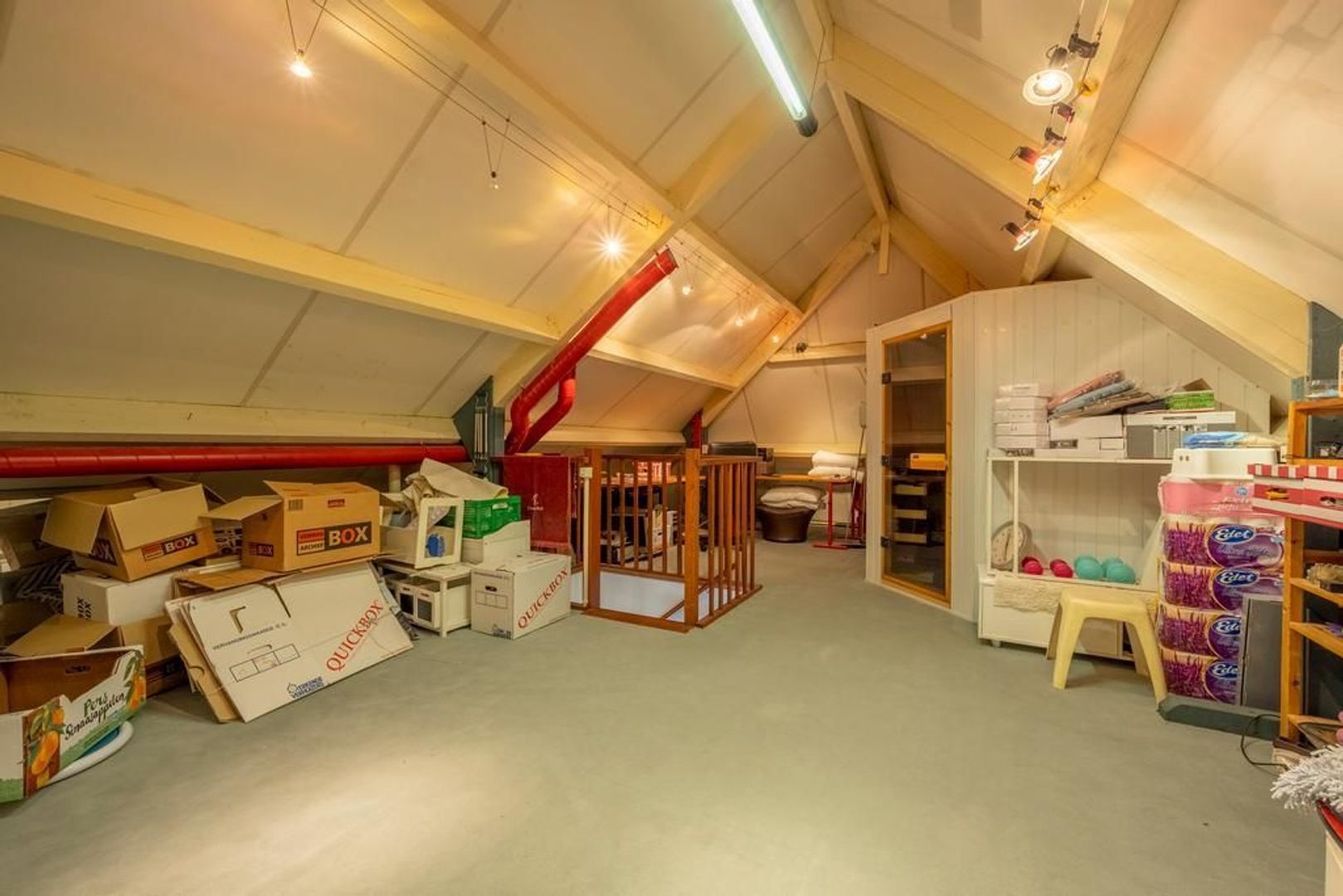 Een vaste trap geeft toegang tot de tweede verdieping, die in gebruik is als zolder. Hier staat een heerlijke sauna.