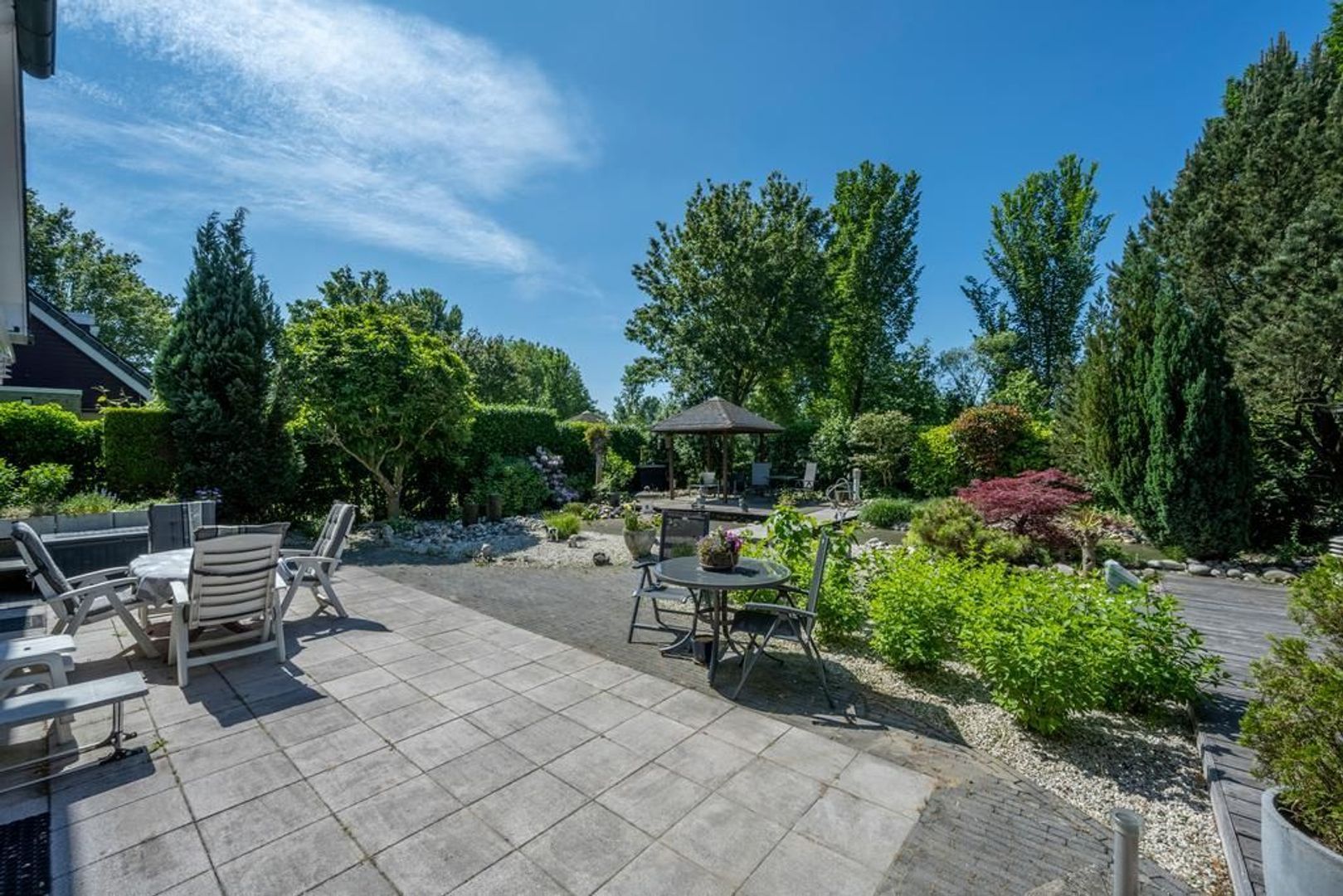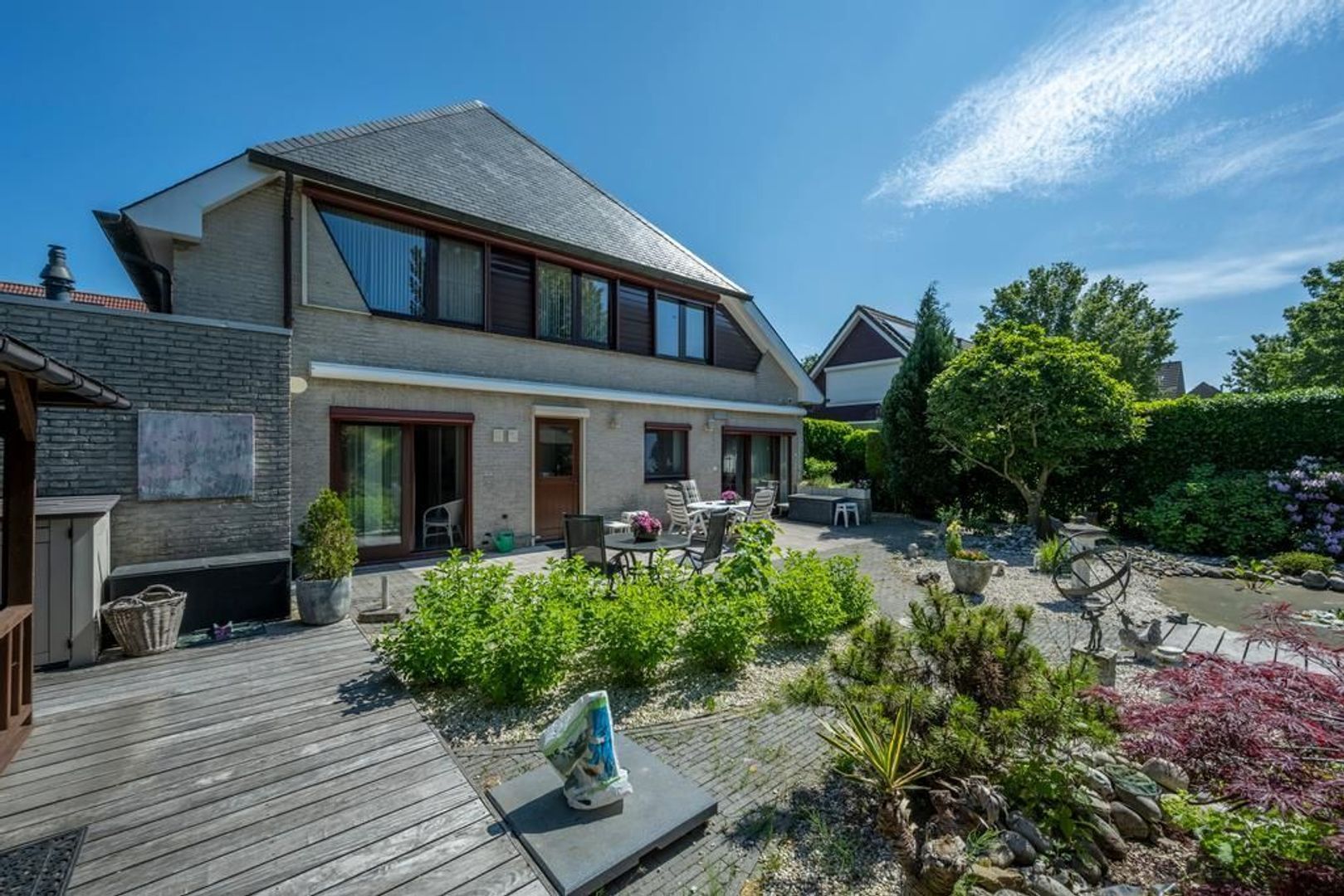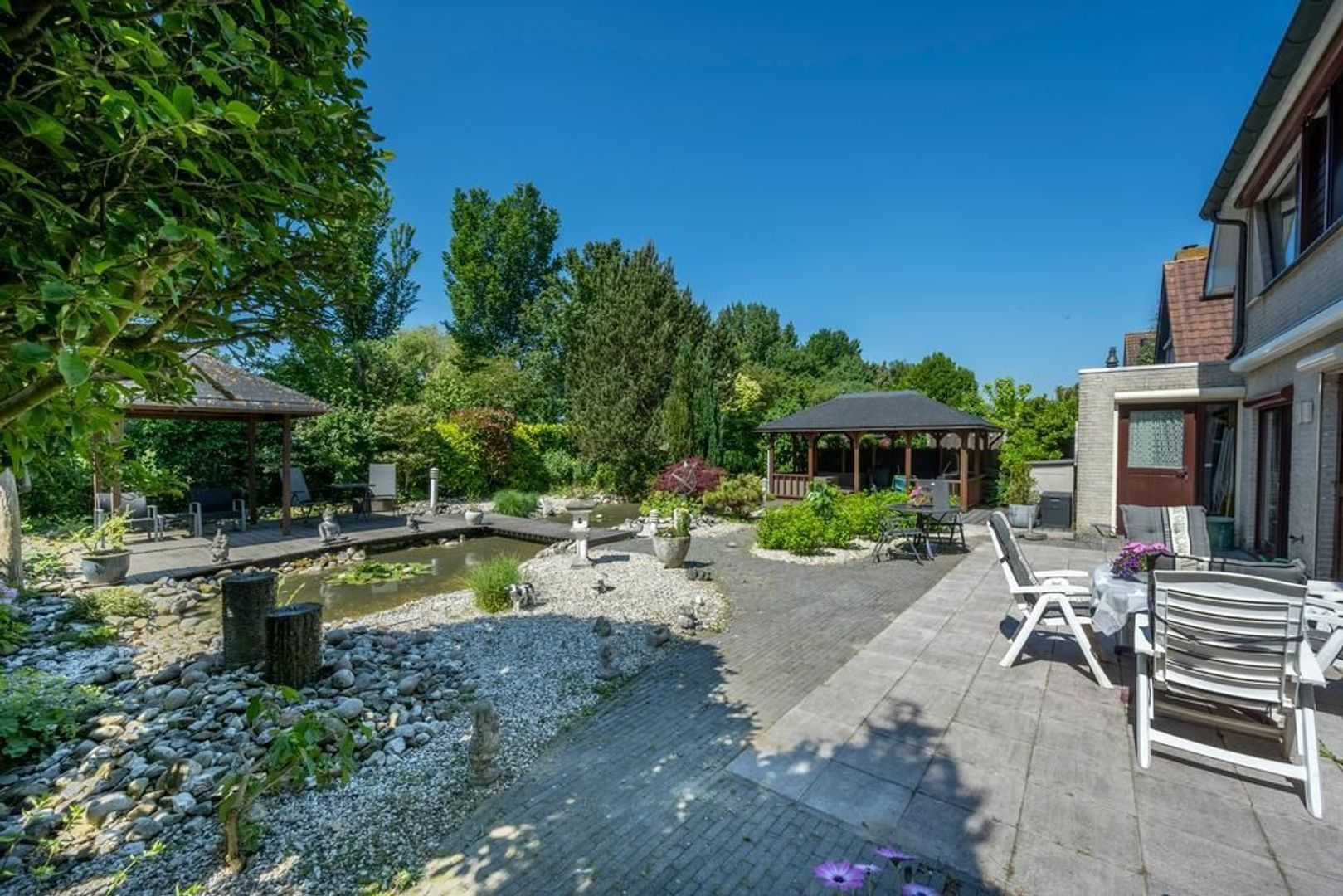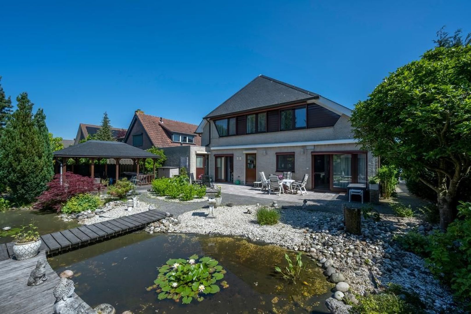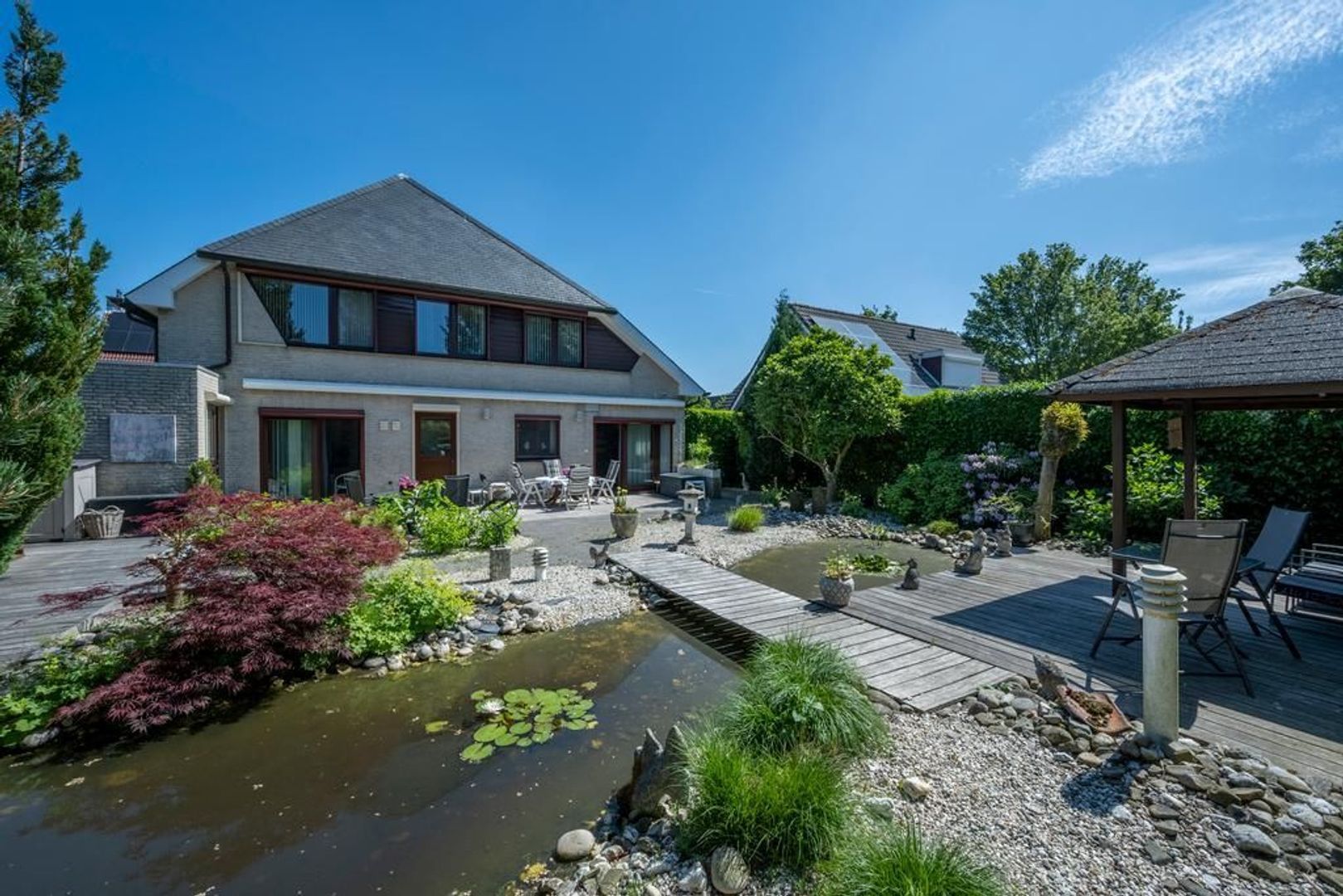 Solide, bijzonder royaal vrijstaand woonhuis met aangebouwde garage en mooi ingerichte tuin met overkapping, waterpartij en prieel.