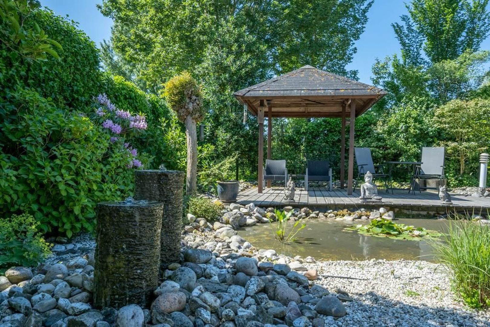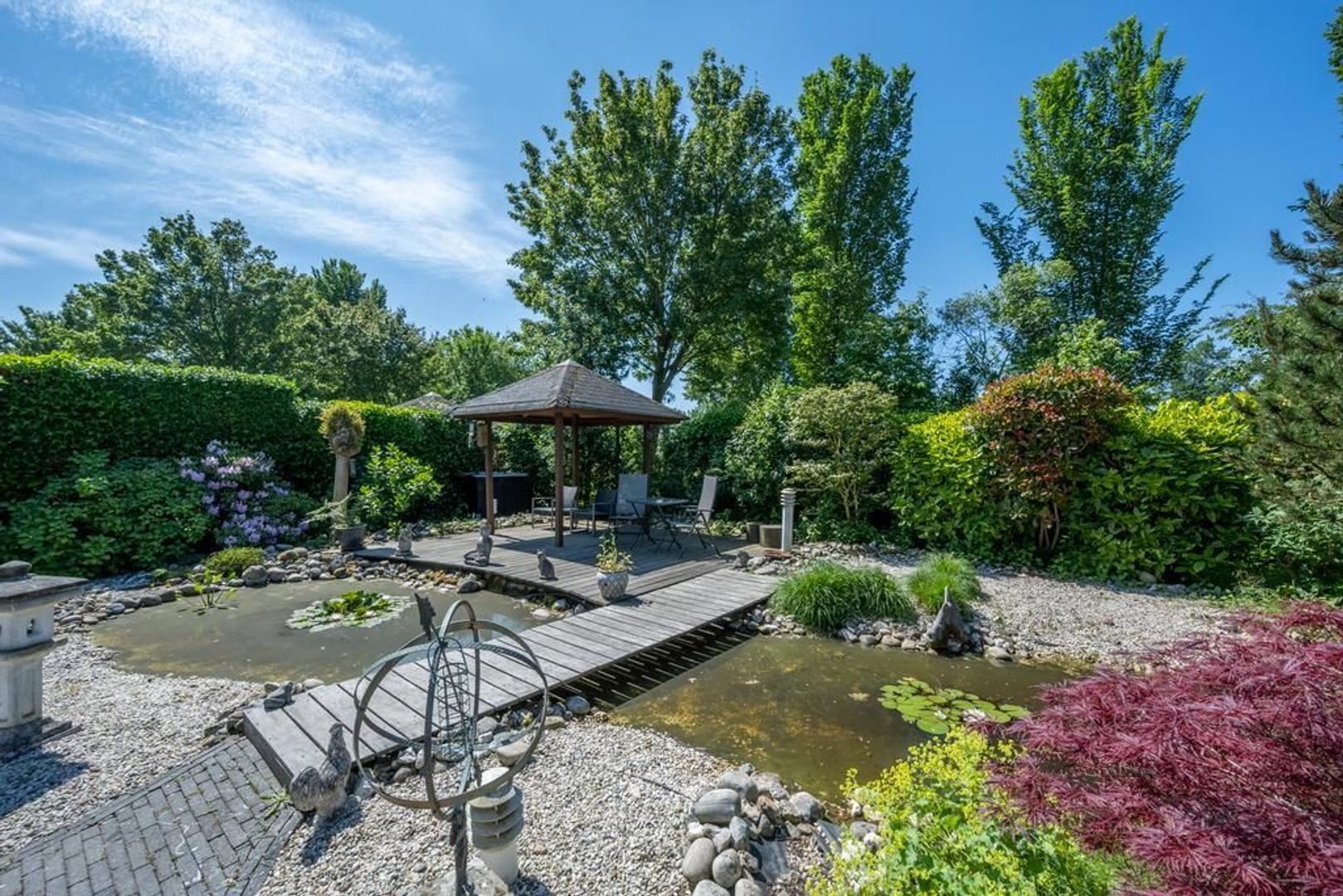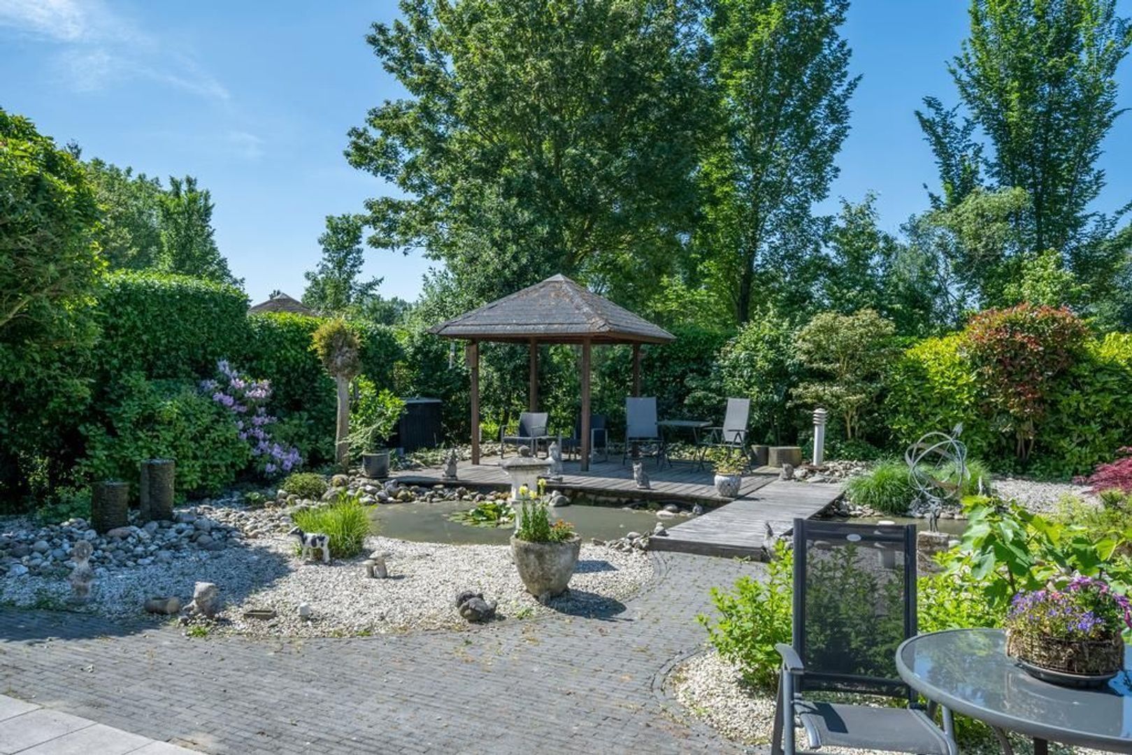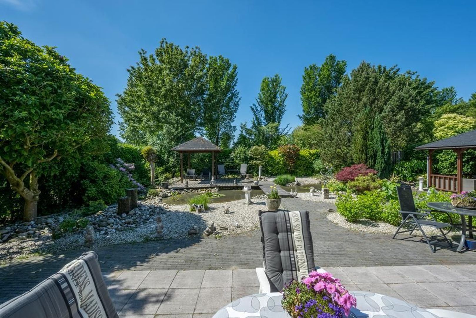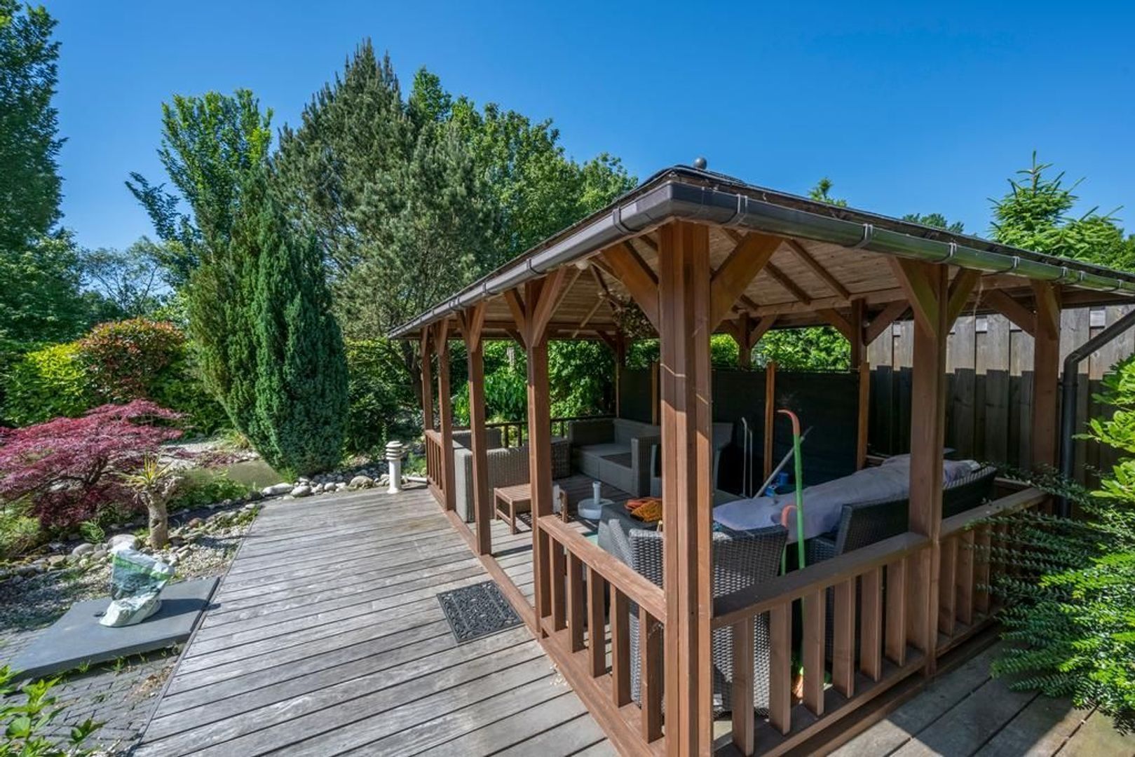 Solide, bijzonder royaal vrijstaand woonhuis met aangebouwde garage en mooi ingerichte tuin met overkapping, waterpartij en prieel.