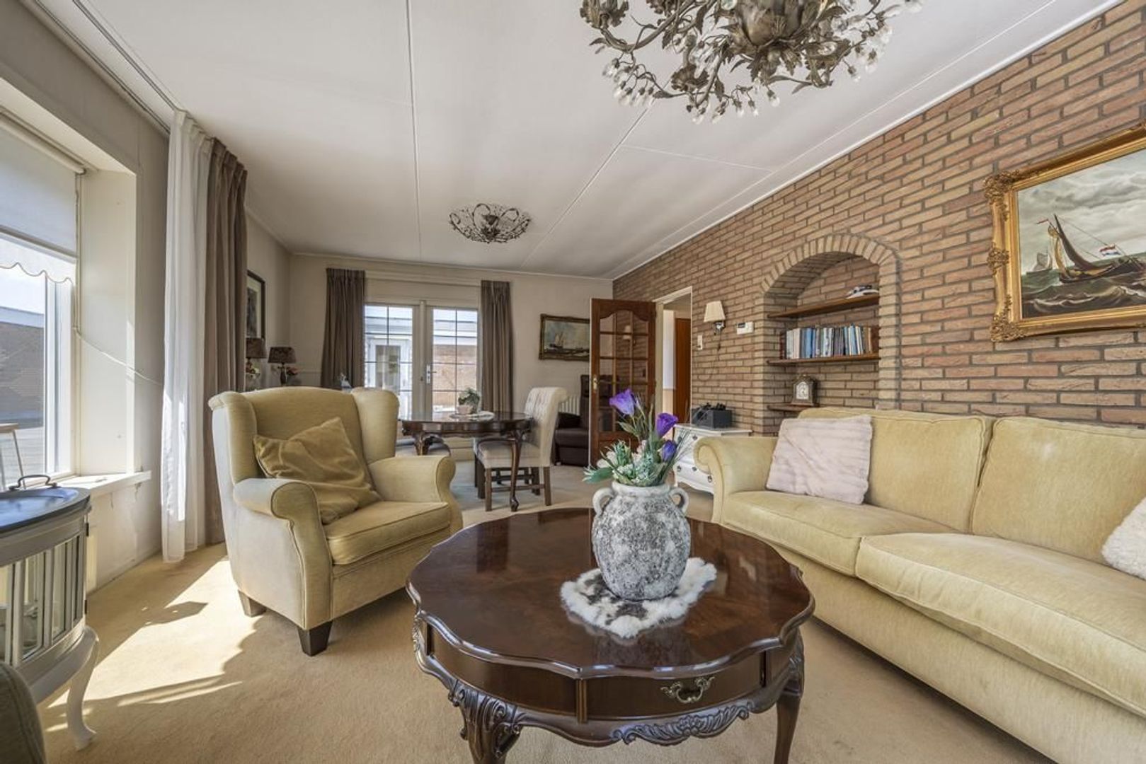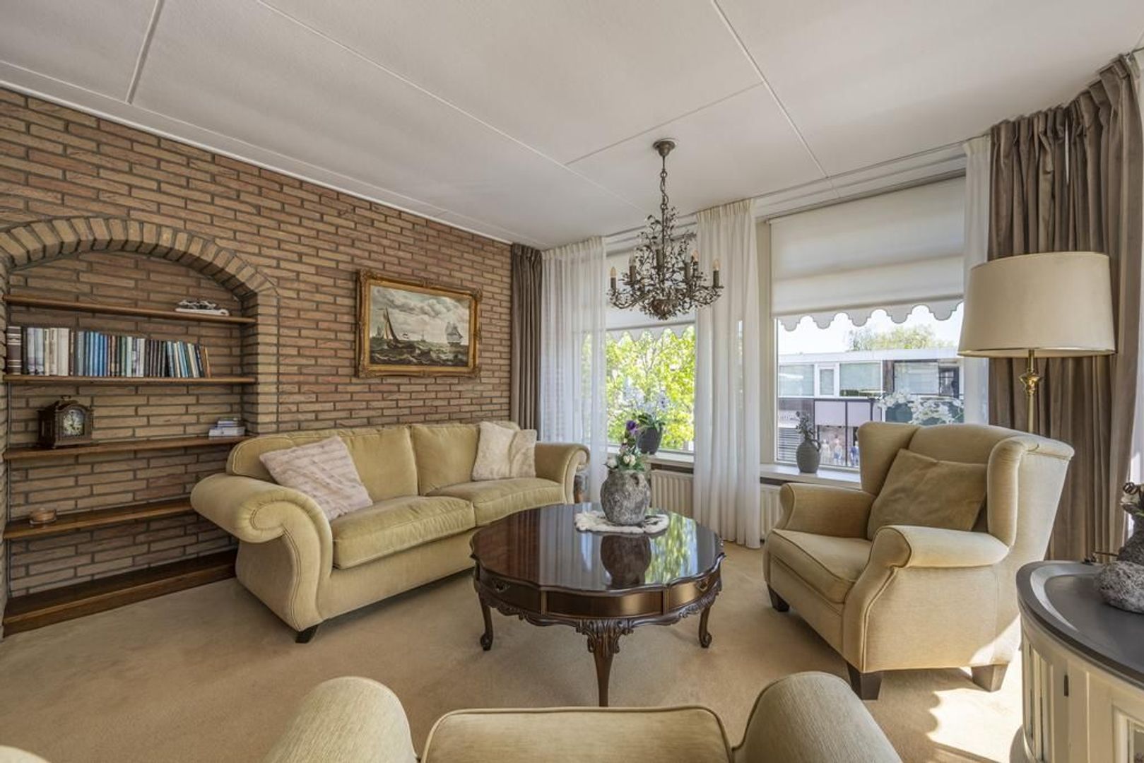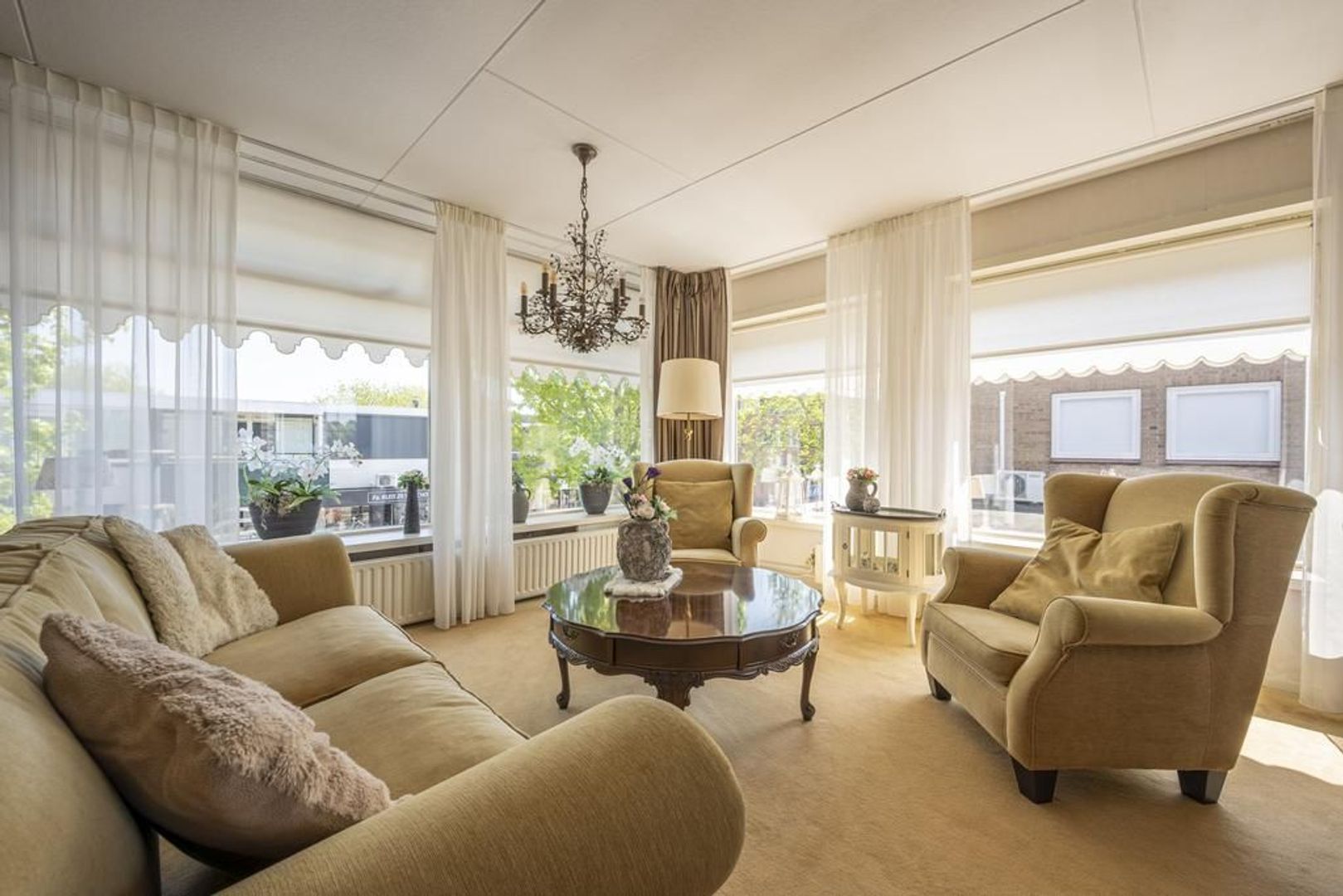Fraaie woonkamer met ramen aan drie zijden en openslaande deuren naar het dakterras.