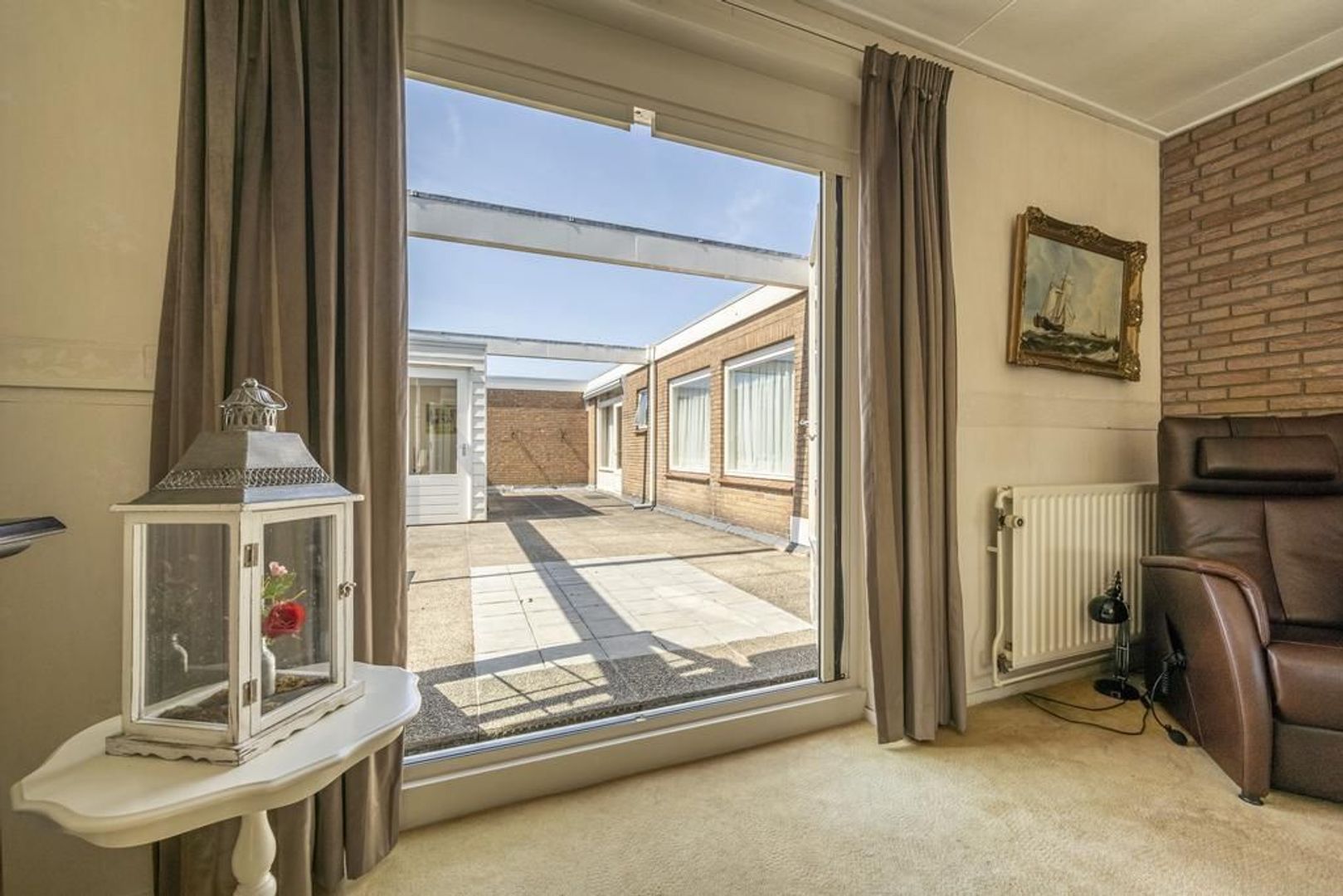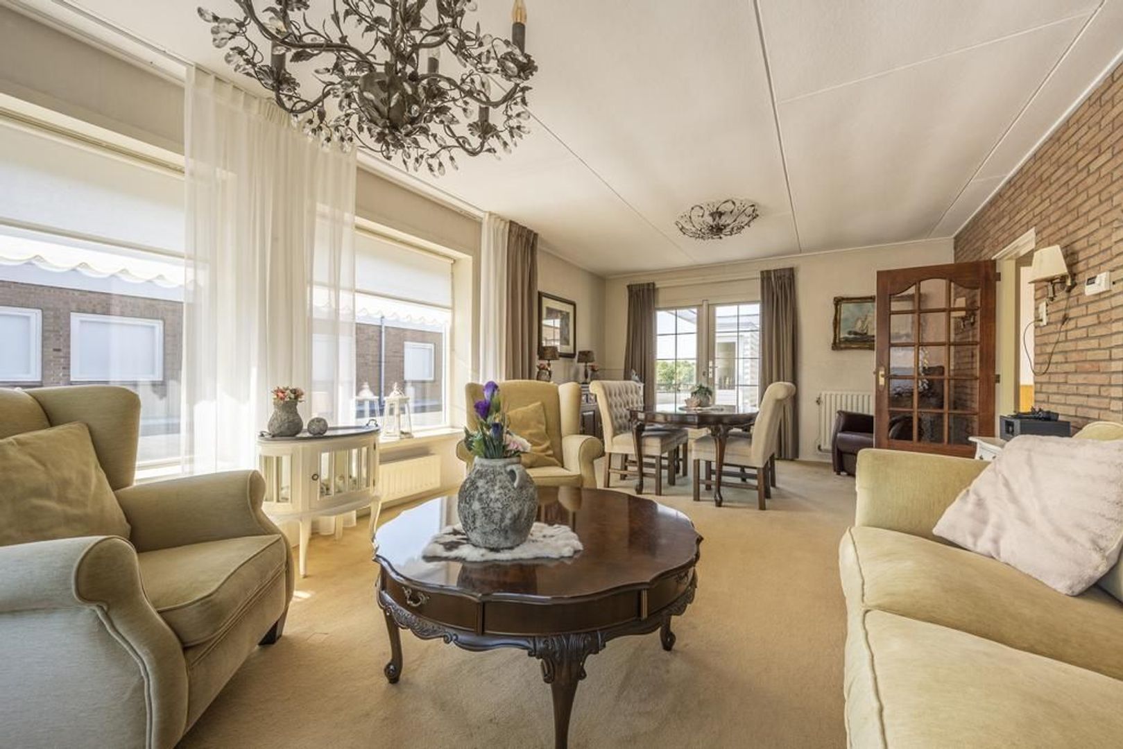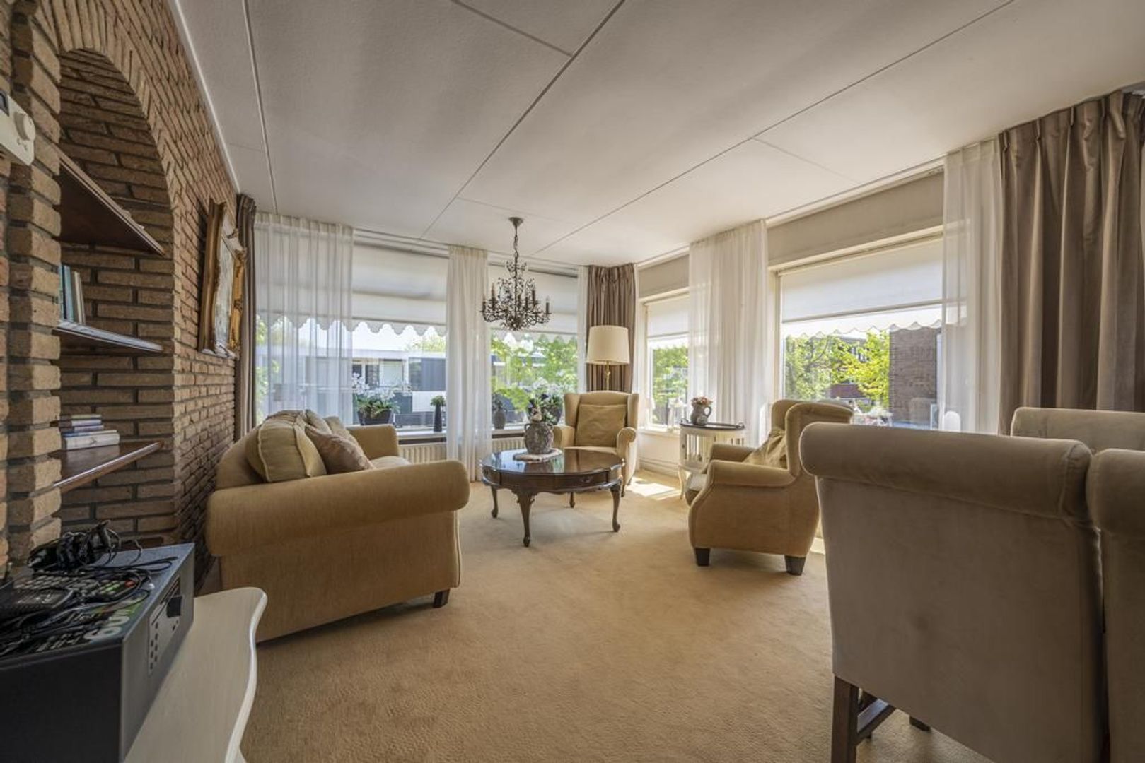 Fraaie woonkamer met ramen aan drie zijden en openslaande deuren naar het dakterras.