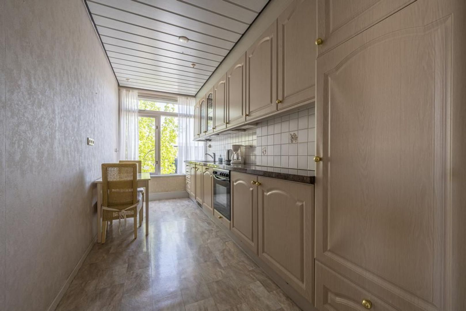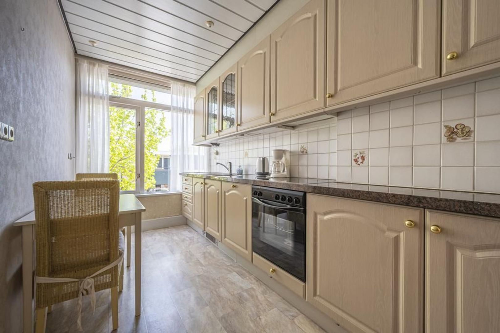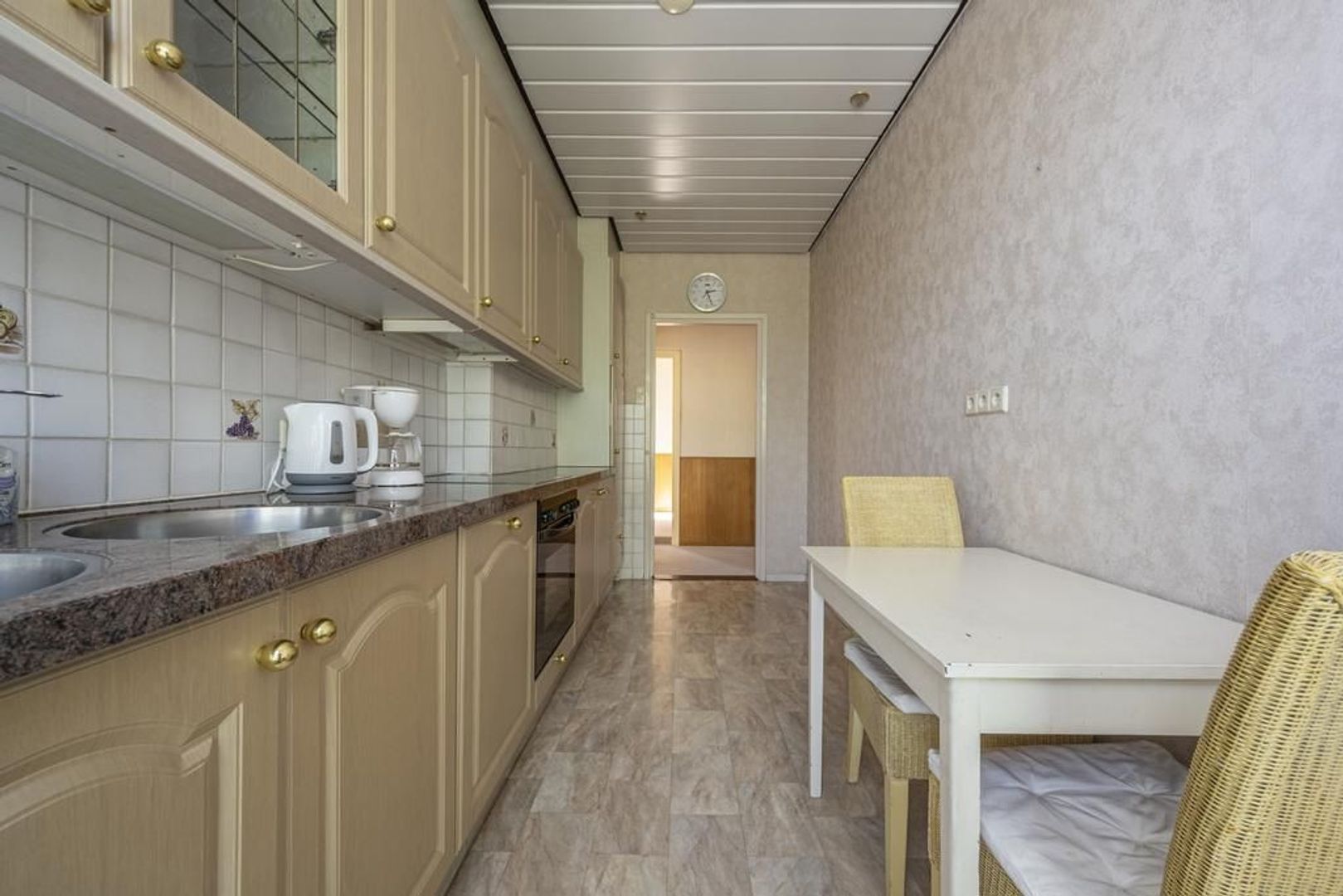 Dichte keuken met wandopgestelde inrichting, voorzien van natuurstenen aanrechtblad, boiler, inductiekookplaat, oven, koelkast, afzuigkap en vaatwasser.