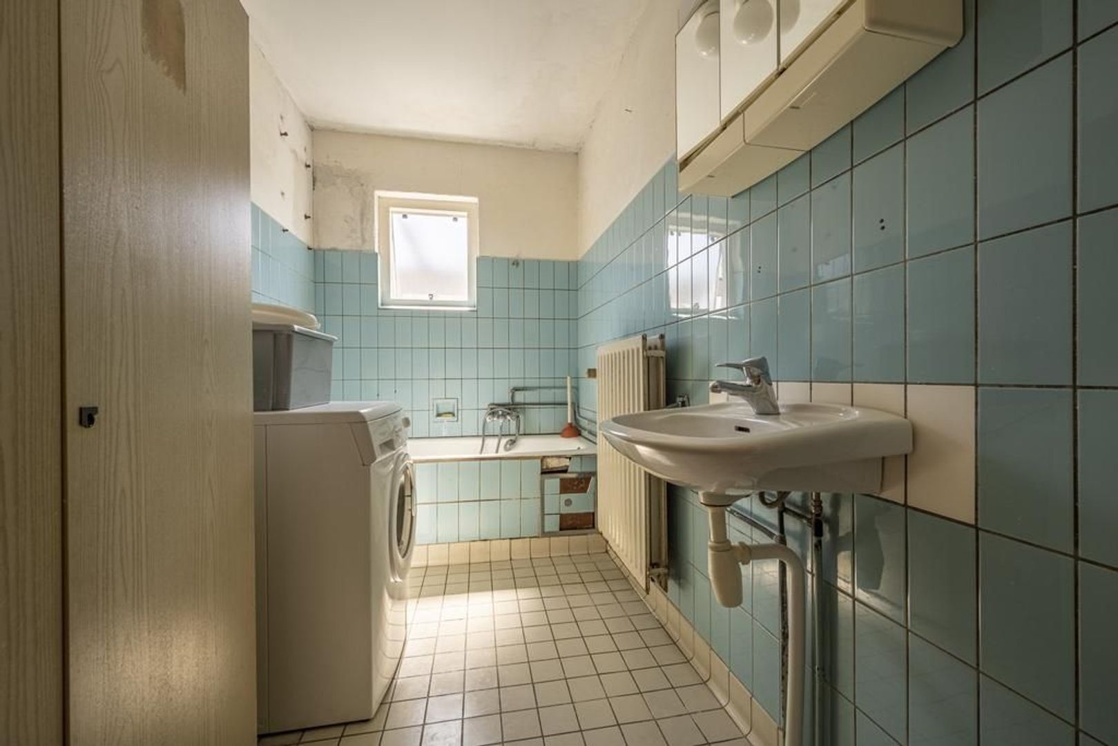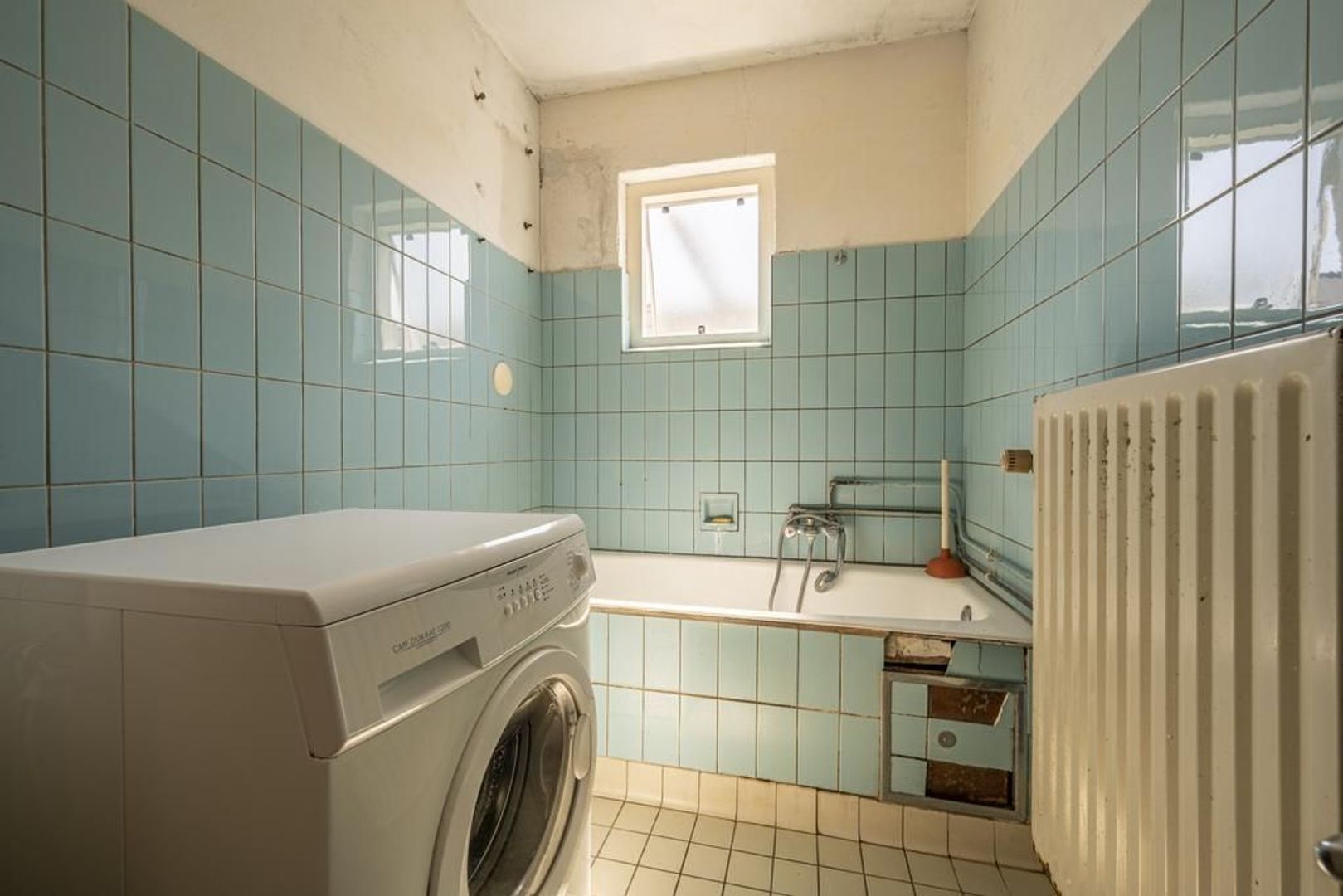 De badkamer dateert vanaf de bouwperiode en is ingericht met een ligbad, een wastafel en de aansluiting voor de wasmachine.