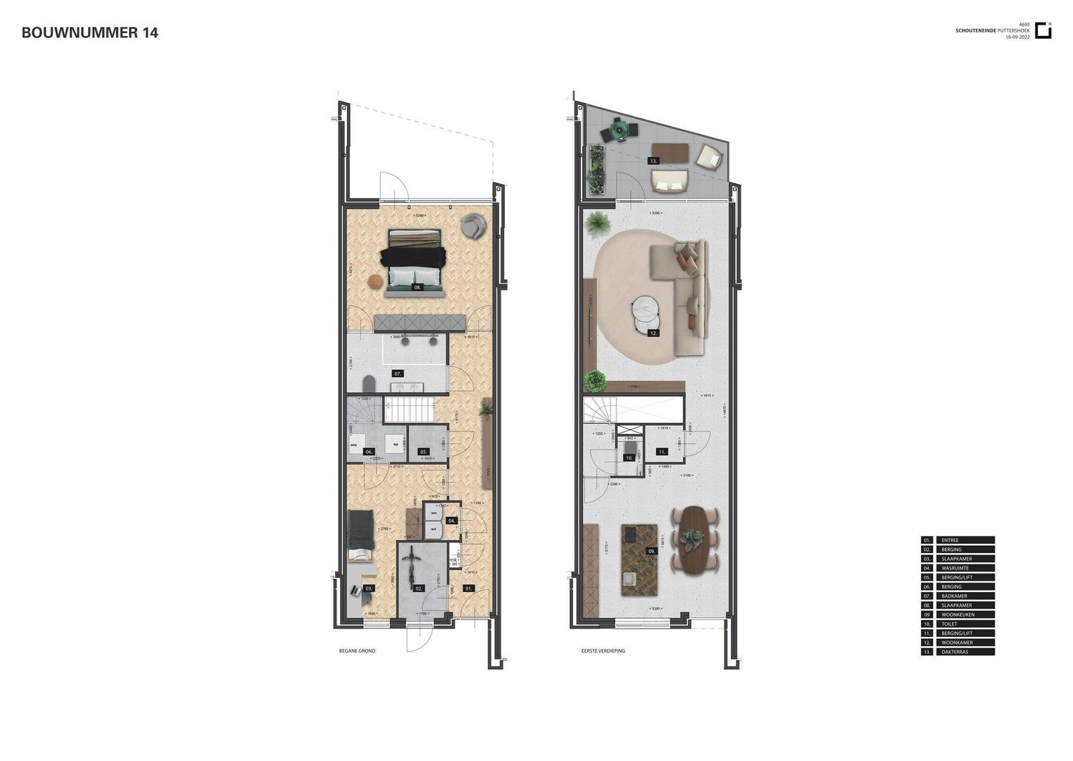 * Gebruiksoppervlak: 139 m2 (bwnr. 13), 155 m2 (bwnr. 14), 171 m2 (bwnr. 15)