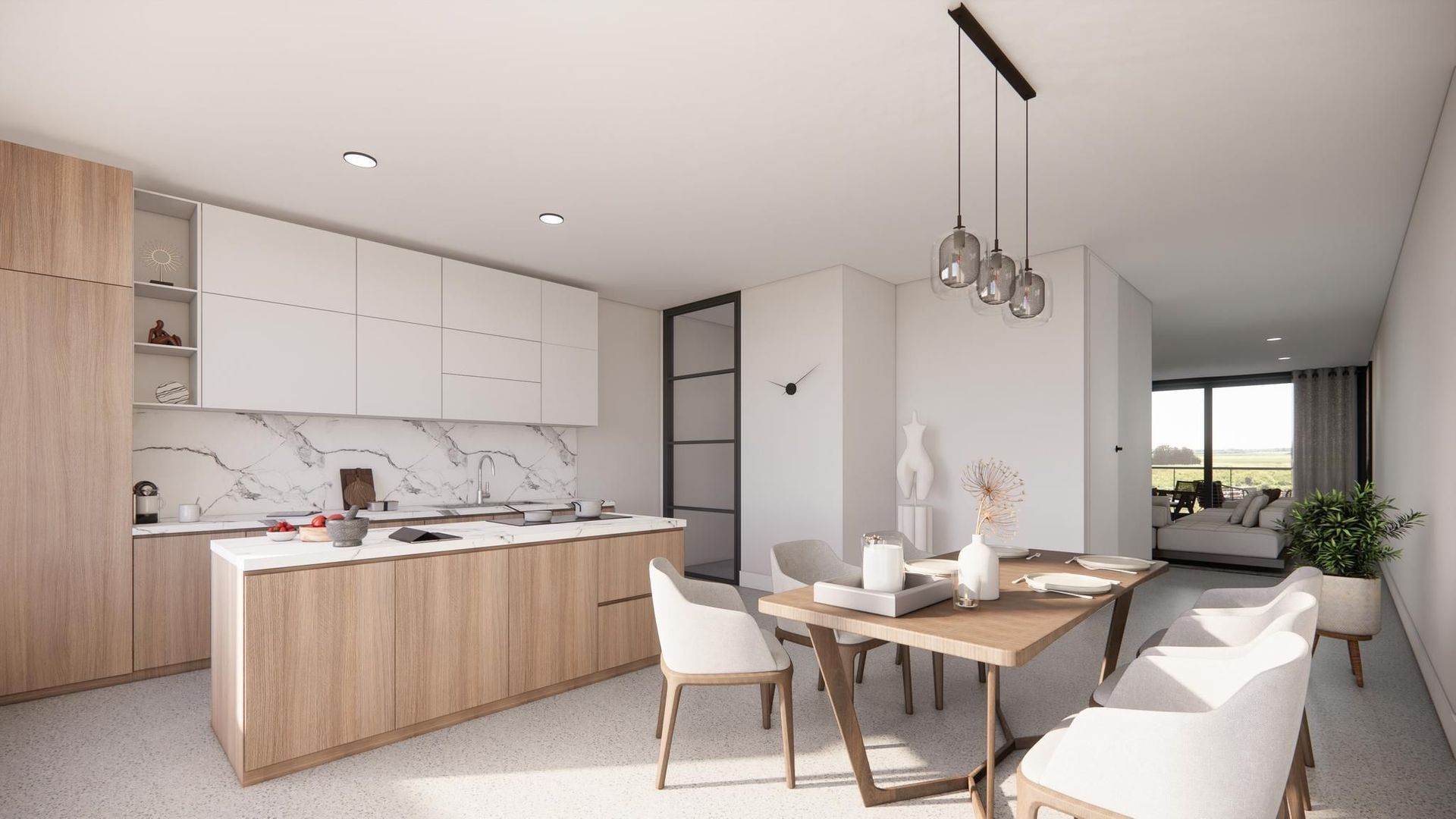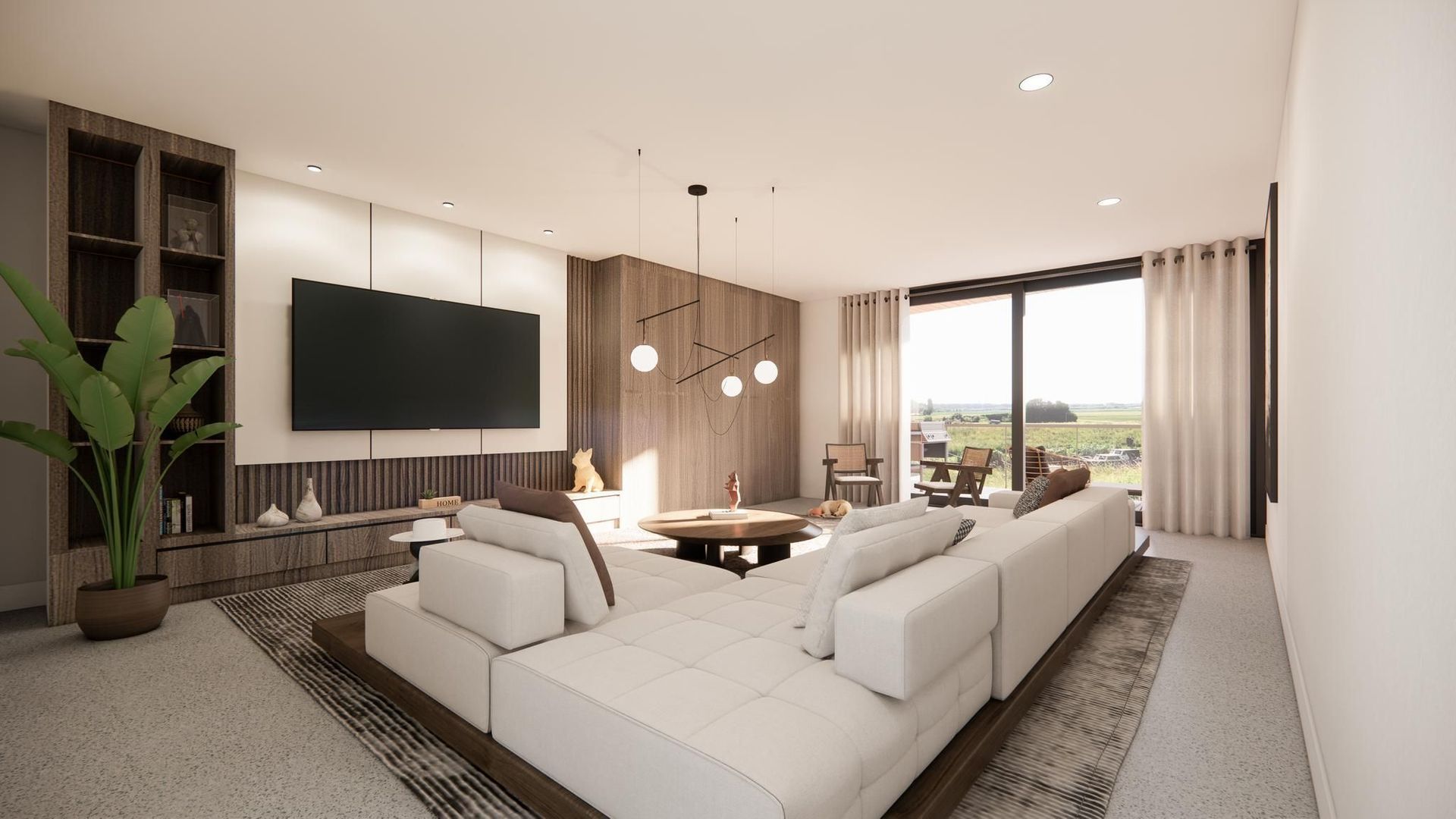 * Keukenopstelling aan voorzijde, ruime living aan grote glazen pui