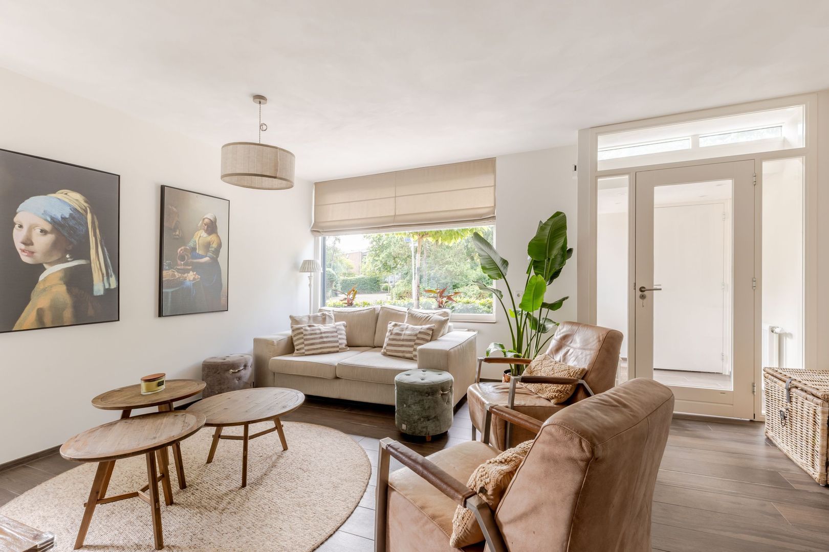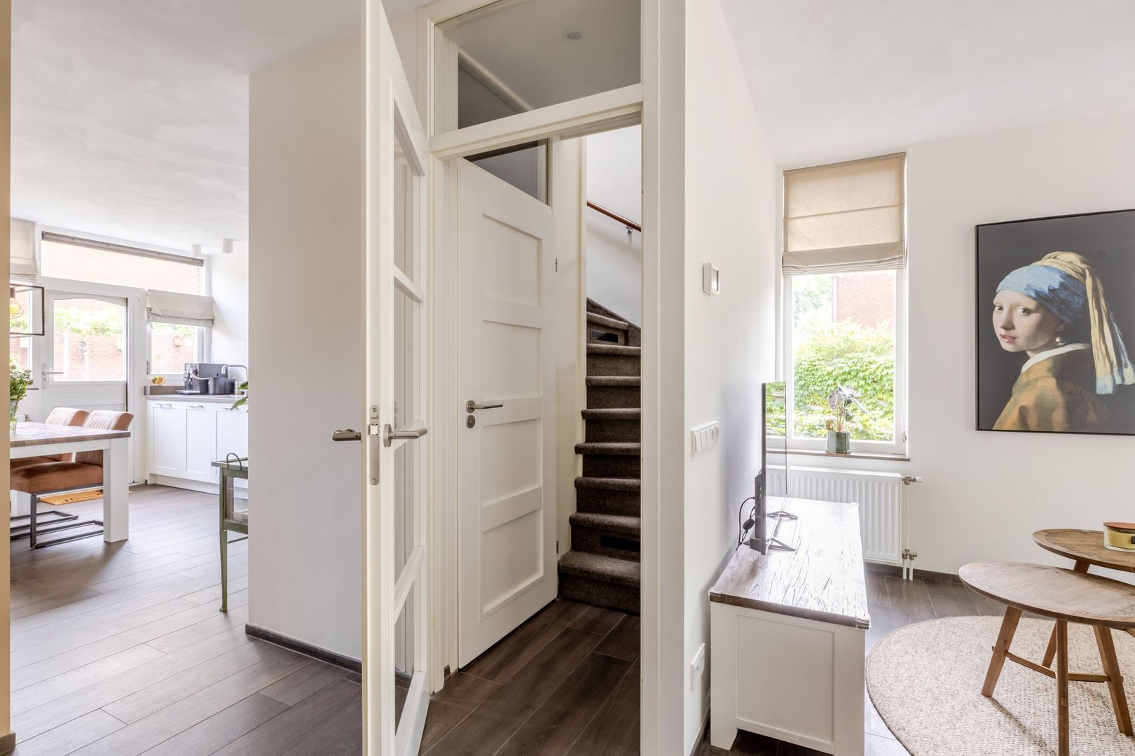 De indeling is als volgt: entreehal met meterkast en toegang tot de woonkamer aan de voorzijde. Hier geniet je van veel lichtinval en uitzicht op het plein. Aan de achterzijde vind je de ruime woonkeuken met een moderne wandopstelling in neutrale tinten, voorzien van diverse inbouwapparatuur, een kokendwaterkraan en een fraai betegelde achterwand. Via de deur naar de tuin loop je zó naar buiten om daar te eten of te ontspannen.