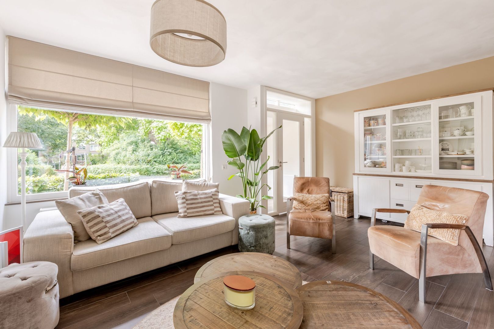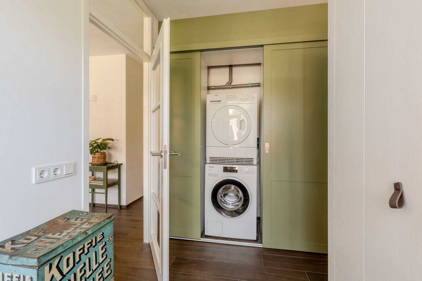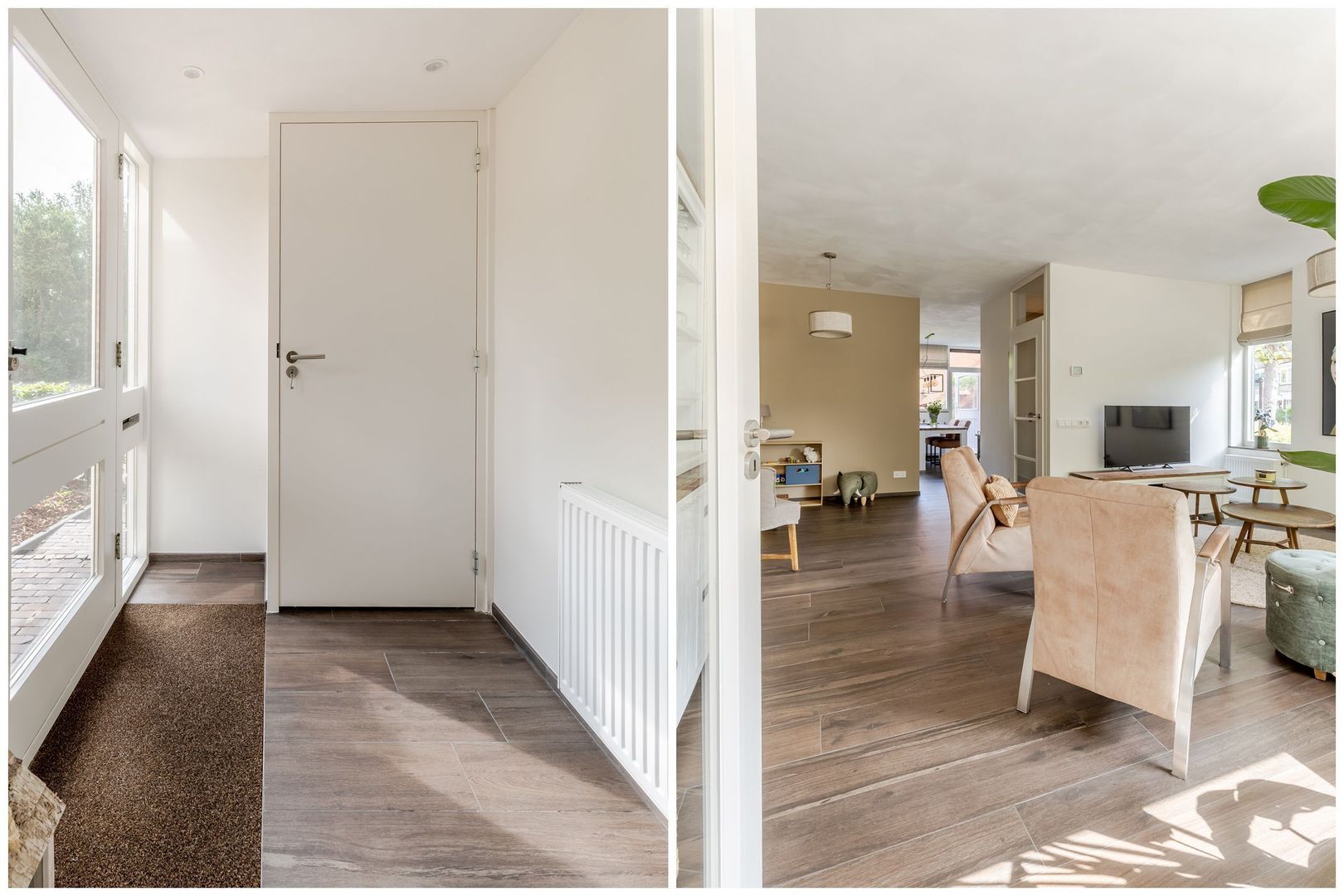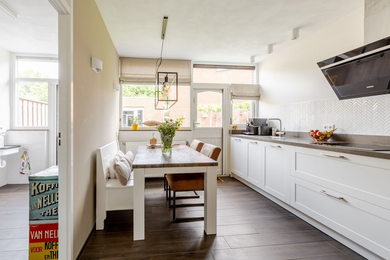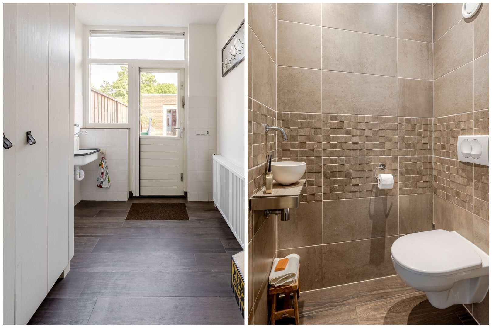 Naast de keuken bevindt zich de praktische bijkeuken met ruimte voor wasapparatuur en een uitstortgootsteen. De begane grond is grotendeels afgewerkt met een houtlook tegelvloer met comfortabele vloerverwarming (m.u.v. hal en toilet).