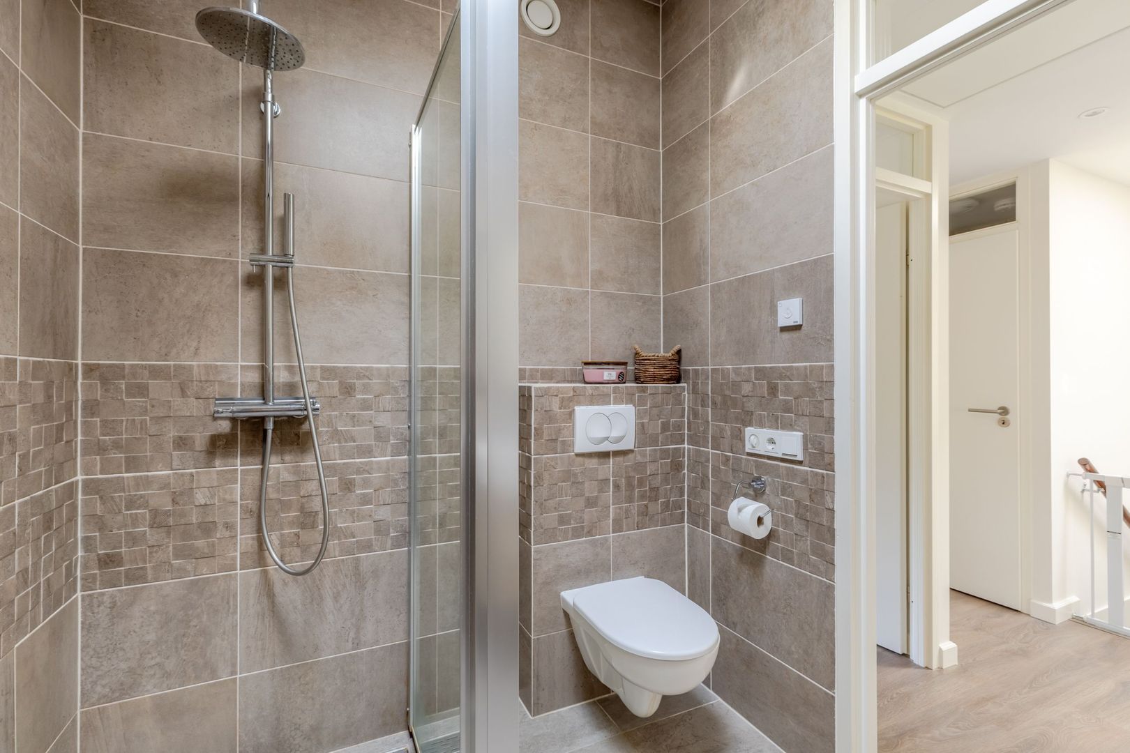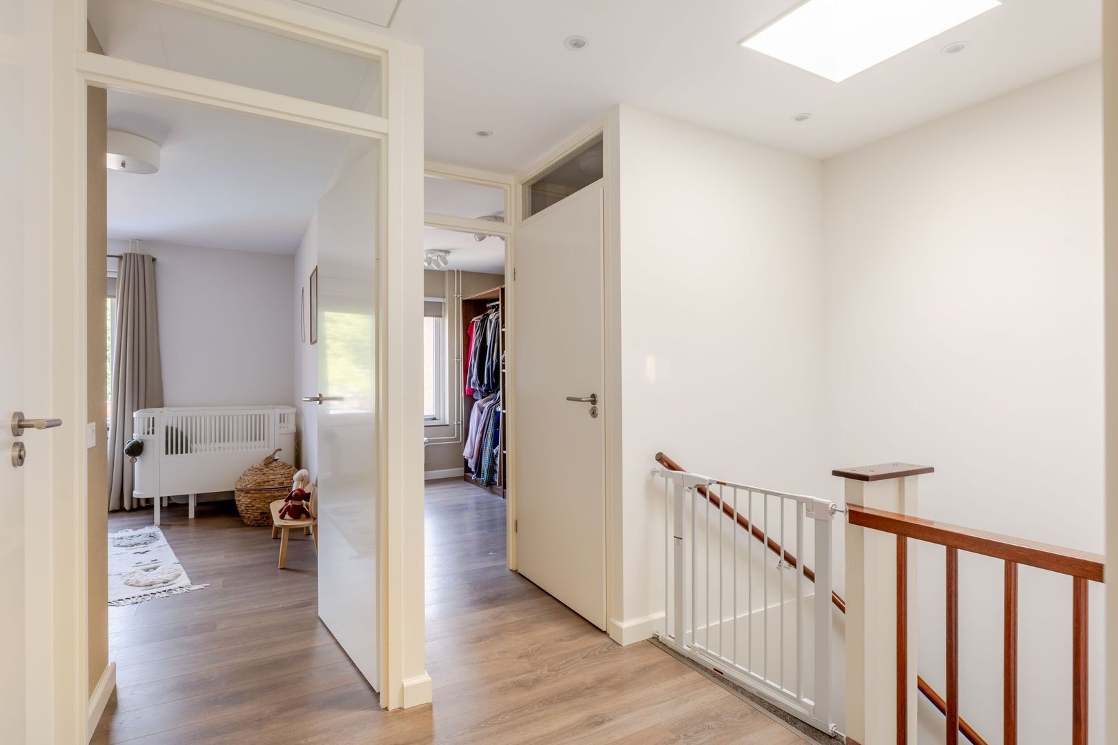 Via een tussenhal bereik je het modern ingerichte toilet en de trapopgang. Dankzij het extra dakraam valt ook hier prettig daglicht naar binnen.