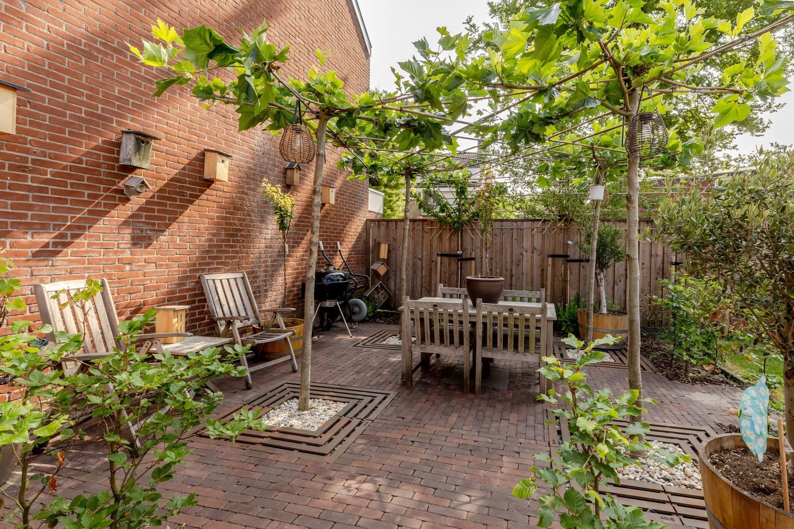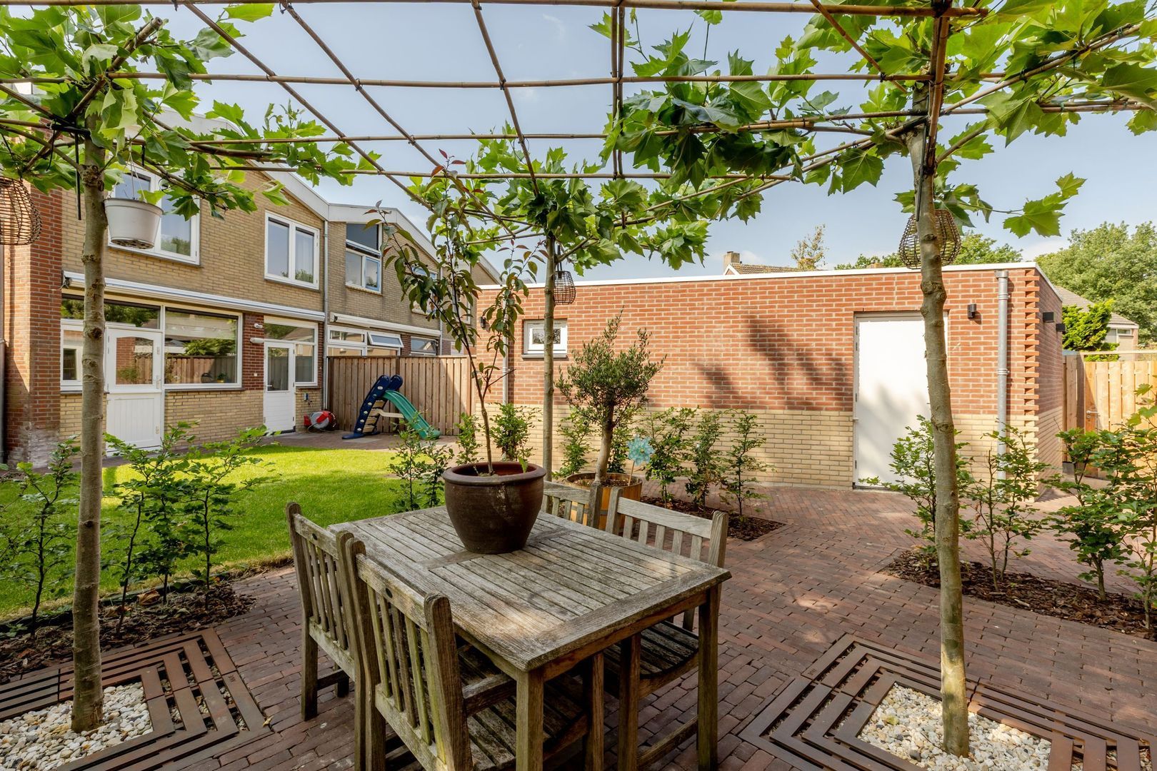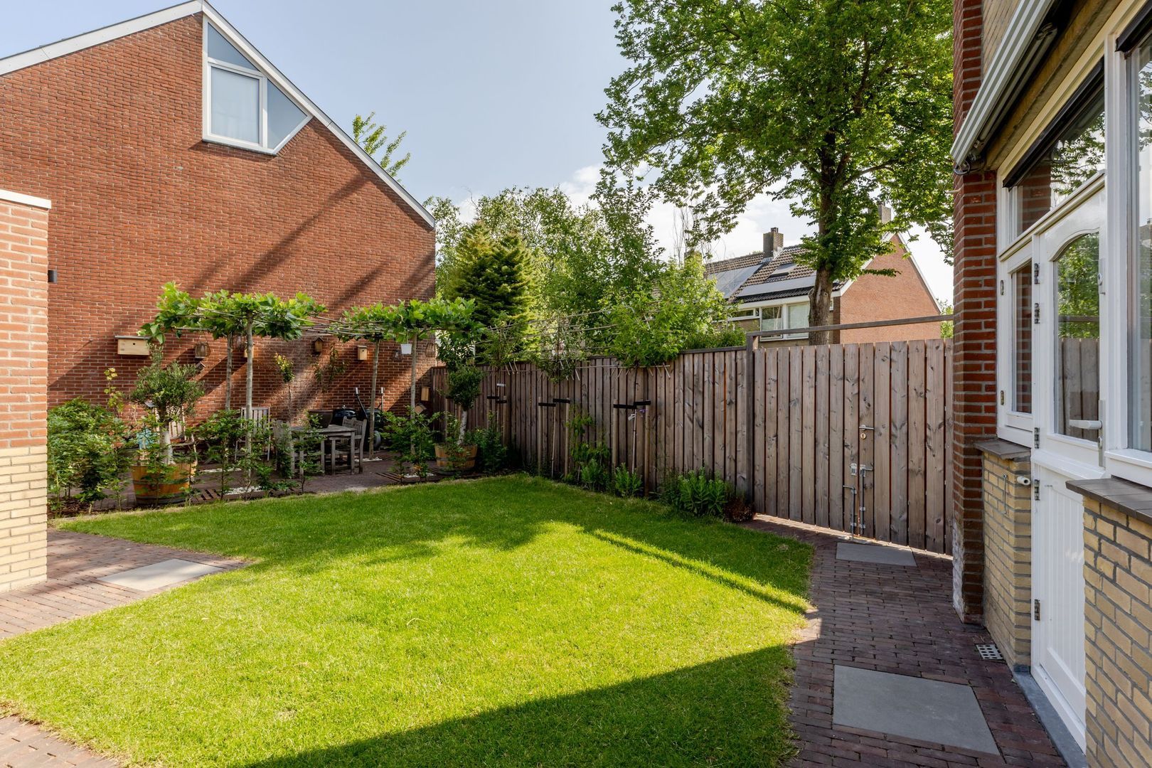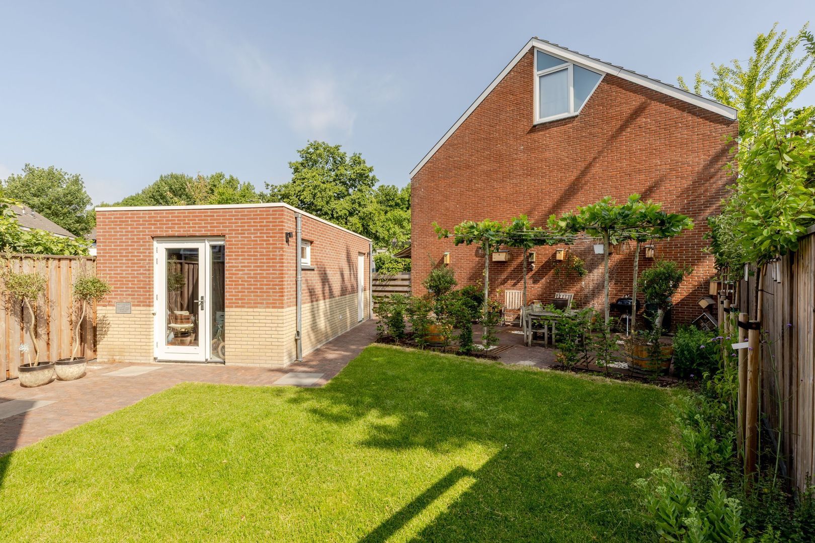 De achtertuin ligt op het noordwesten, is circa 17 meter diep en met zorg en smaak aangelegd. Dankzij het royale formaat is er ruimte gecreëerd voor een ruime, stenen berging van ruim 7 meter lang. Deze is volledig geïsoleerd, onderheid en voorzien van vloerverwarming, warm en koud water en een afvoer voor een wasbak. Bij de bouw is bovendien al rekening gehouden met de plaatsing van 6 tot 8 zonnepanelen op het dak van de berging — een waardevolle voorbereiding voor toekomstige verduurzaming.