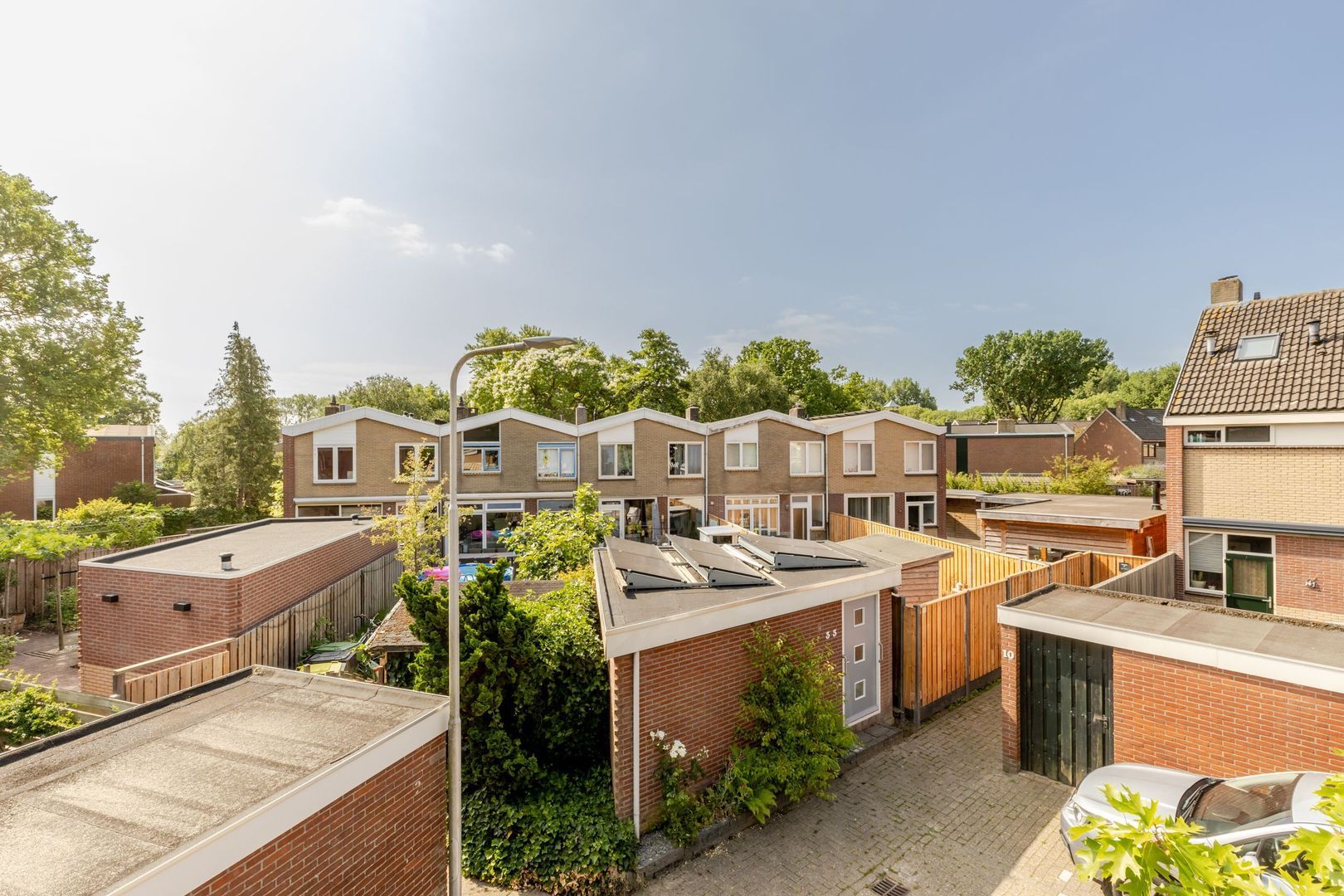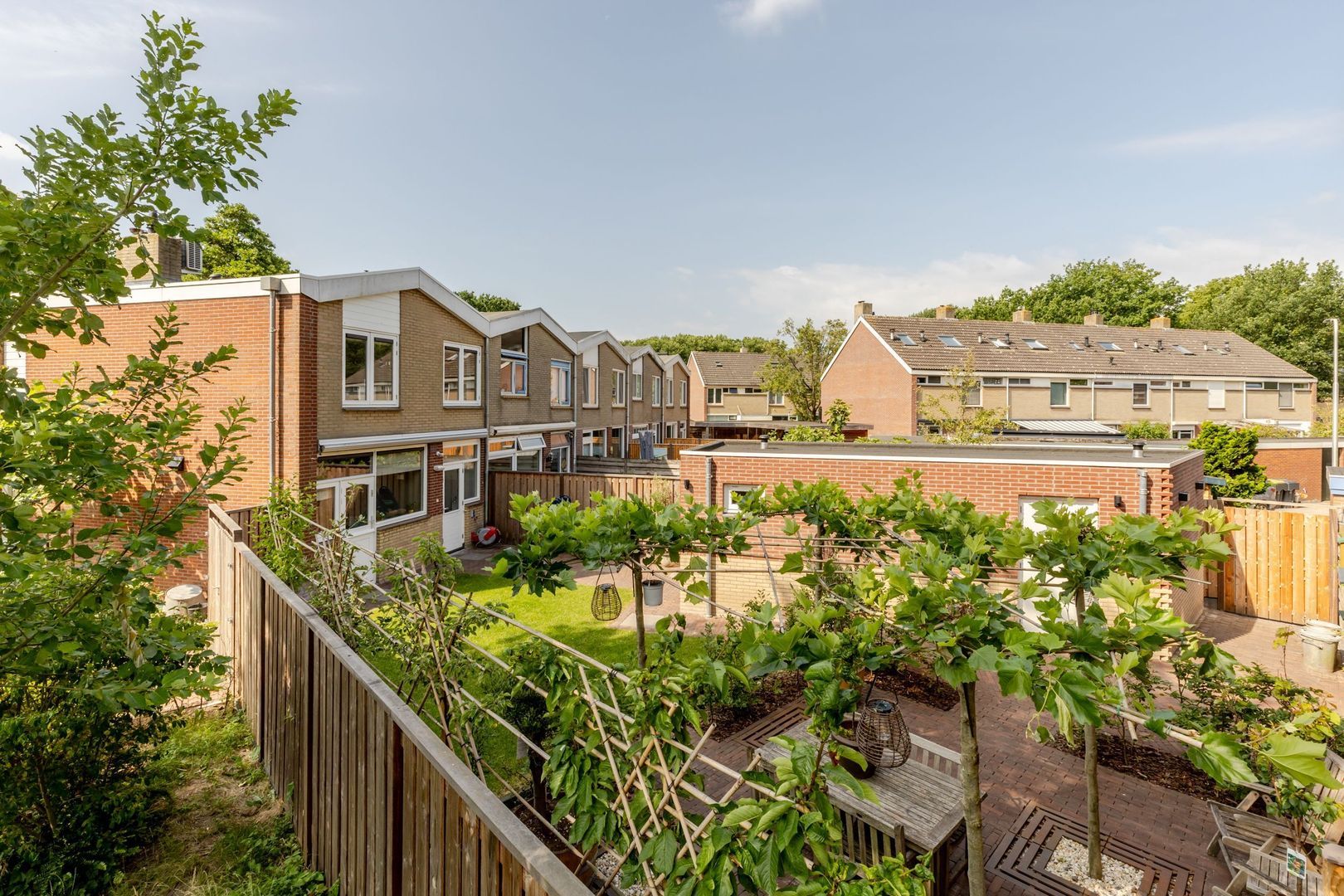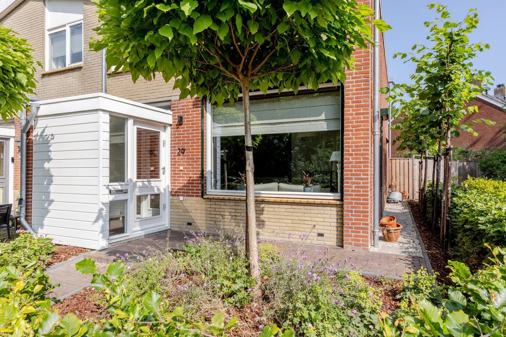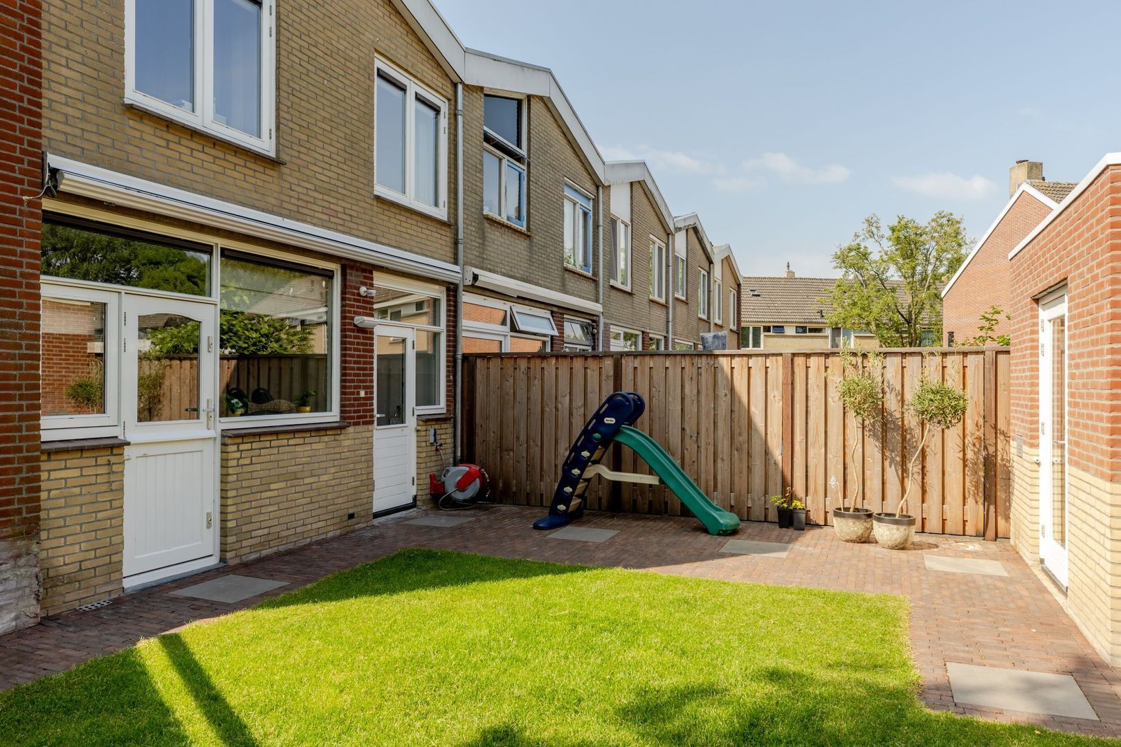 De achtertuin ligt op het noordwesten, is circa 17 meter diep en met zorg en smaak aangelegd. Dankzij het royale formaat is er ruimte gecreëerd voor een ruime, stenen berging van ruim 7 meter lang. Deze is volledig geïsoleerd, onderheid en voorzien van vloerverwarming, warm en koud water en een afvoer voor een wasbak. Bij de bouw is bovendien al rekening gehouden met de plaatsing van 6 tot 8 zonnepanelen op het dak van de berging — een waardevolle voorbereiding voor toekomstige verduurzaming.