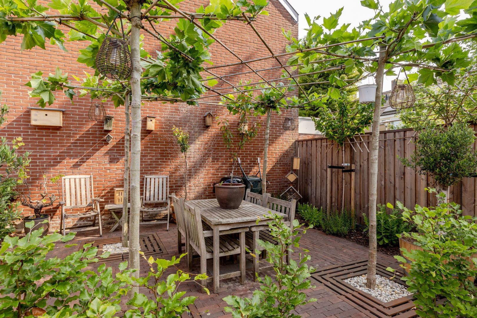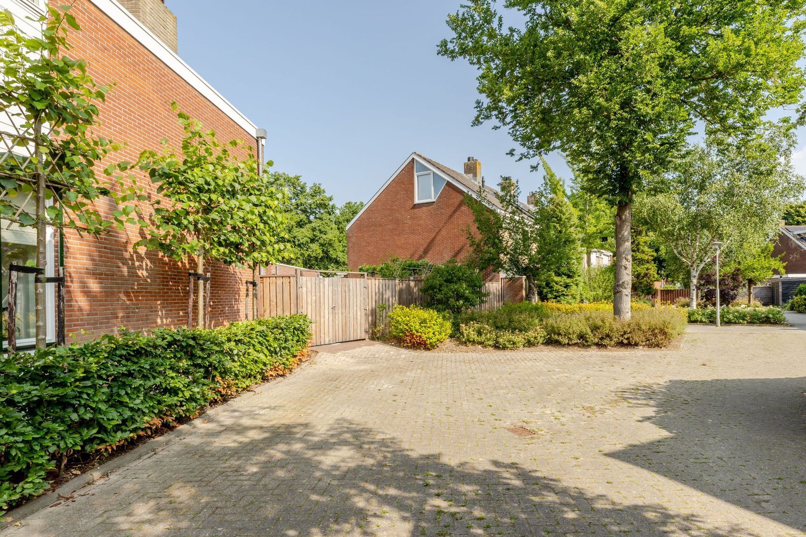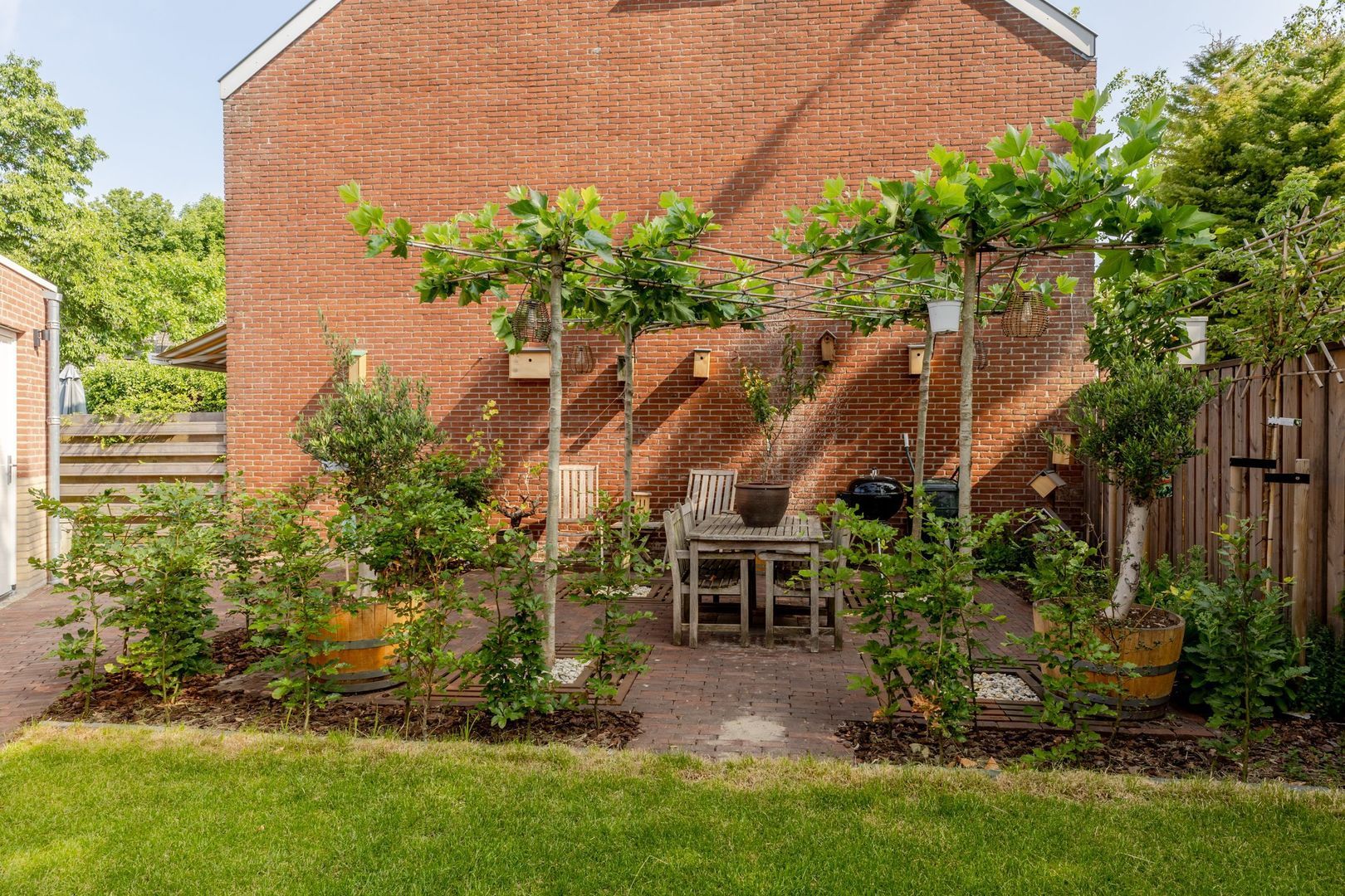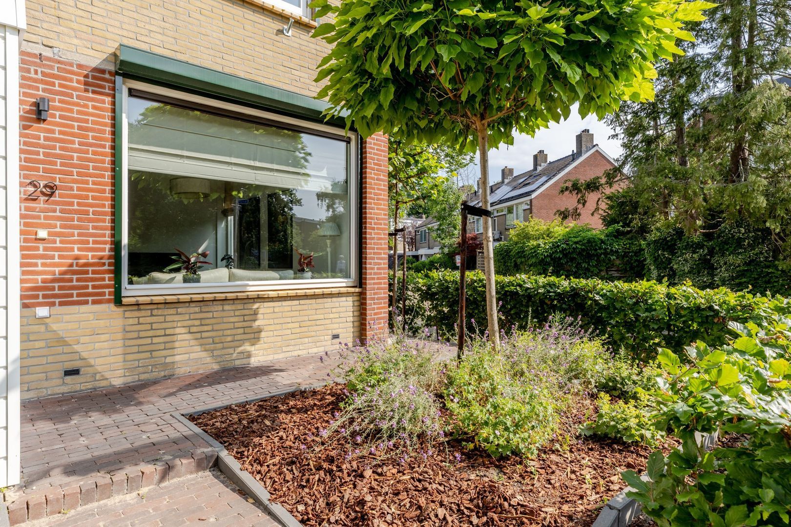 De achtertuin ligt op het noordwesten, is circa 17 meter diep en met zorg en smaak aangelegd. Dankzij het royale formaat is er ruimte gecreëerd voor een ruime, stenen berging van ruim 7 meter lang. Deze is volledig geïsoleerd, onderheid en voorzien van vloerverwarming, warm en koud water en een afvoer voor een wasbak. Bij de bouw is bovendien al rekening gehouden met de plaatsing van 6 tot 8 zonnepanelen op het dak van de berging — een waardevolle voorbereiding voor toekomstige verduurzaming.